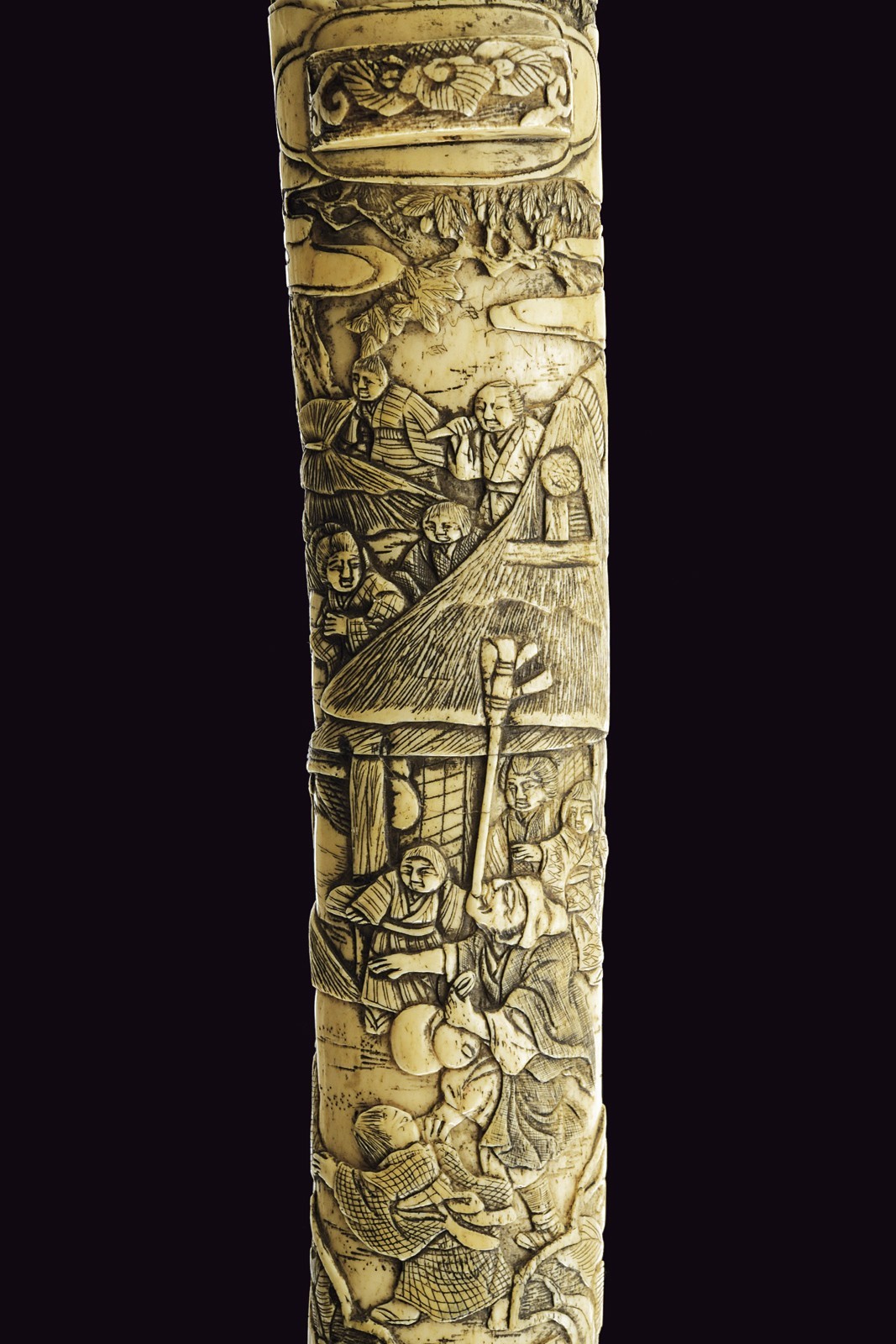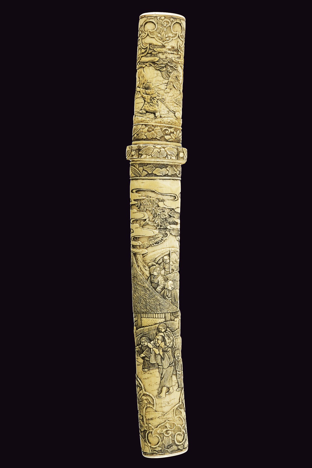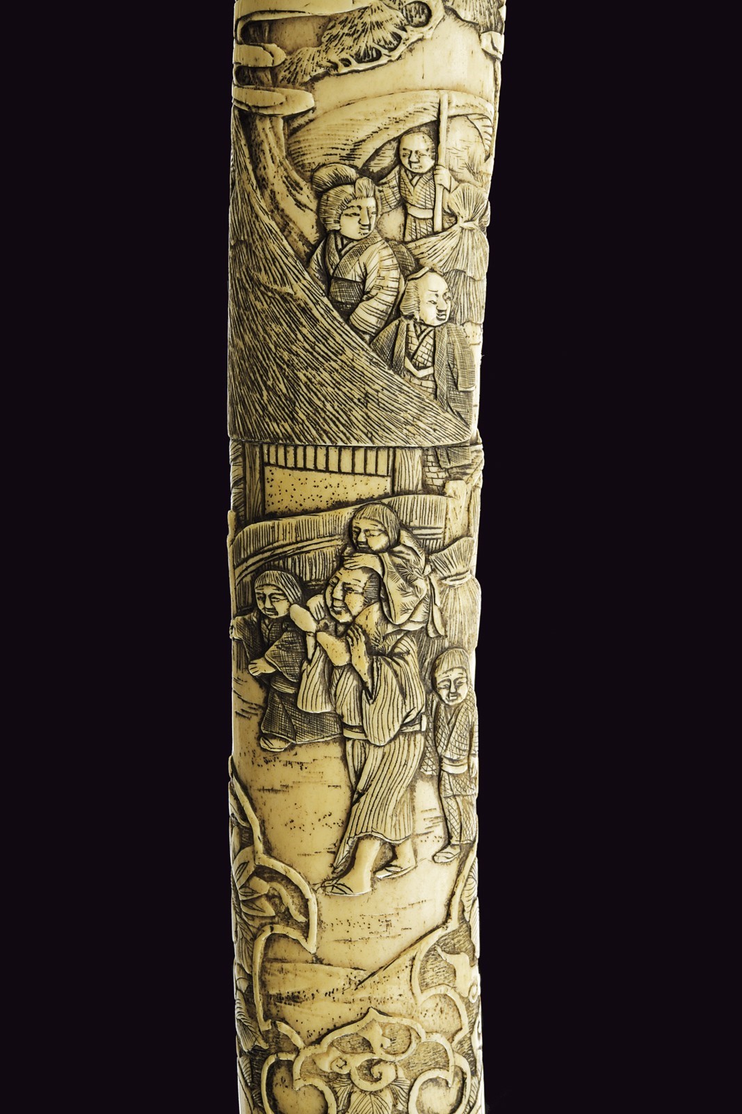 Sturdy, single-edged blade with brass habaki. Grip and scabbard made of bone, completely carved with countless figures, a house, trees, clouds and floral motifs in bas-relief. Good quality.