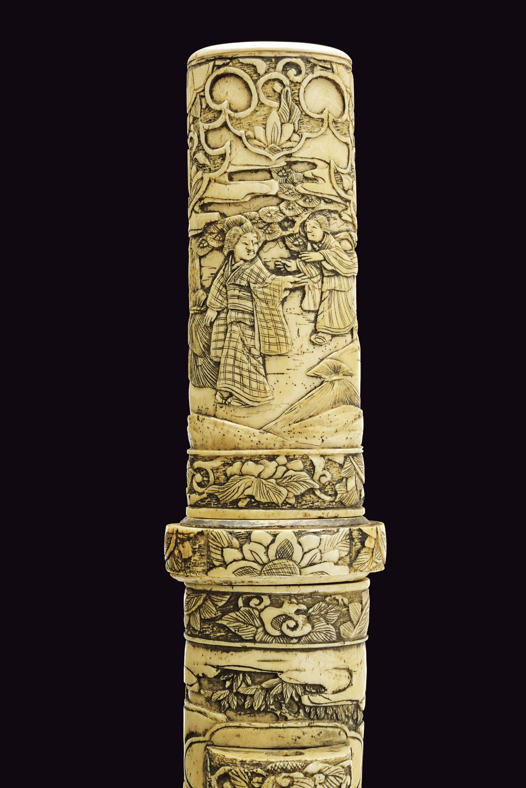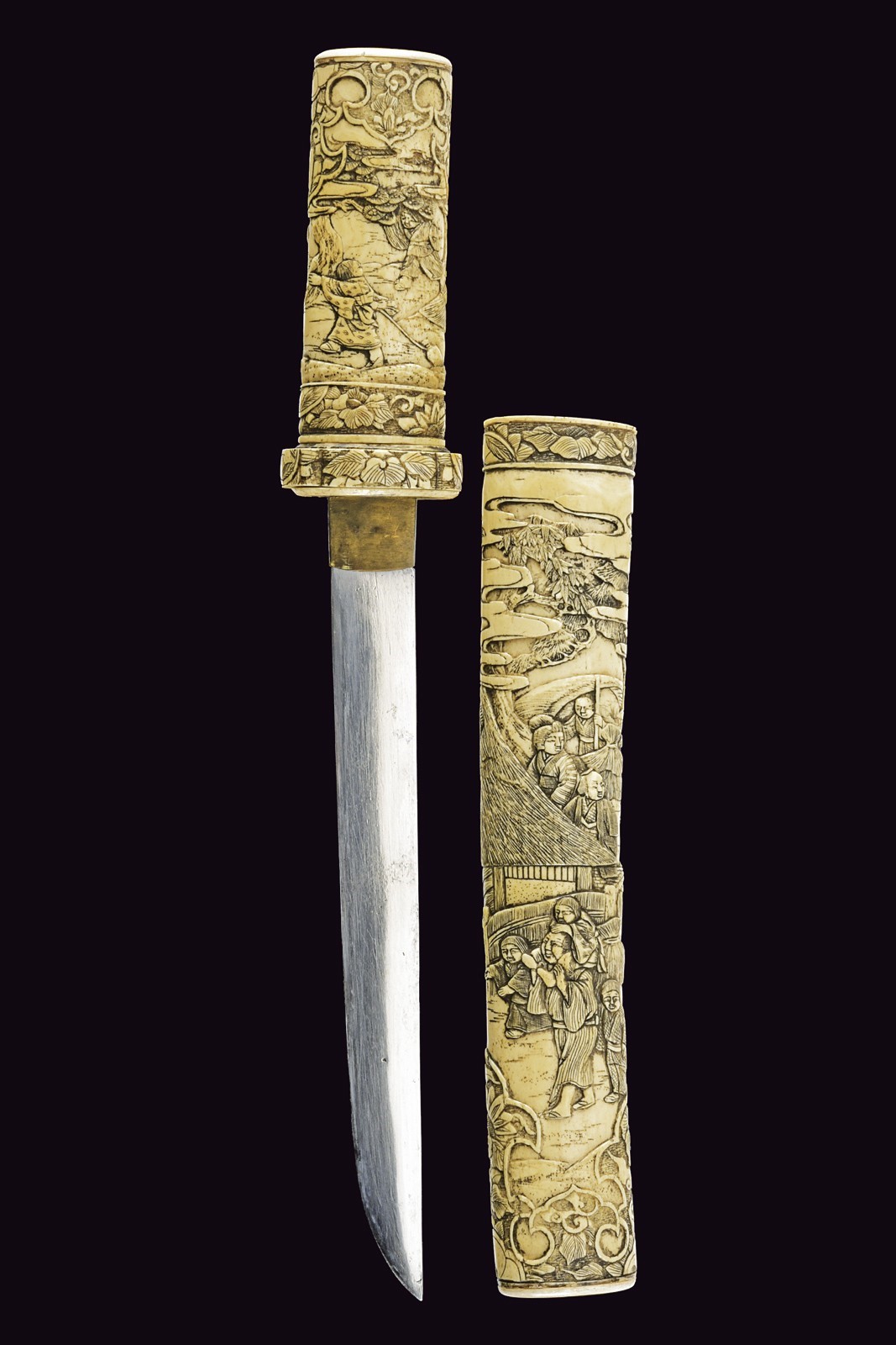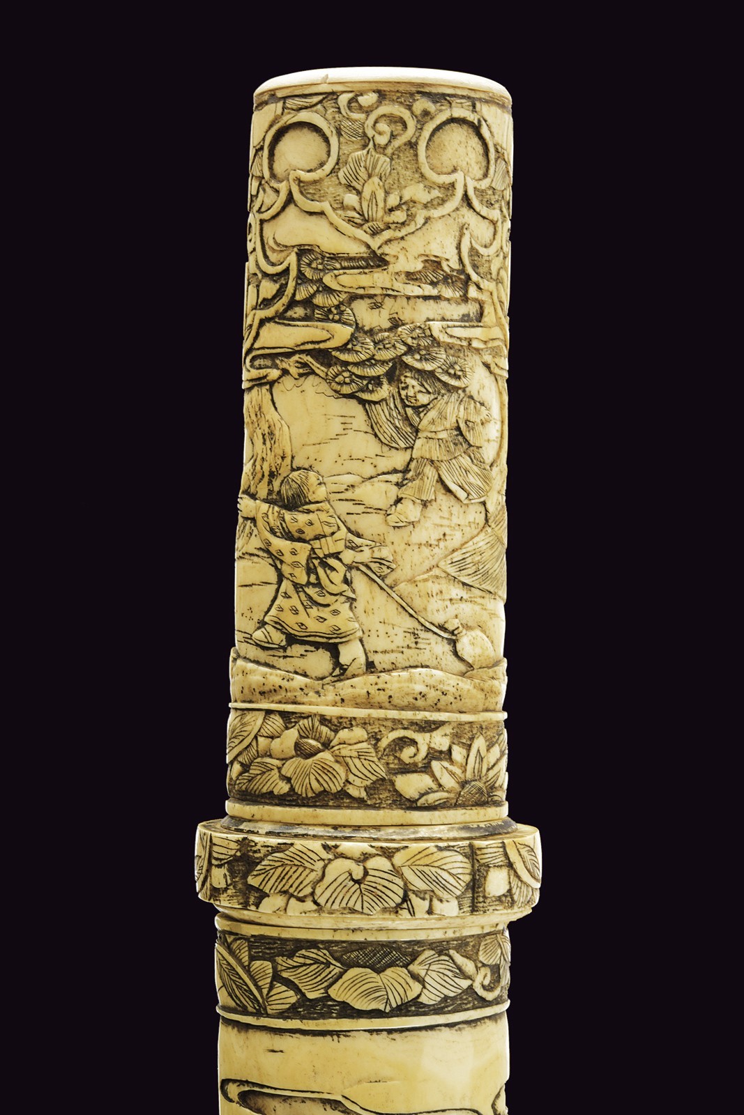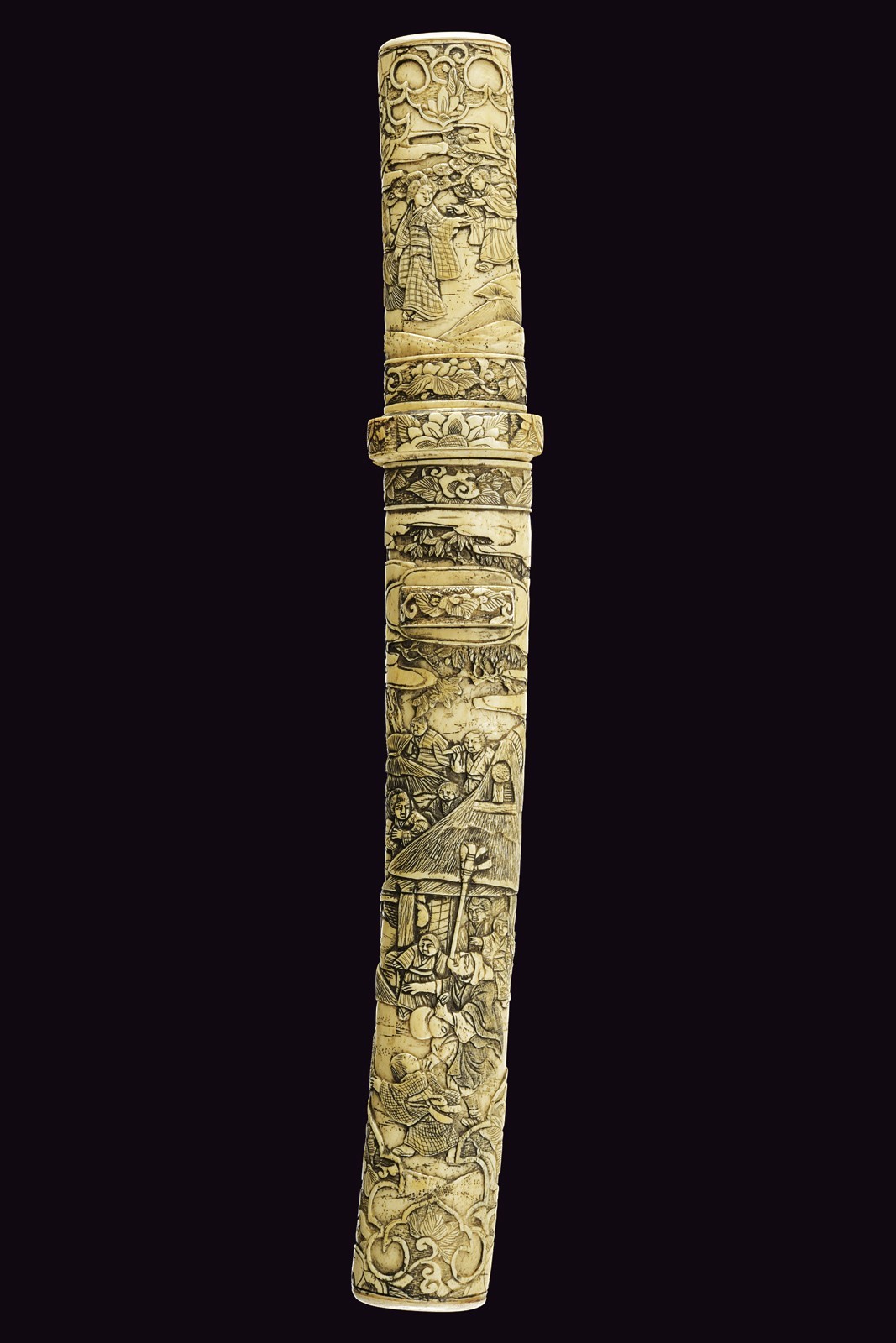Sturdy, single-edged blade with brass habaki. Grip and scabbard made of bone, completely carved with countless figures, a house, trees, clouds and floral motifs in bas-relief. Good quality.