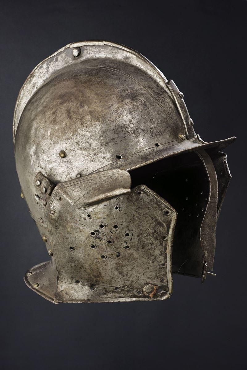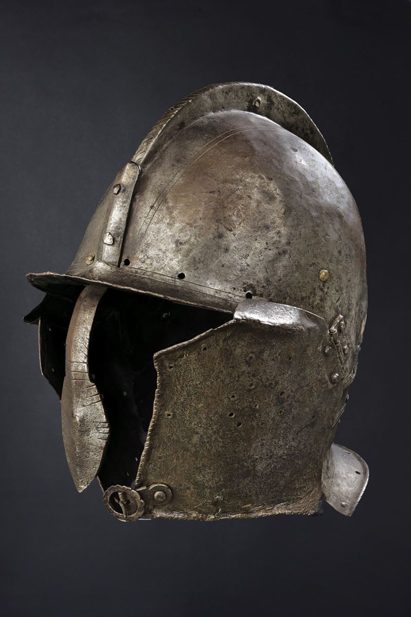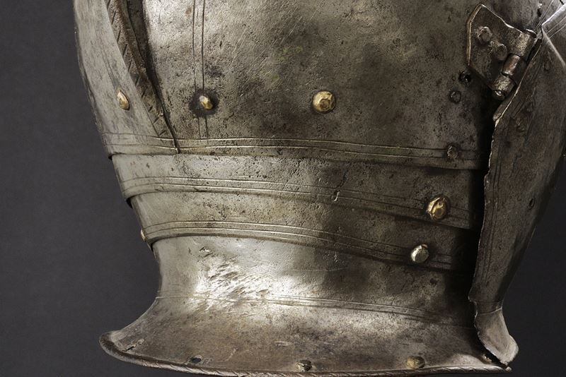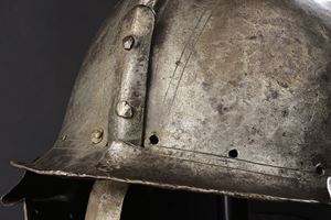 Skull, comb and brim divided into two halves riveted together; the crest and the brim are roped, traces of marking on the brim. The skull is extended with a three-plated nape-guard, the last plate is also moulded and bordered in the usual way. Hinged cheekpieces, each with a rosette of nine holes, strongly pressed to fit the brim. At the front, the typical nosepiece, originally sliding across a ring guard (now missing), fixed here by rivets.