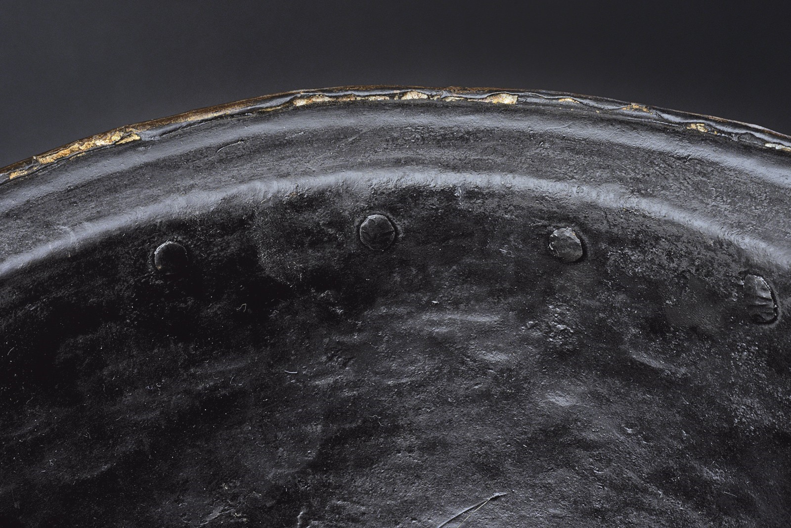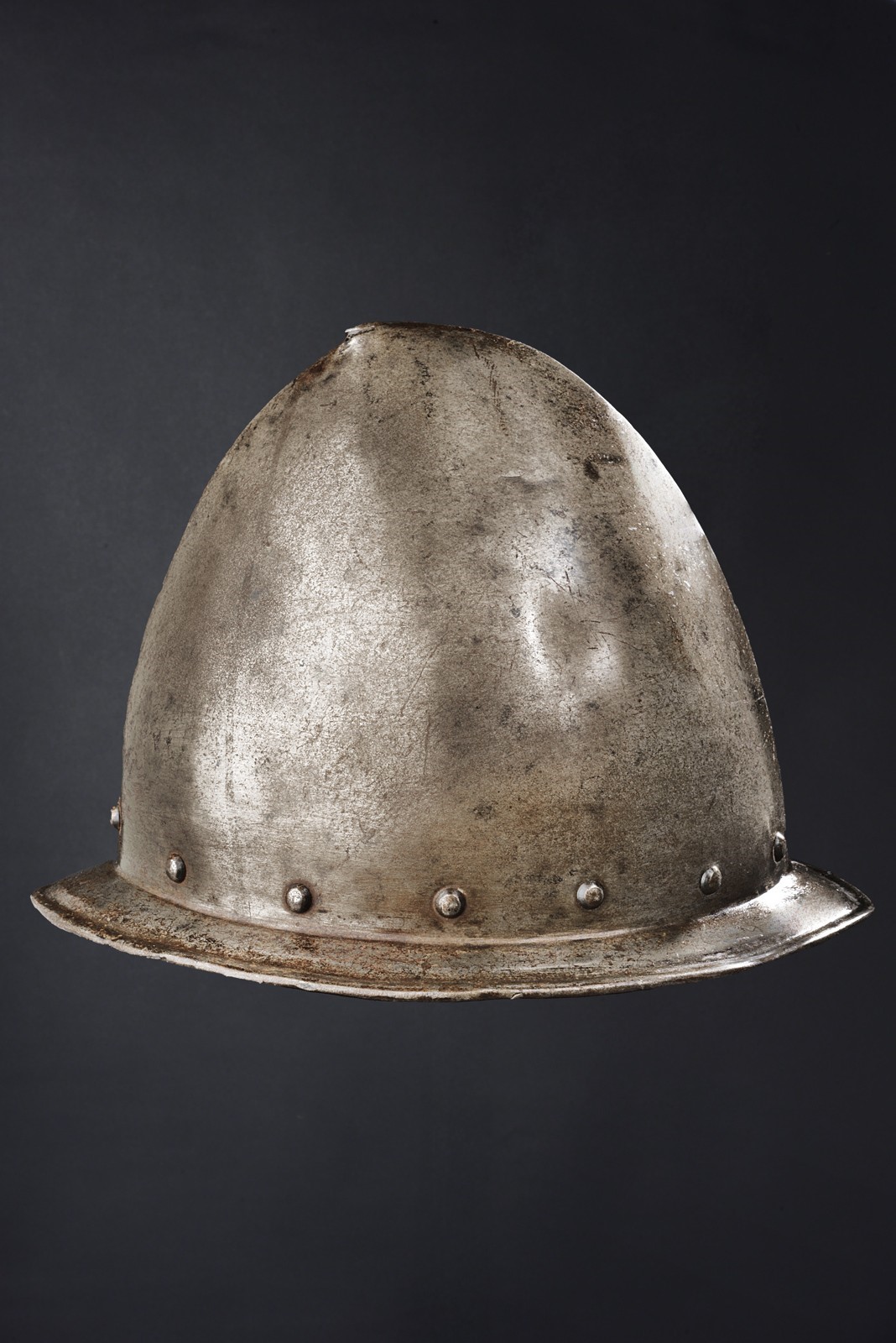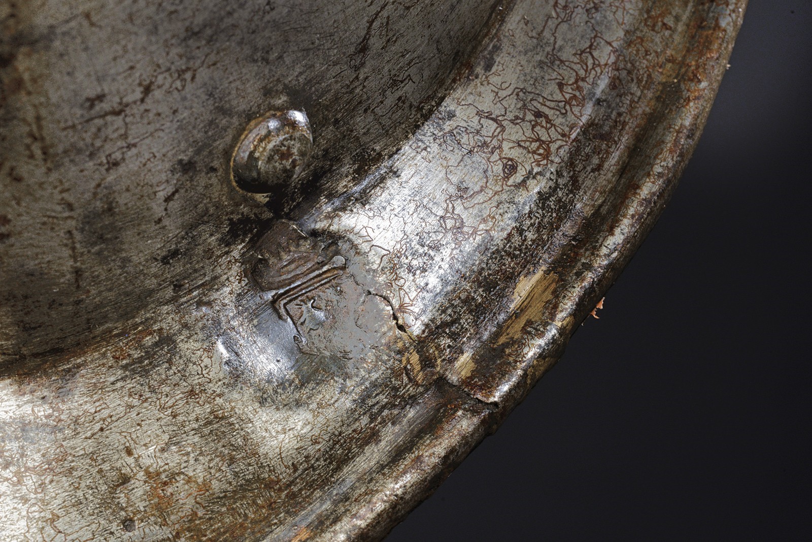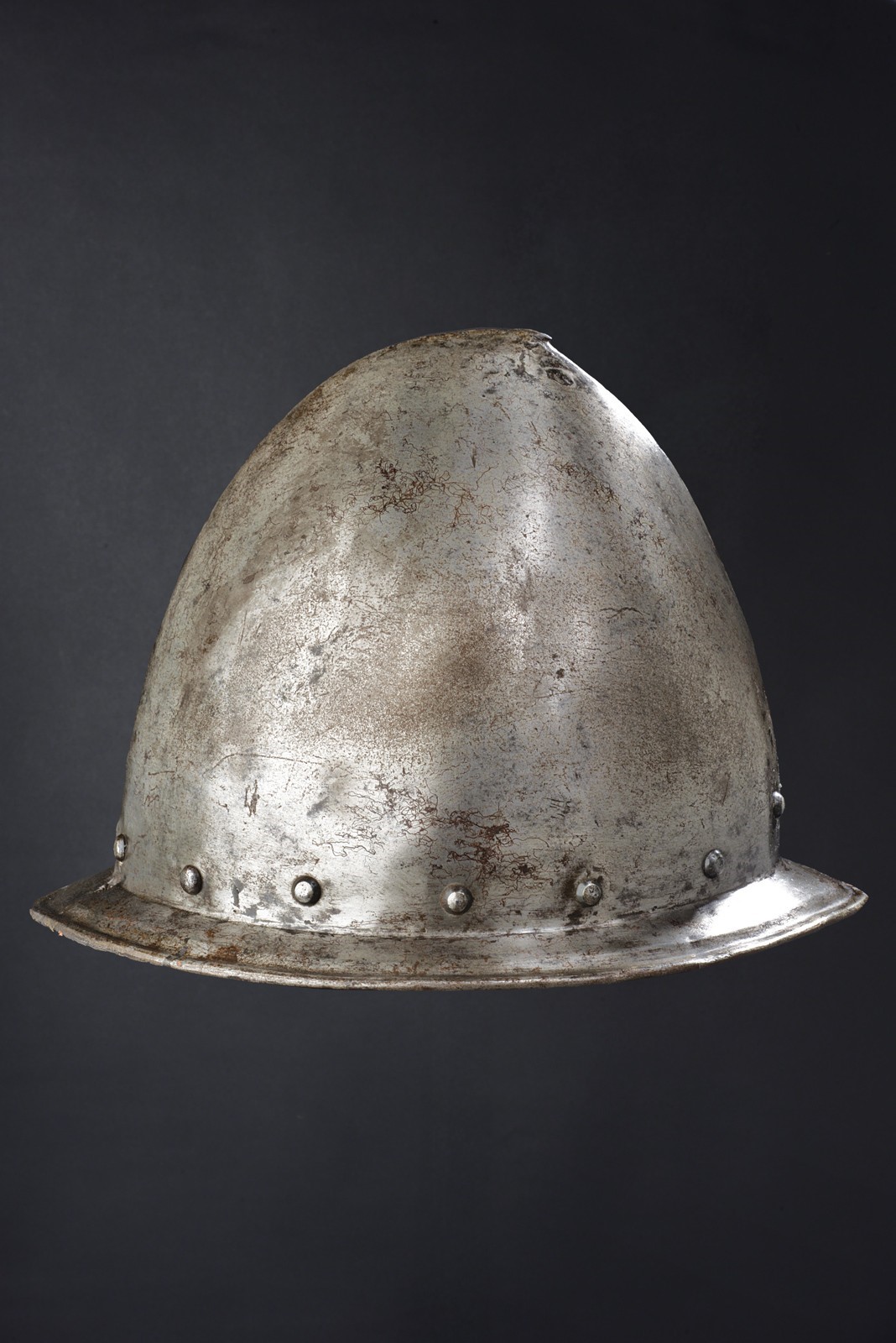 Made of iron, ogival skull with a hint of a curved peak; iron rivets around the base. Slightly sloping brim with a hollow close to the smooth, turned-up border. On the front, the crowned "Armi Barberini" mark (Samnite shield crowned and surmounted by three bees). The interior is painted black.