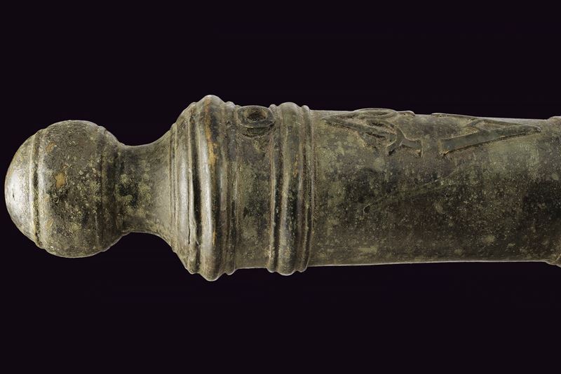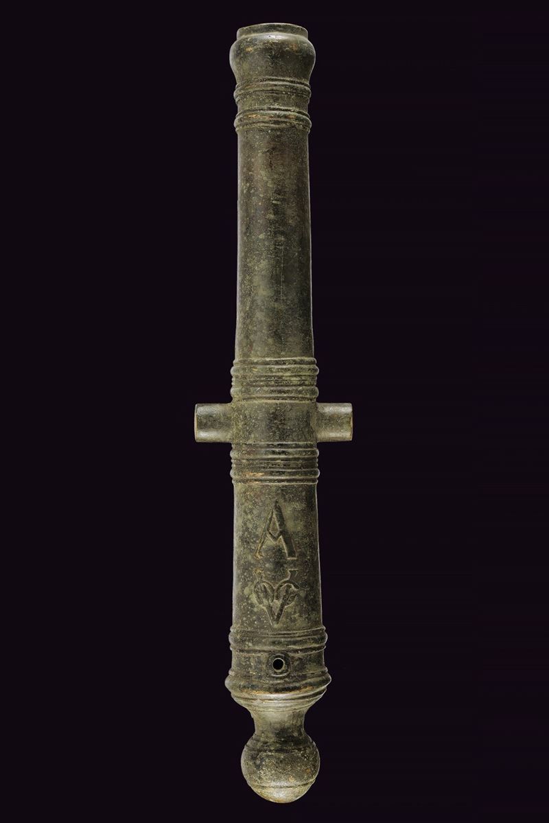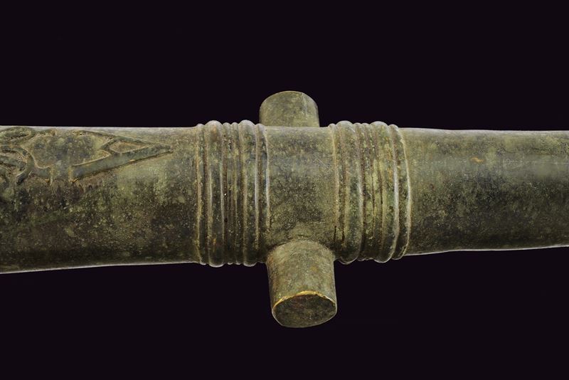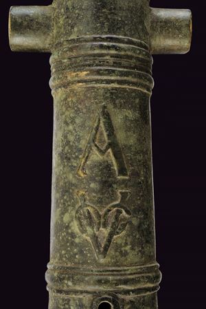 Bronze, shaft decorated with various rings, at the base the monogram of the Dutch East India Company "VOC", above them an "A". Cylindrical trunnions. Moulded muzzle. Vent and spherical breech knob; also with two rings. Signs of time.