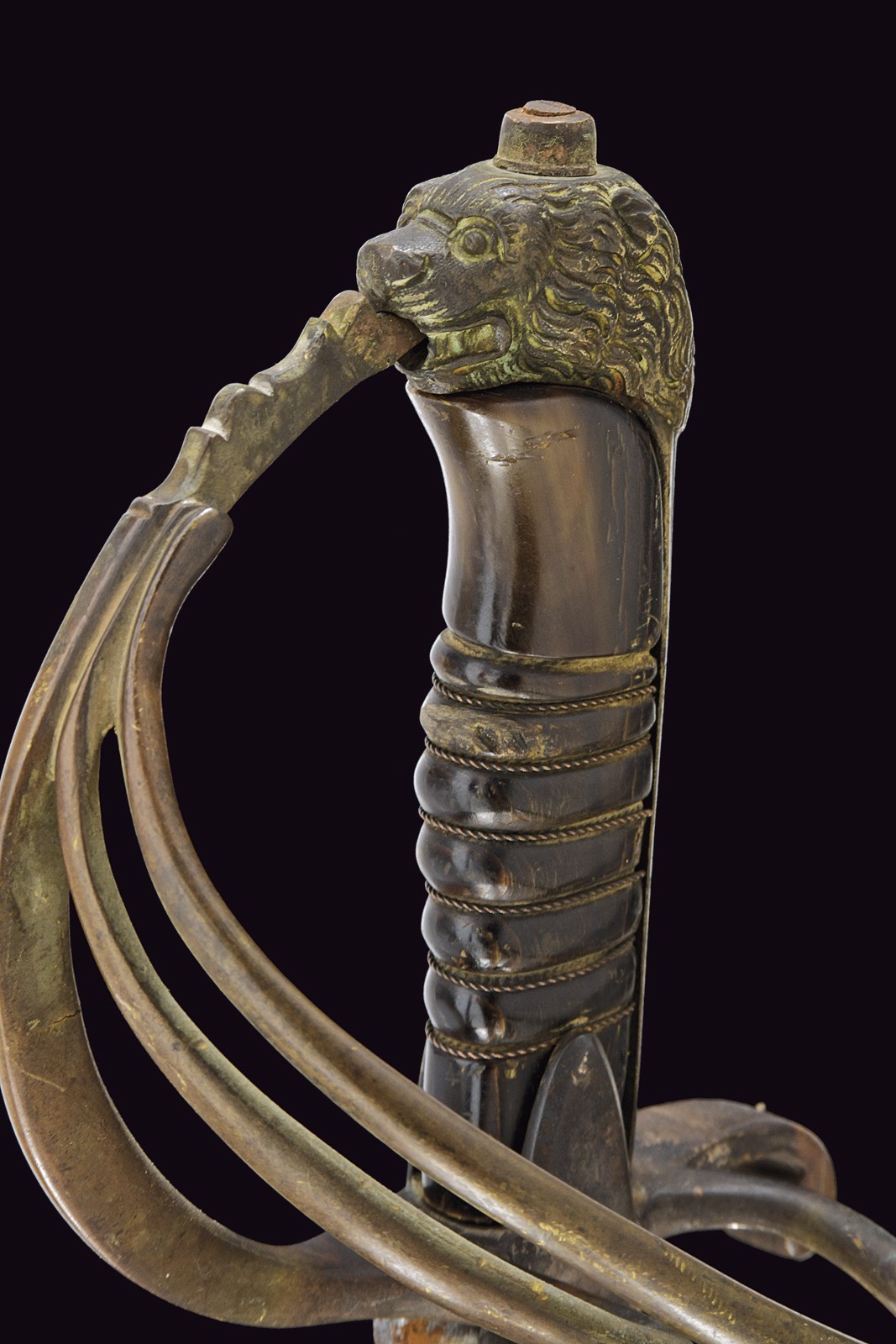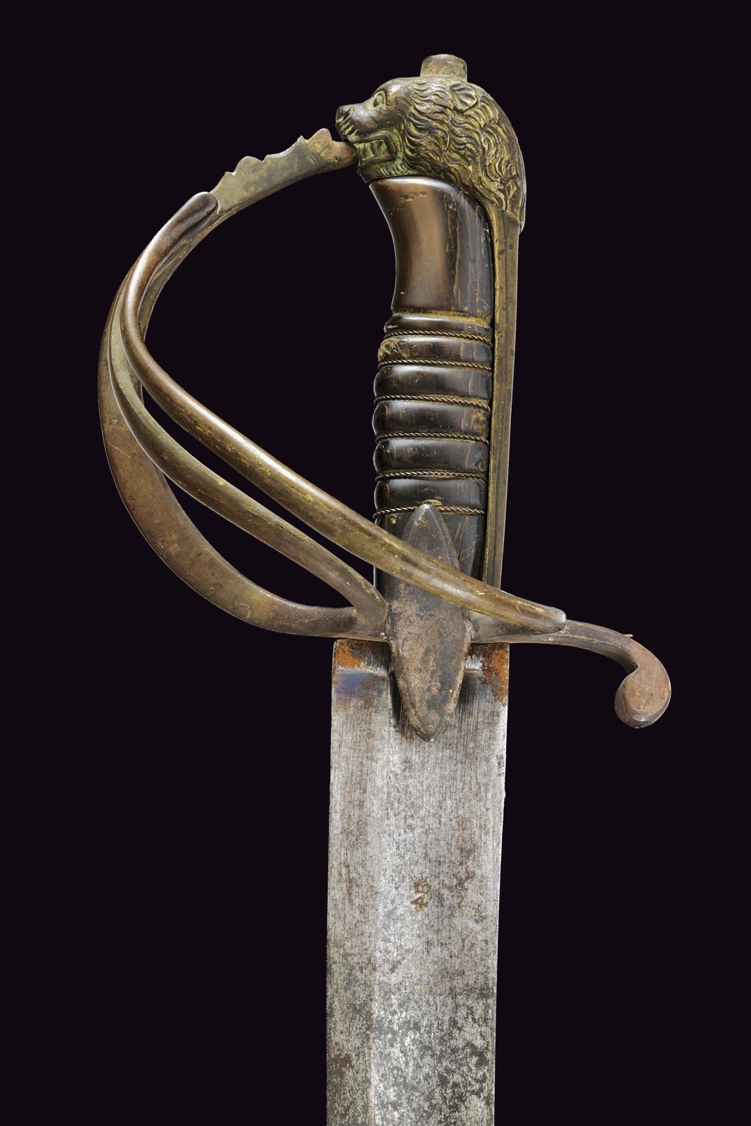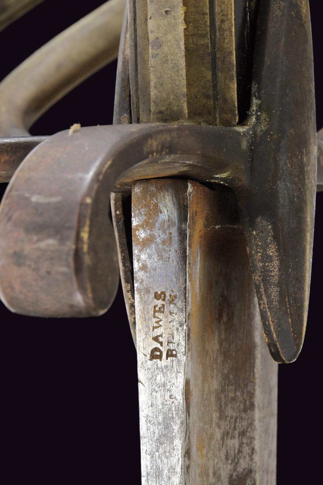Wide, curved, single-and short false-edged blade, with fuller for most of its length, bearing a British military inspection mark (crowned “4”) on the forte and stamped “DAWES B…MN” on the spine. Brass hilt with three loop guards, in patina, langets with ogival outline. Dark horn handle with remains of copper wire binding. Long cap ending in a lion's head. Missing scabbard. Some pitting and light play between the blade and the hilt.