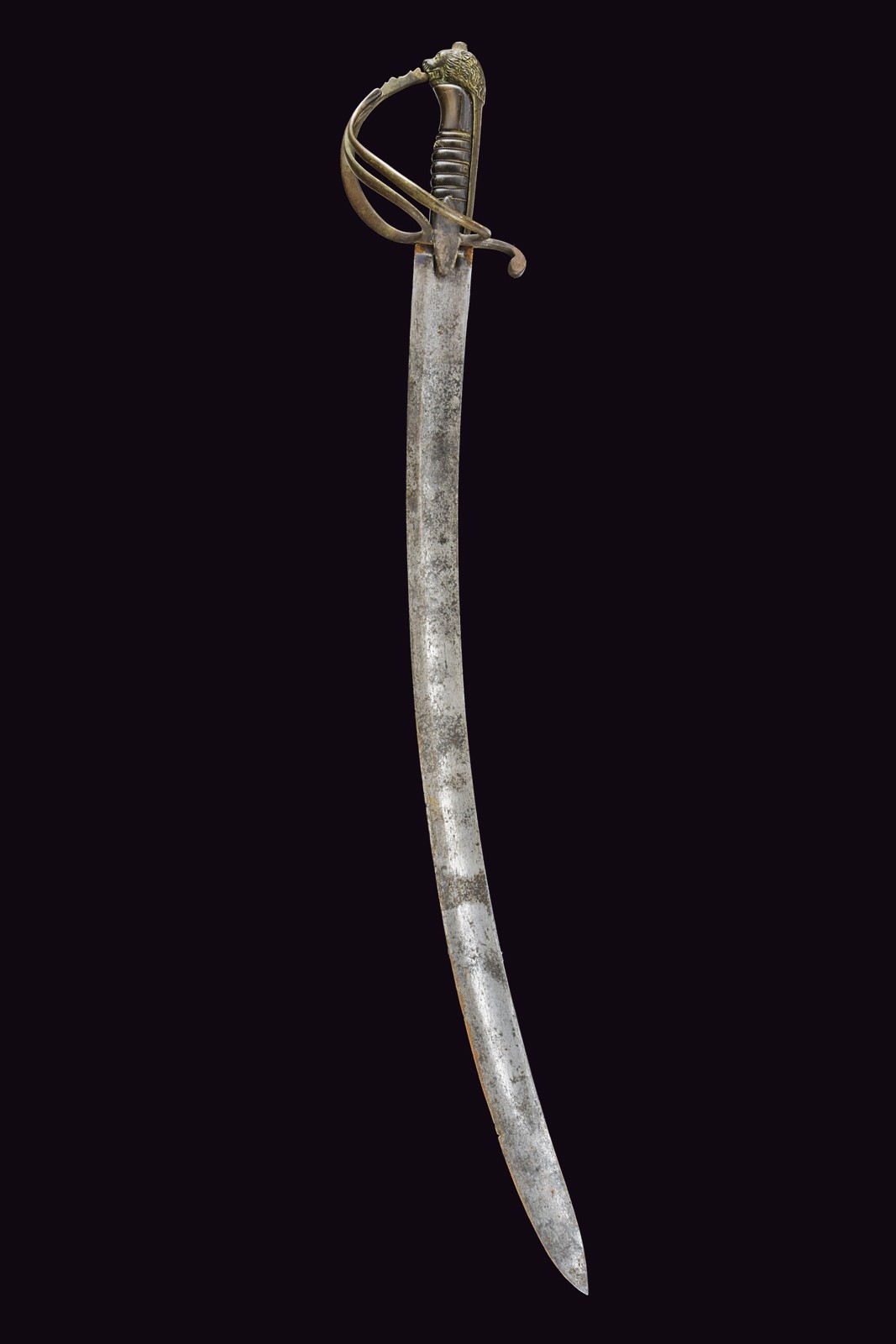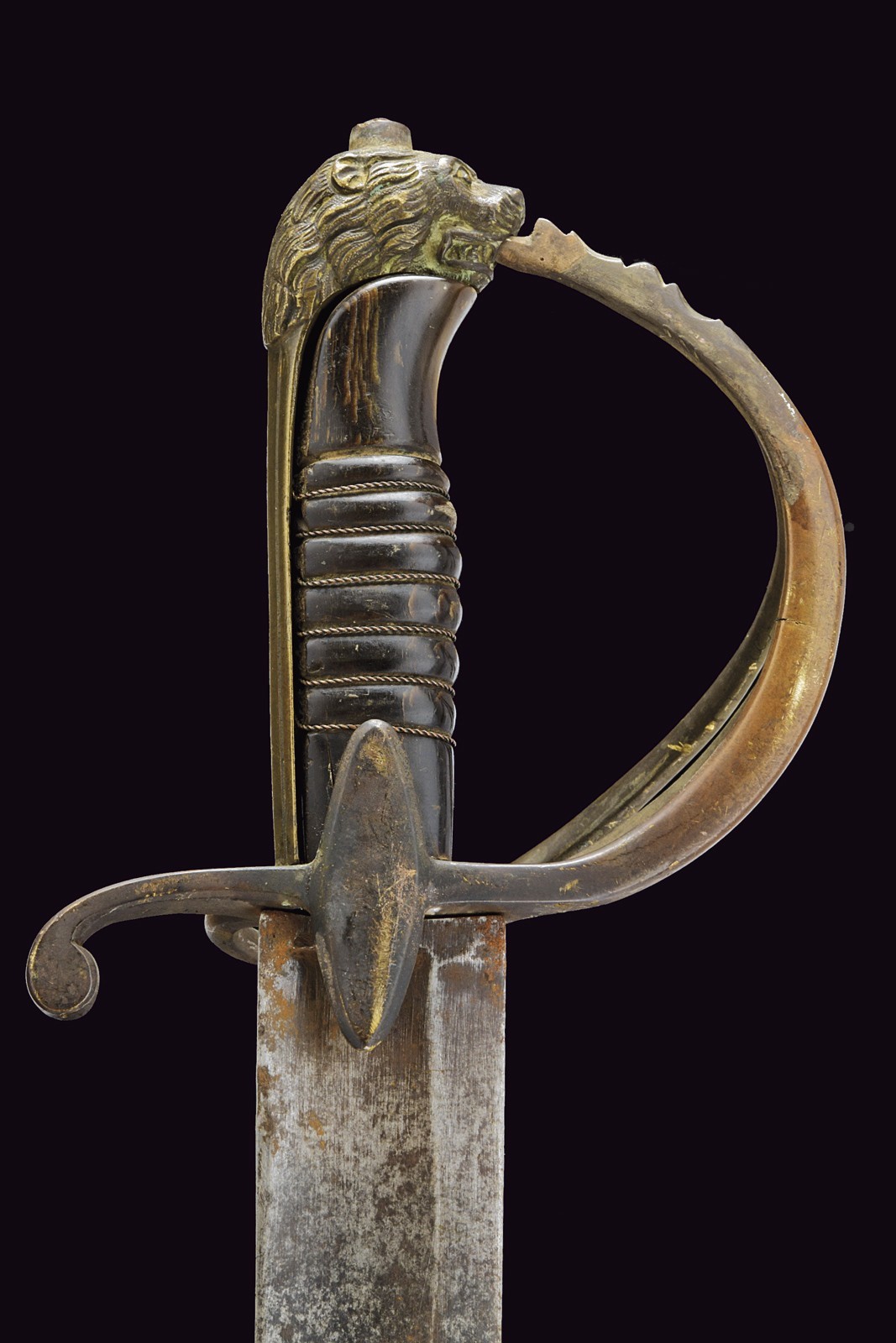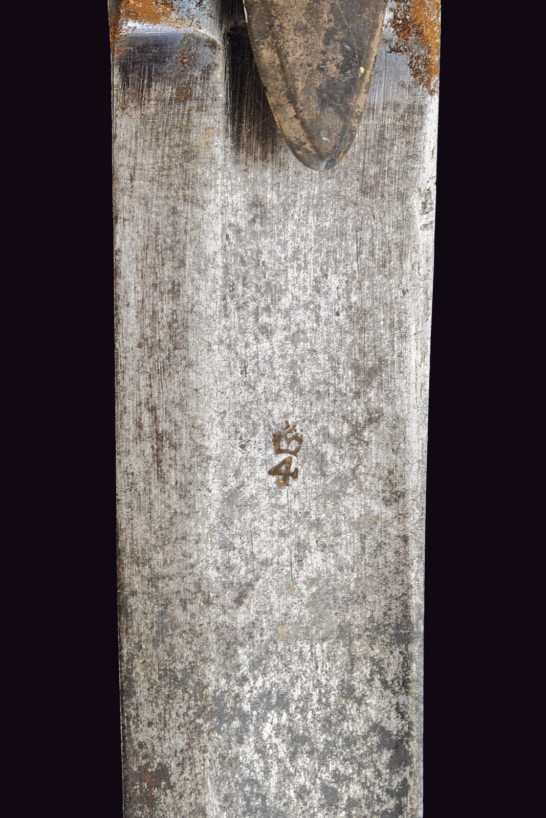 Wide, curved, single-and short false-edged blade, with fuller for most of its length, bearing a British military inspection mark (crowned “4”) on the forte and stamped “DAWES B…MN” on the spine. Brass hilt with three loop guards, in patina, langets with ogival outline. Dark horn handle with remains of copper wire binding. Long cap ending in a lion's head. Missing scabbard. Some pitting and light play between the blade and the hilt.