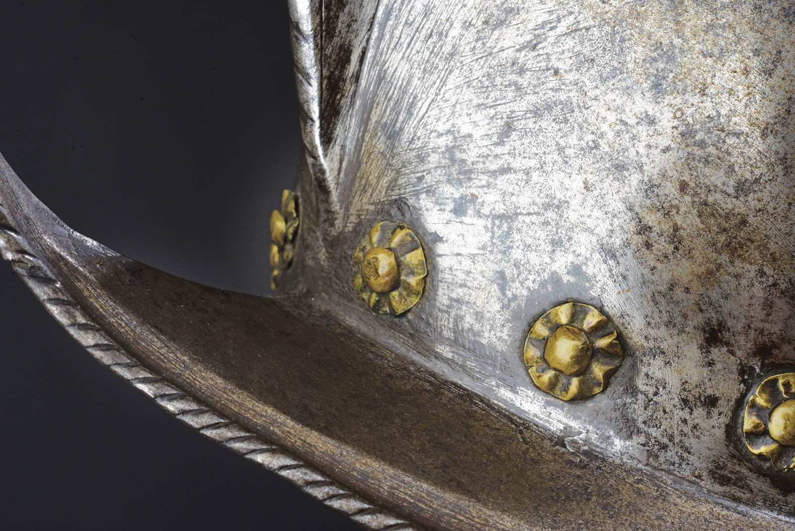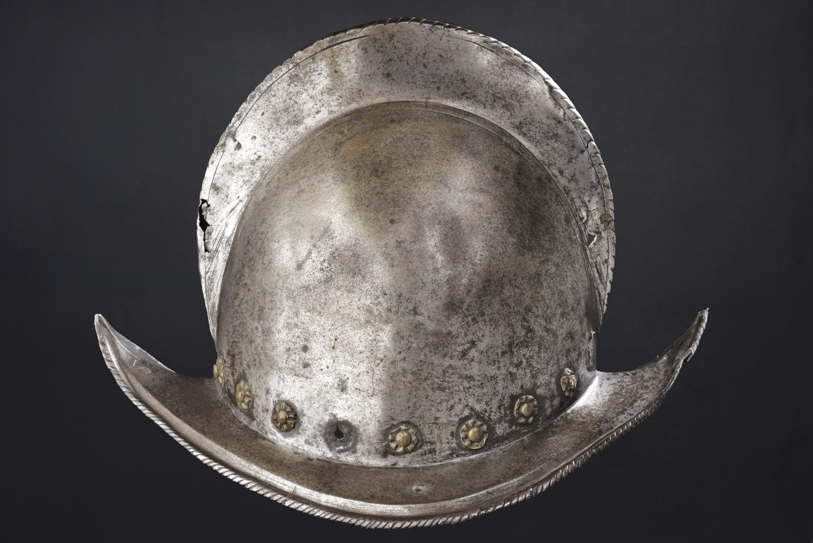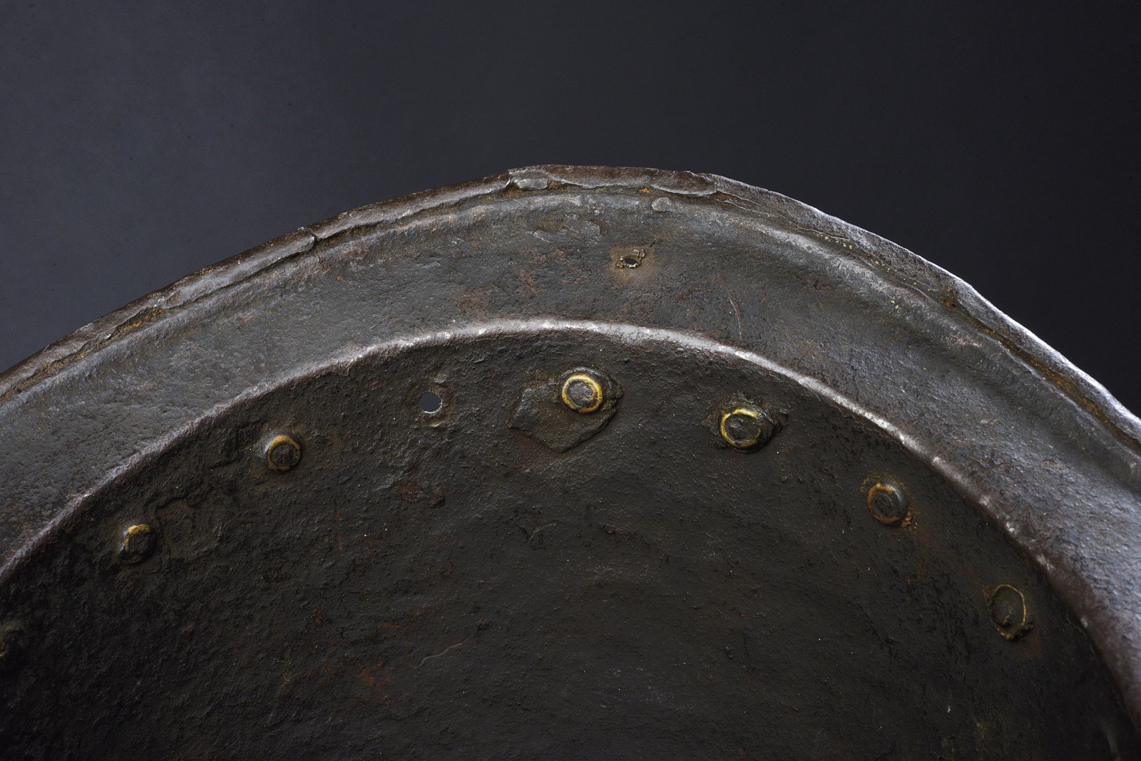 Single-piece iron skull; with a medium roped comb; a row of iron rivets with original brass rosettes (one missing) at the base. Missing leather plume-holder. Rebated boat-shaped brim and roped border;inside, remains of a fabric lace for fastening the inner lining (now missing). Some defects and missing parts.