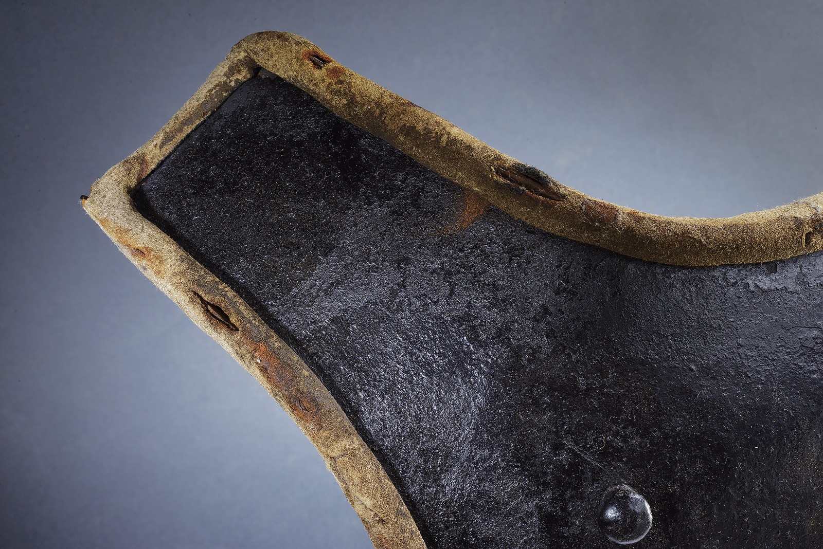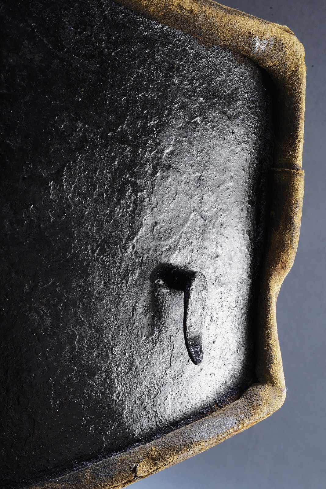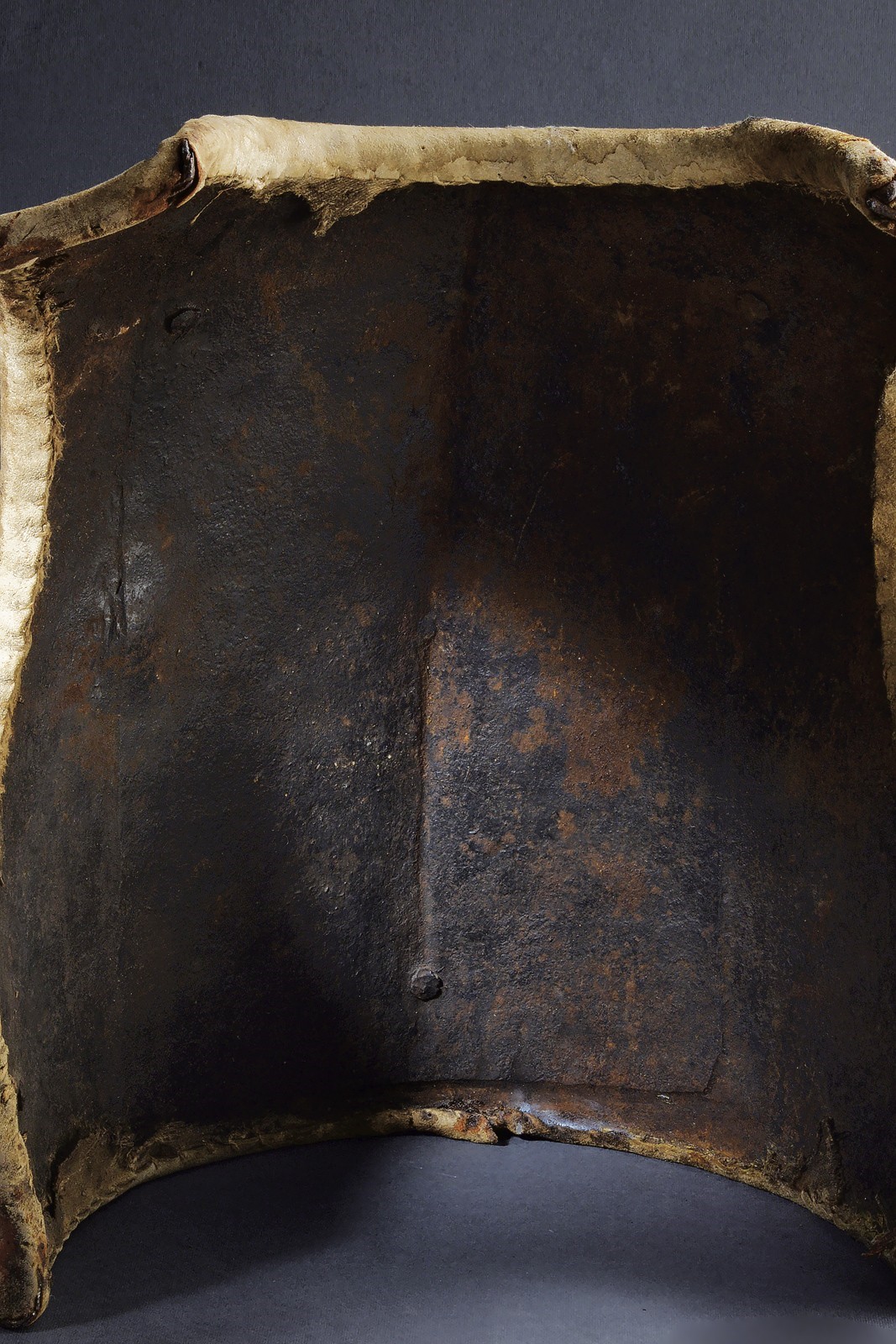 Made of blackened iron, in one piece, ribbed along the centre line; neckline and gusset with raised edge; remains of blow mark; two buttons and two side hooks for fixing the straps. All edges lined in leather, with small remnants of lining. Used by Austrian heavy cavalry in the 18th century. Weight 5.3 kg. Rare.