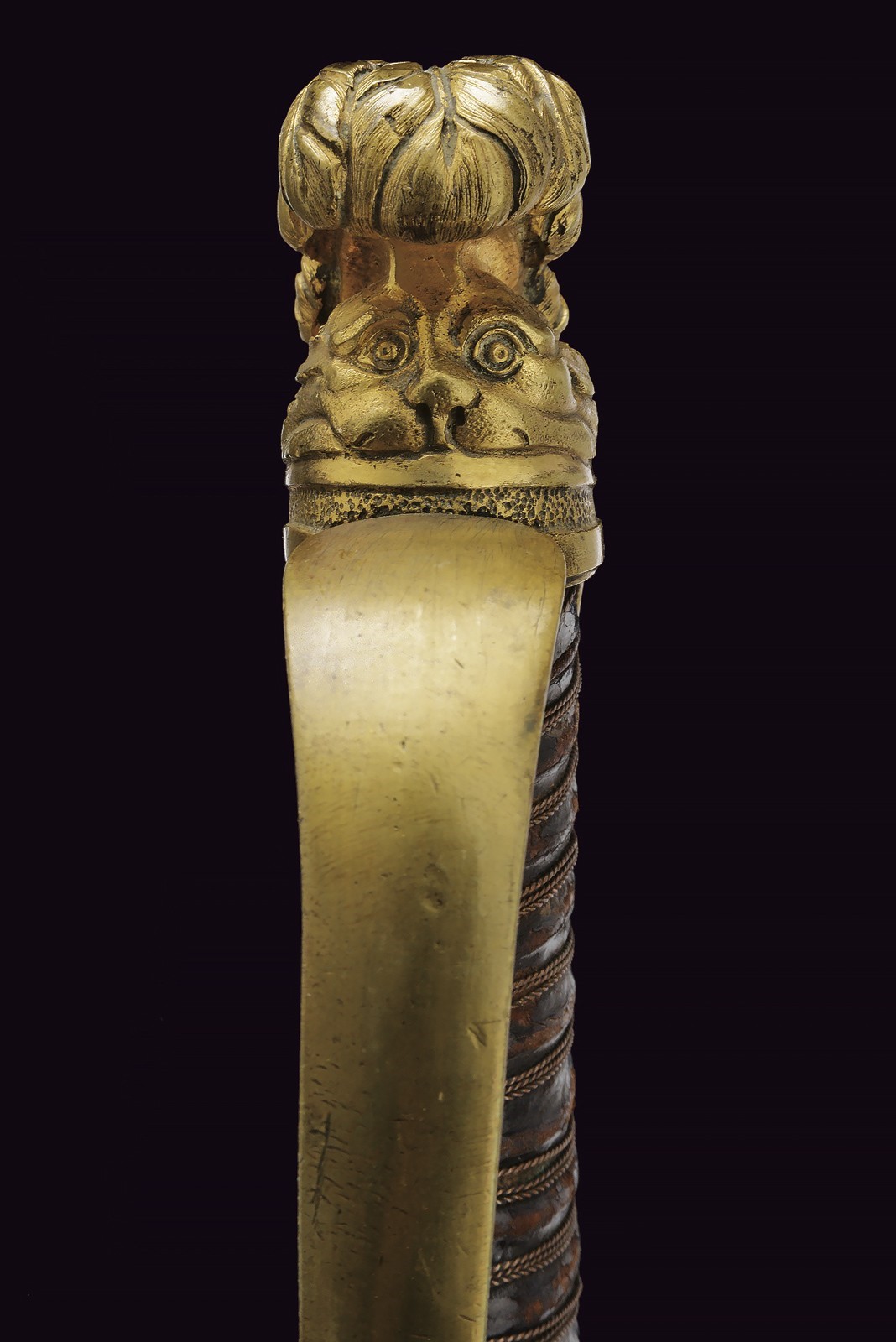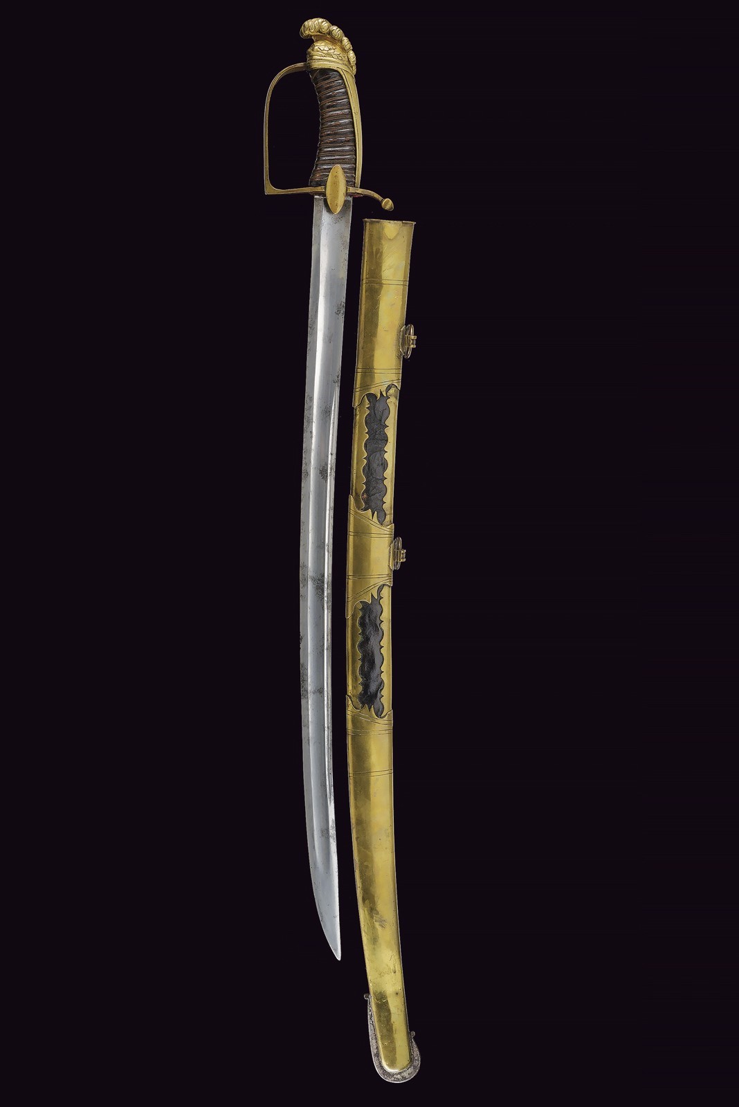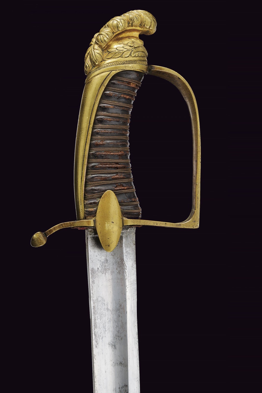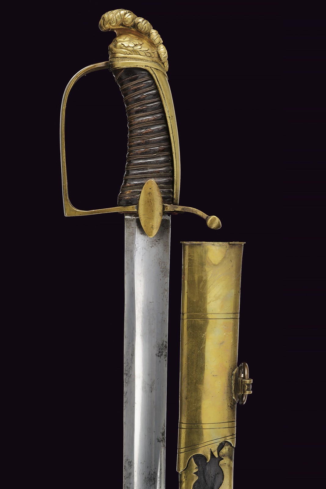 Wide, slightly curved, single-and short false-edged blade, with fuller along most of its length and with a thin groove next to the back in the central segment. Well preserved, with small signs of time. Brass-colored metal hilt featuring traces of gilding. Stirrup guard, slightly curved parry quillon, almost elliptical langets. Long cap ending in a plumed helmet, also with remains of gilding. Handle with leather covering (small missing parts and signs of wear) and copper wire binding. Scabbard with leather almost completely covered by brass mounts. Iron drag. Two lugs. Probably from the imperial period.