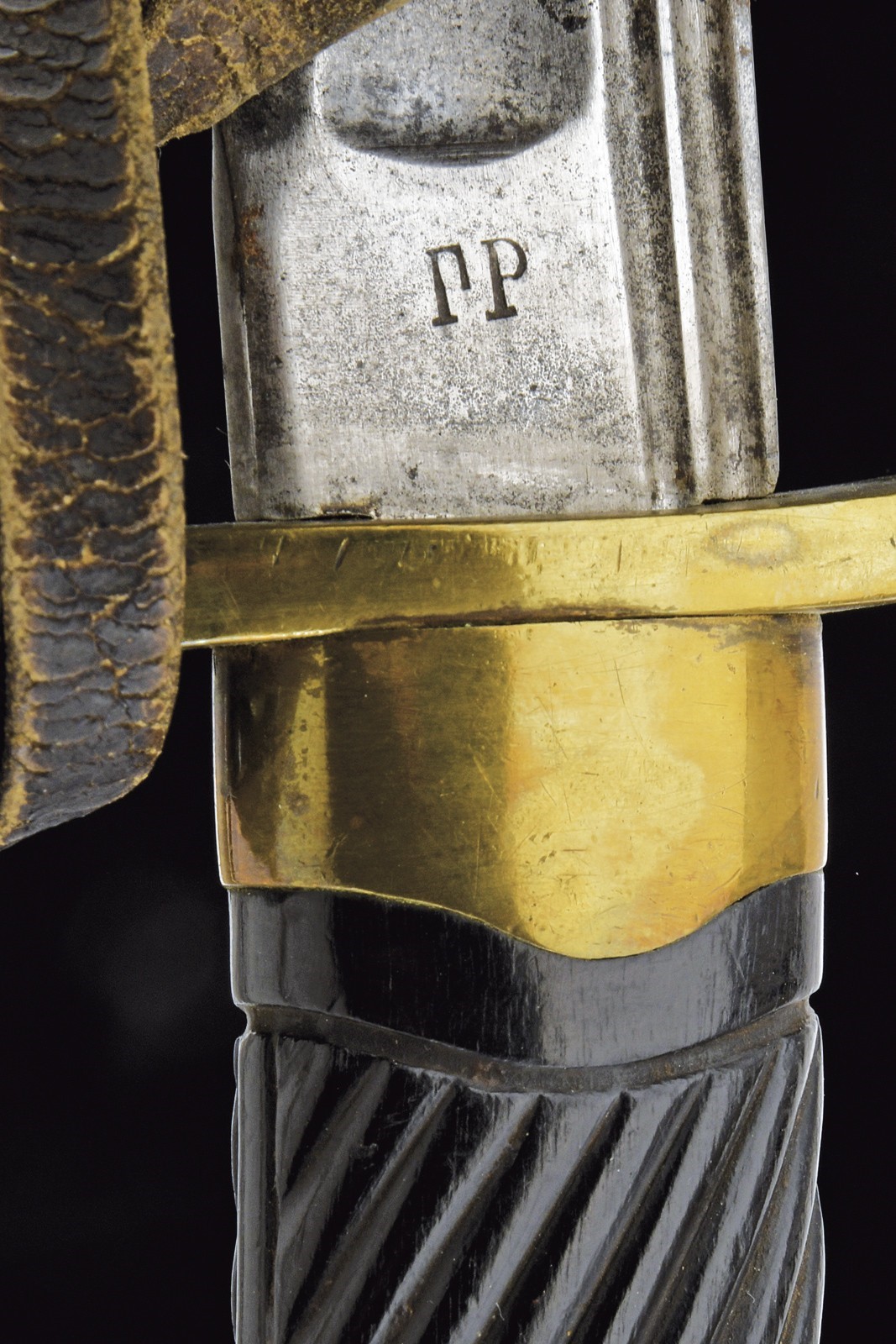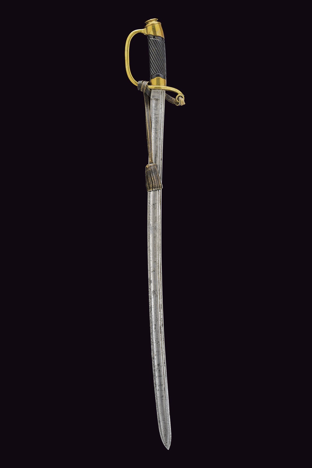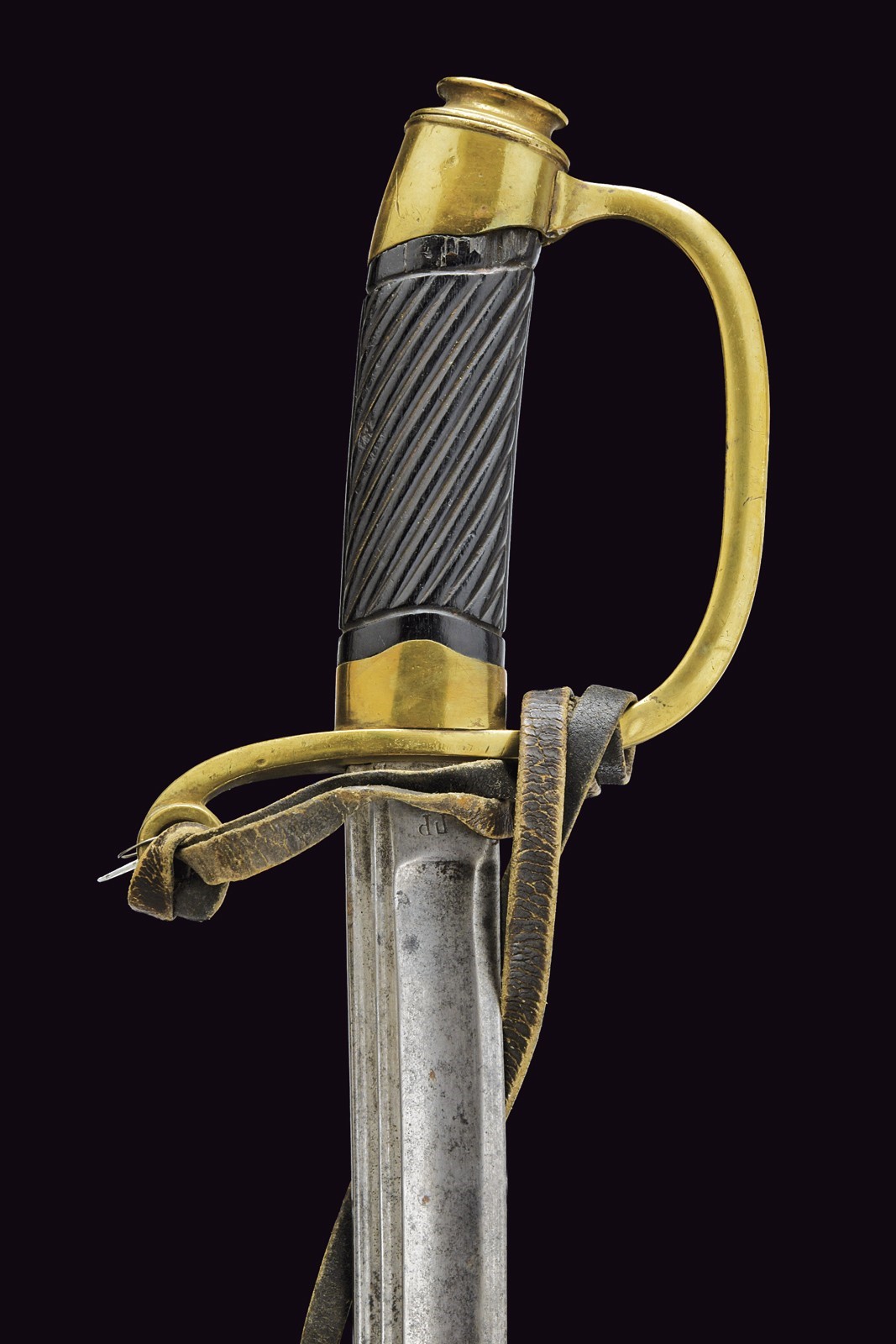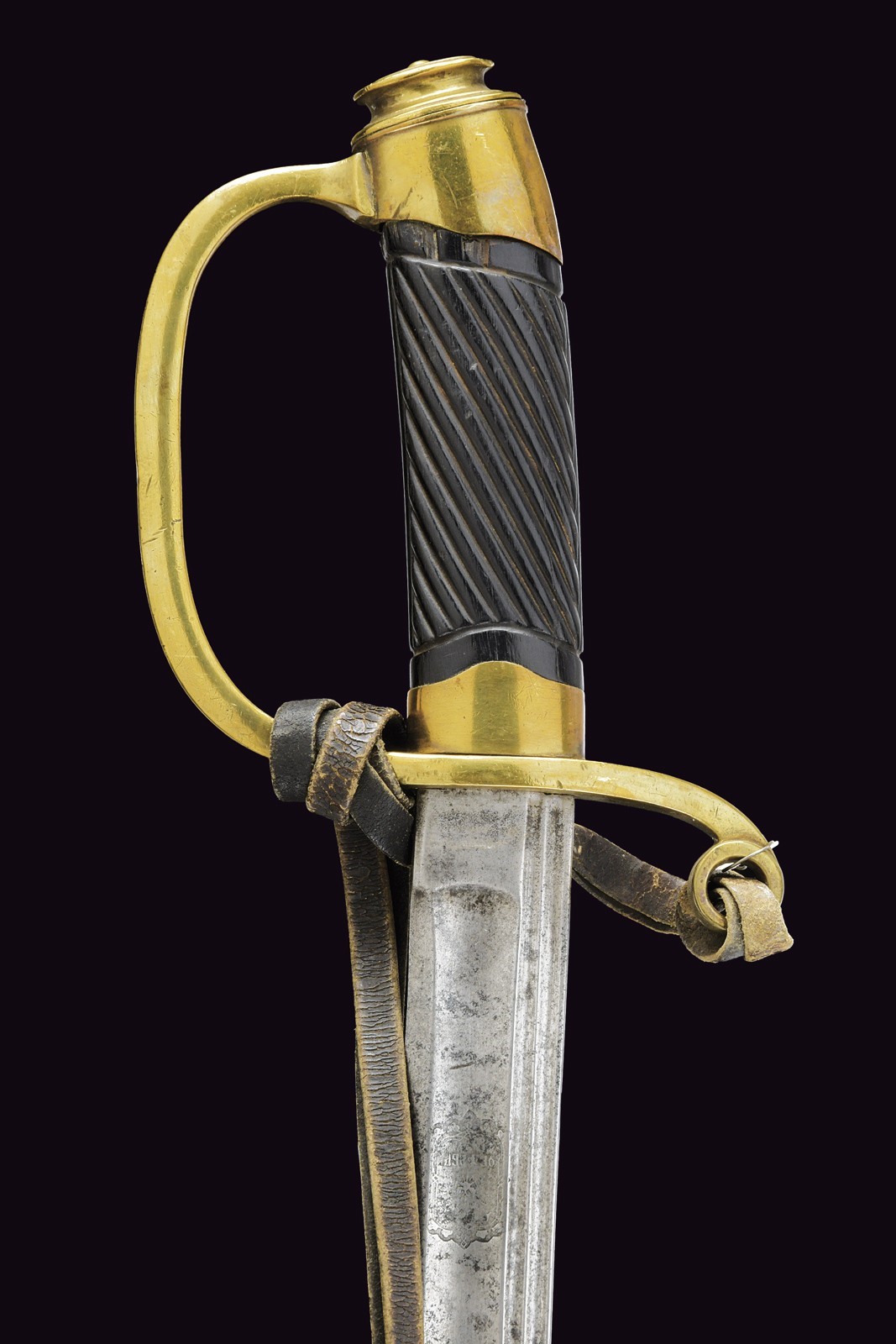 Slightly curved blade, with fuller along the entire length and with a thin double groove near the back; remains of an emblem with a Cyrillic initial at the forte on the right side; on the left side, the initials “GR” also in Cyrillic. Some pitting. One-quillon hilt with a leather sword-knot (signs of use) inserted into the eyelet at the top of the parry quillon. Short cap. Wooden handle with small missing parts. Without scabbard.