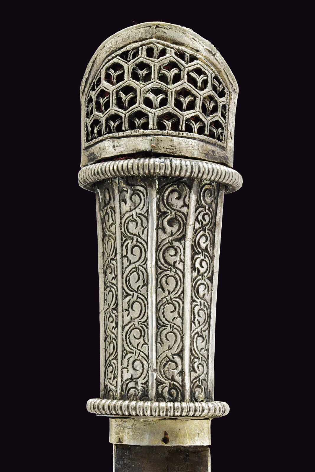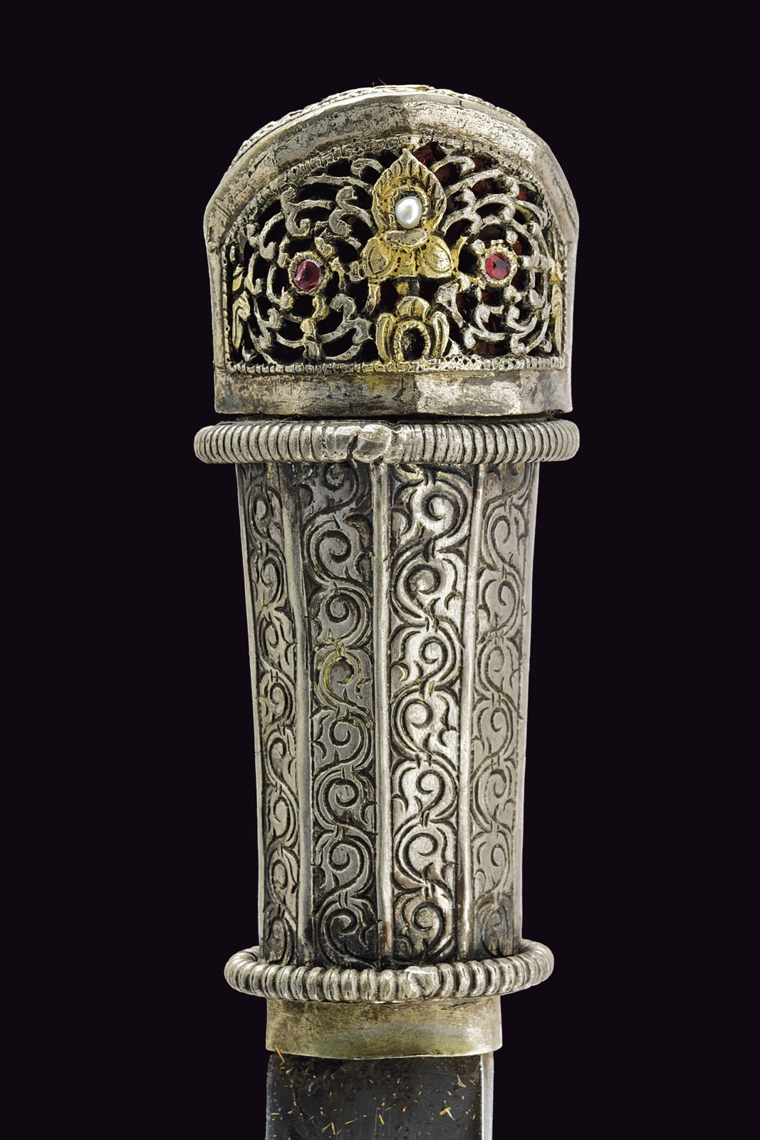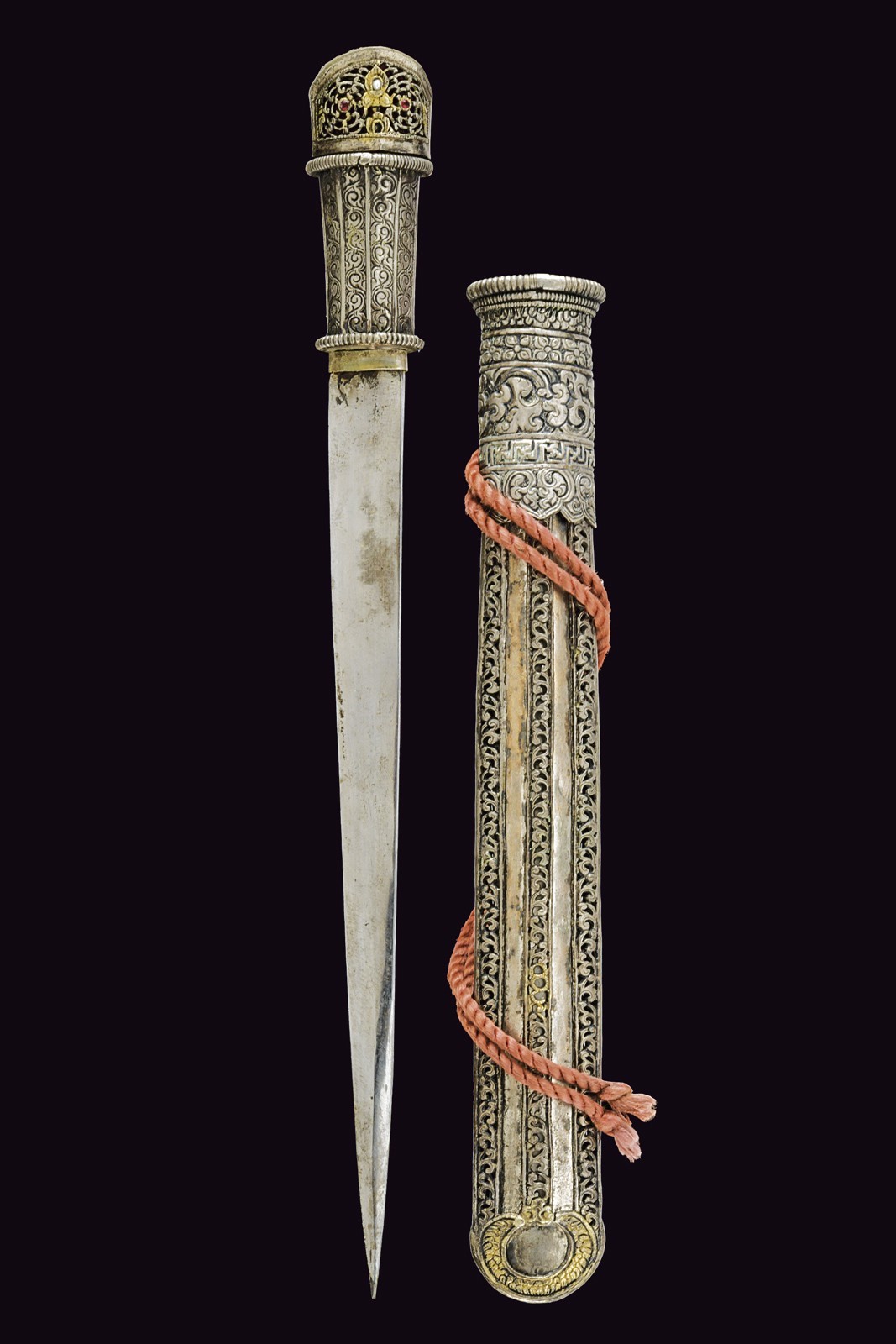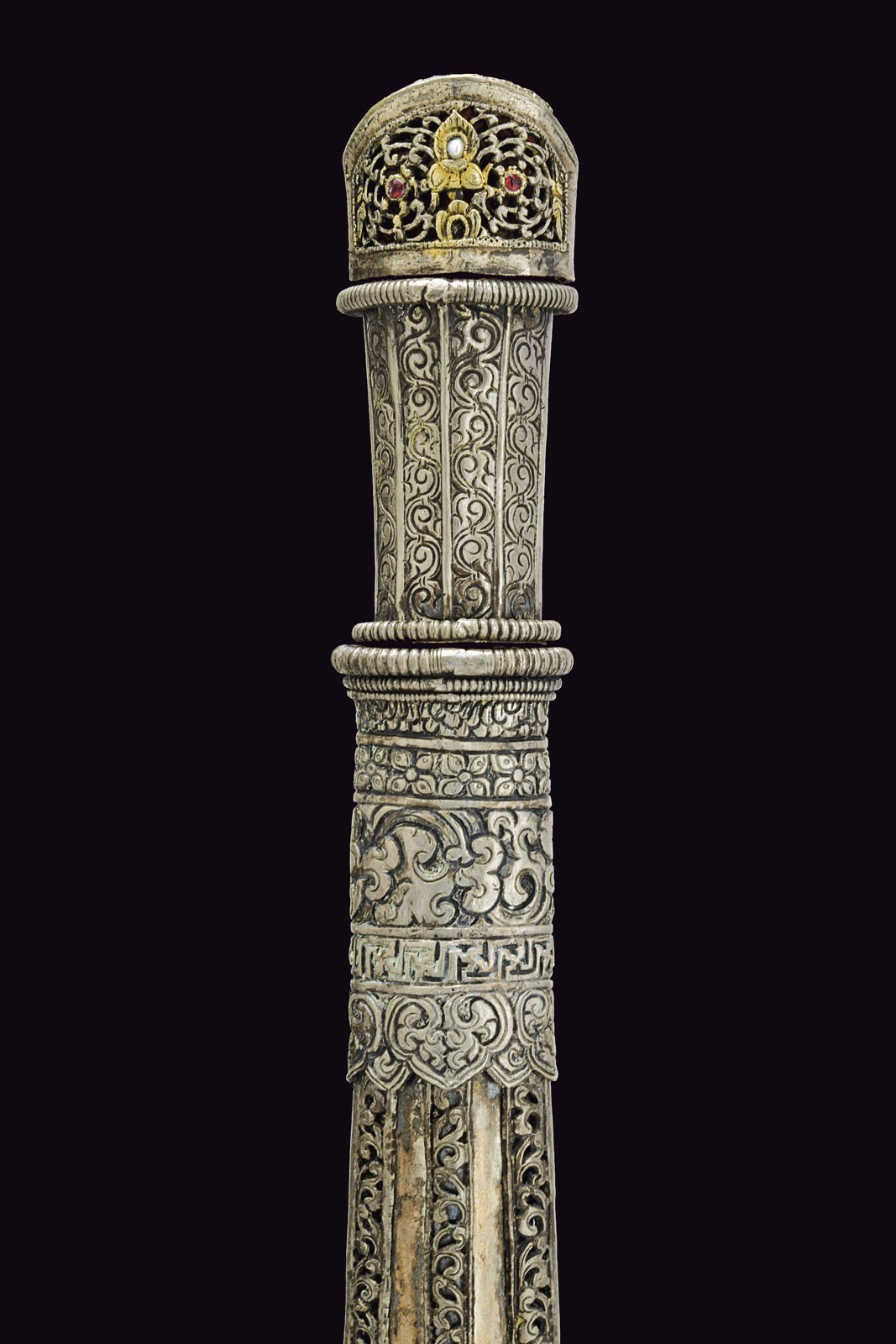 Thick, straight, single-and short false-edged blade. Wooden grip covered in silver foil with a longitudinal stave-like structure decorated with spirals, the upper and lower borders are in relief, prominent, and decorated with a series of rings; beautiful silver-inlaid pommel fretworked and articulated on three sides, two set on the longitudinal plane of the blade and one on the transversal plane; of the two longitudinal ones, the first is decorated with two red semi-precious stones inserted into elements carved with circular spirals, between them a small pearl is placed as face of a gilded figure. The second has an elegant grid carved with hexagonal cells. The face on the transversal plane of the blade features scroll decorations and elements featuring remains of gilding; red lining inside the pommel. The wooden scabbard is completely covered with silver foil, the front part with three bands, two lateral and one central, fretworked and carved with spirals (some remains of gilding); the rear part is en suite but without the central band; the cap decorated with floral and geometric motifs in relief, the mouthpiece part is structured en suite at the ends of the grip. Suspension ring.