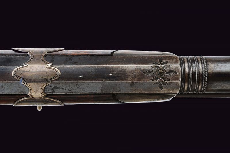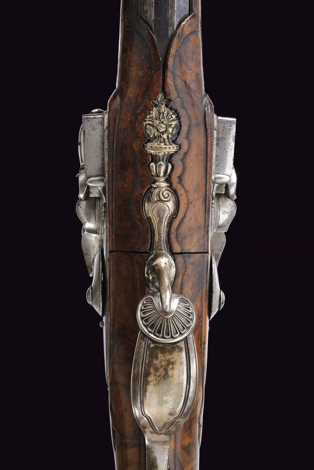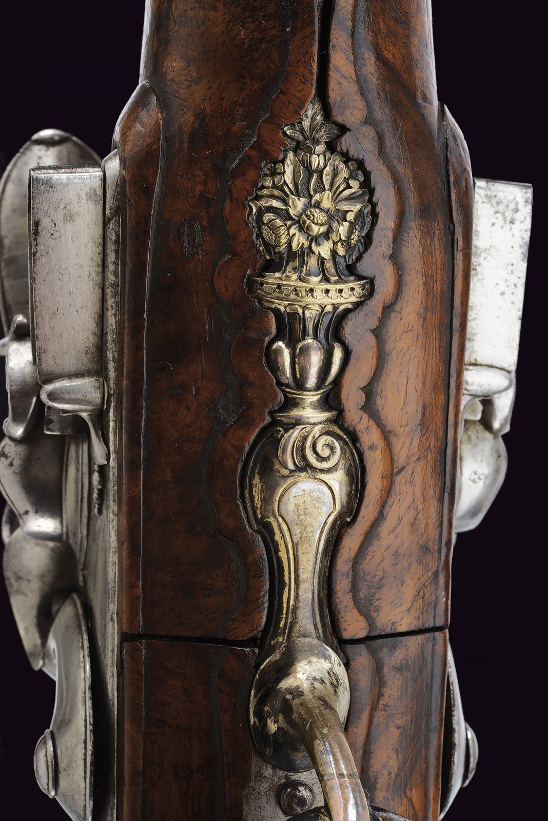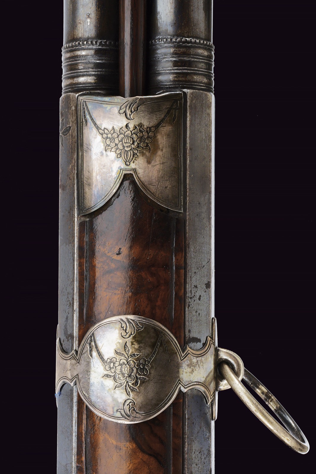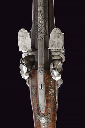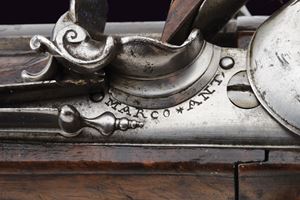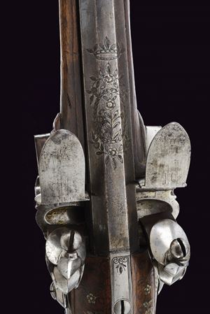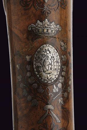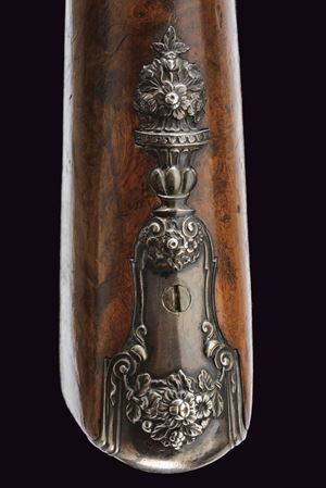 Smoothbore, browned, two-stage, square and round, 15 mm cal. barrels with grooved frames at the girdle, firing chamber engraved with a silver floral motif; dorsal nozzle with silver swallow-tailed foresight. Long tang with outlines and small racemes. Modern locks with rounded lock plates featuring carvings on the pans and related springs; signed in block letters under the pan "MARCO ANTONIO / GIURATI". Short stock of selected walnut, worked in two pieces; decorated with fine floral motifs and silver-inlaid filigree decorations. Engraved and crowned shield on the grip; silver butt plate, chiselled in bas-relief with floral motifs and a gadrooned vase. Silver trigger guard worked in bas-relief. Barrel bracket band provided with lugs and muzzle ring, of silver engraved with floral motifs. Original horn-tipped wooden ramrod.