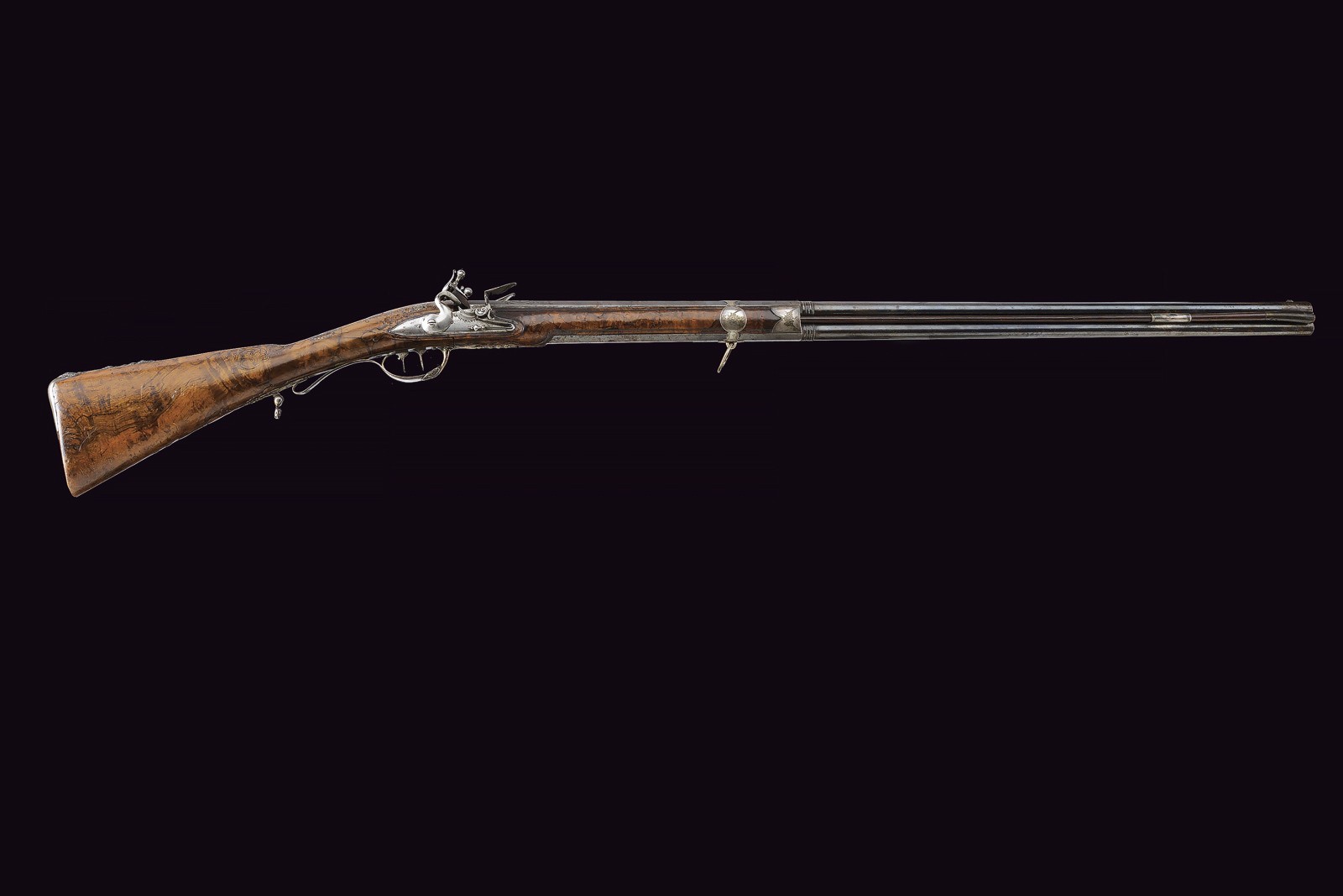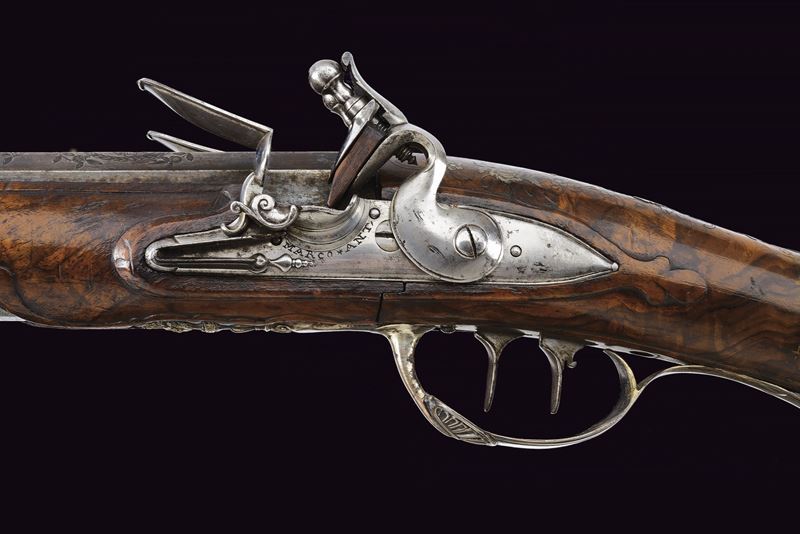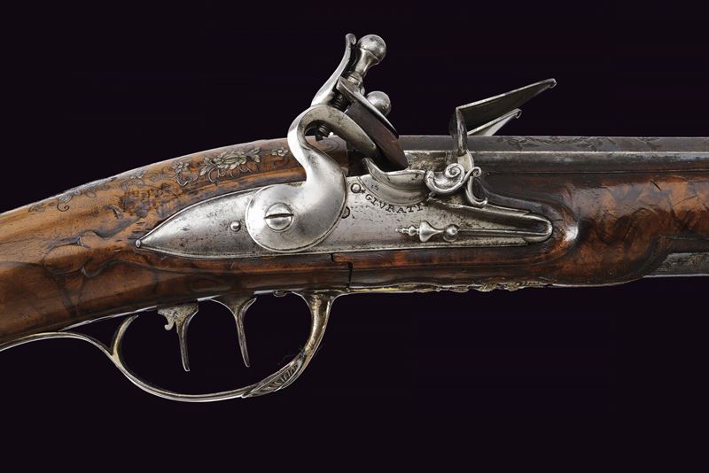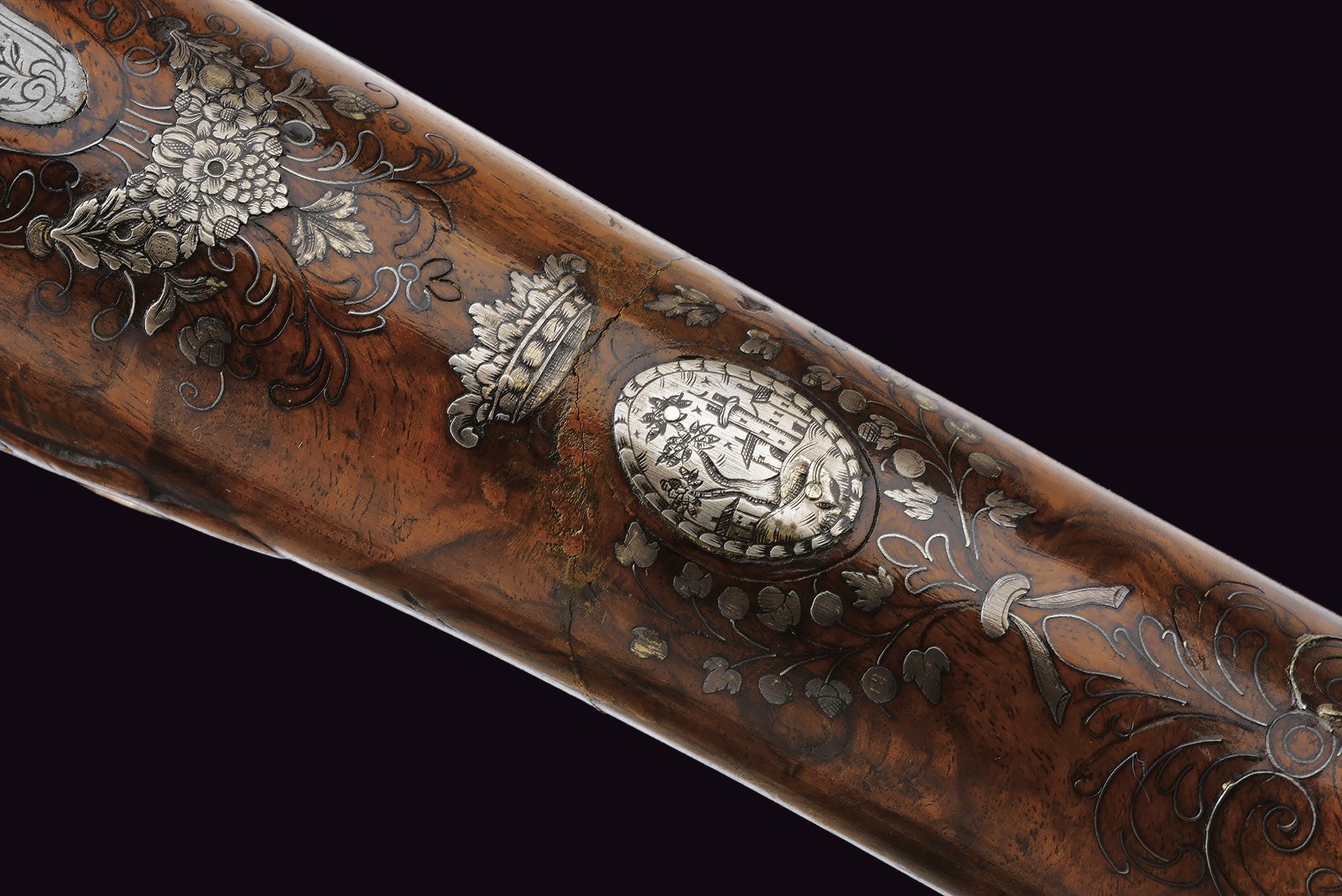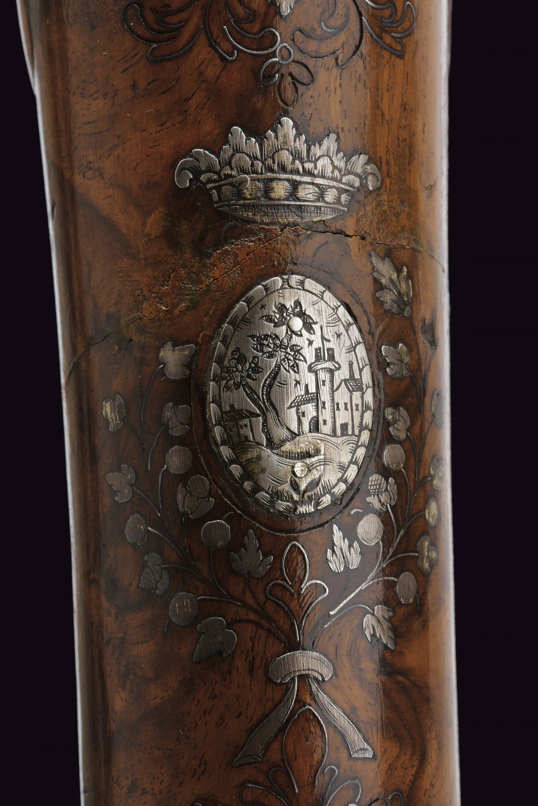 Smoothbore, browned, two-stage, square and round, 15 mm cal. barrels with grooved frames at the girdle, firing chamber engraved with a silver floral motif; dorsal nozzle with silver swallow-tailed foresight. Long tang with outlines and small racemes. Modern locks with rounded lock plates featuring carvings on the pans and related springs; signed in block letters under the pan "MARCO ANTONIO / GIURATI". Short stock of selected walnut, worked in two pieces; decorated with fine floral motifs and silver-inlaid filigree decorations. Engraved and crowned shield on the grip; silver butt plate, chiselled in bas-relief with floral motifs and a gadrooned vase. Silver trigger guard worked in bas-relief. Barrel bracket band provided with lugs and muzzle ring, of silver engraved with floral motifs. Original horn-tipped wooden ramrod.