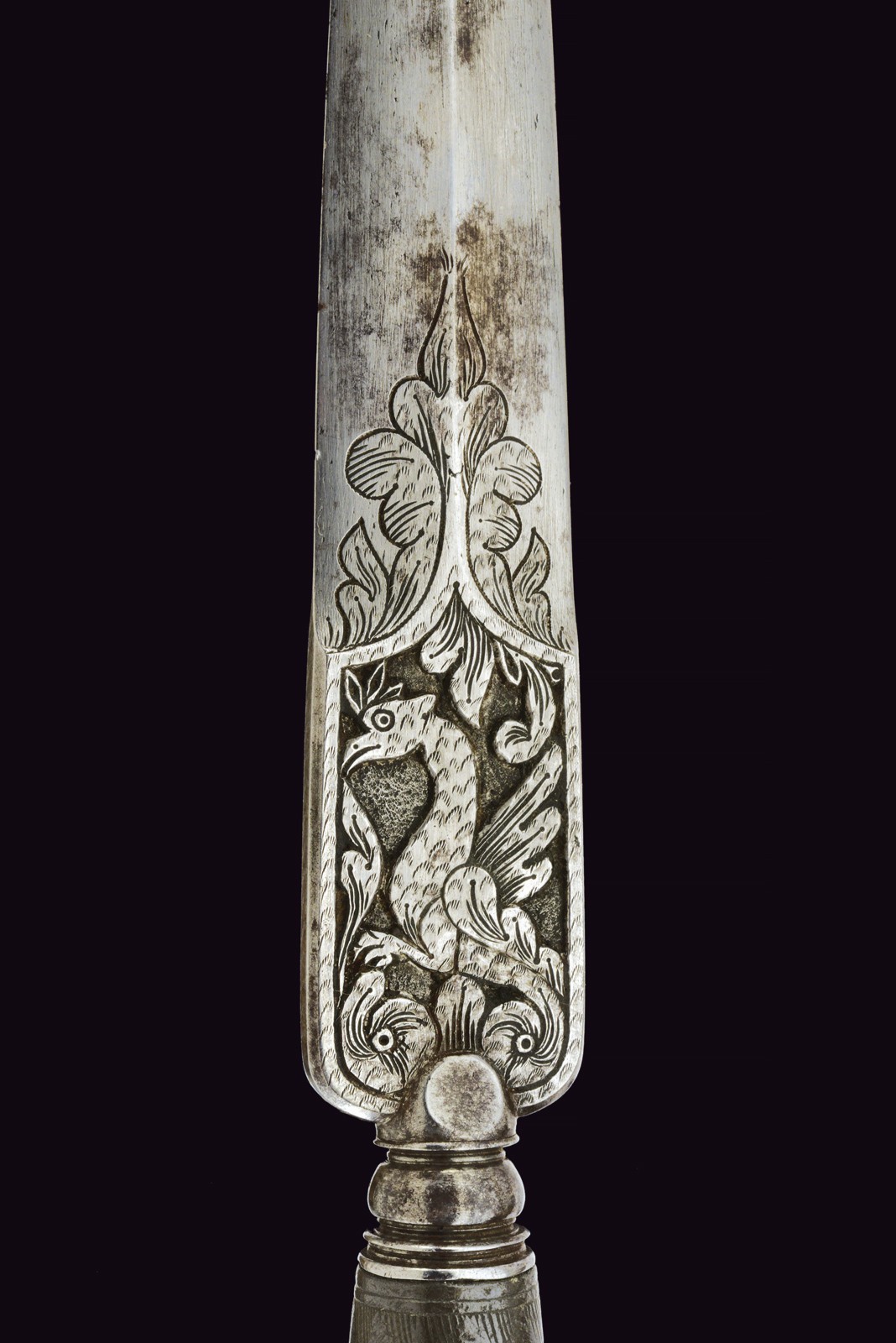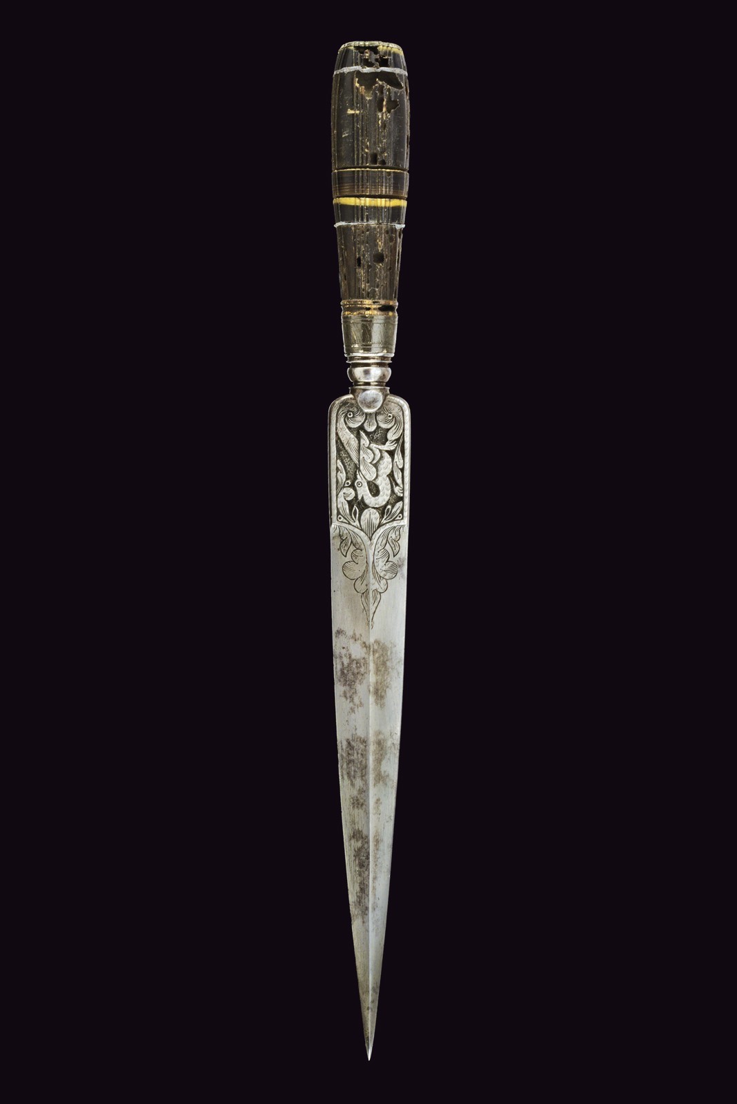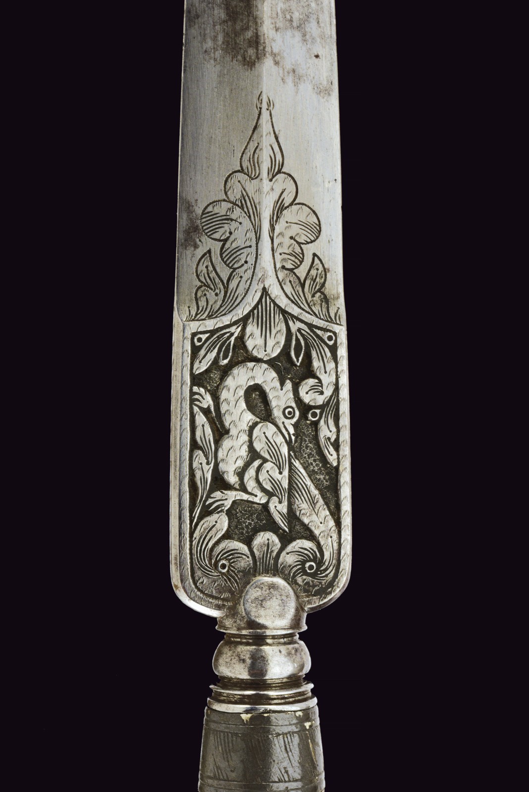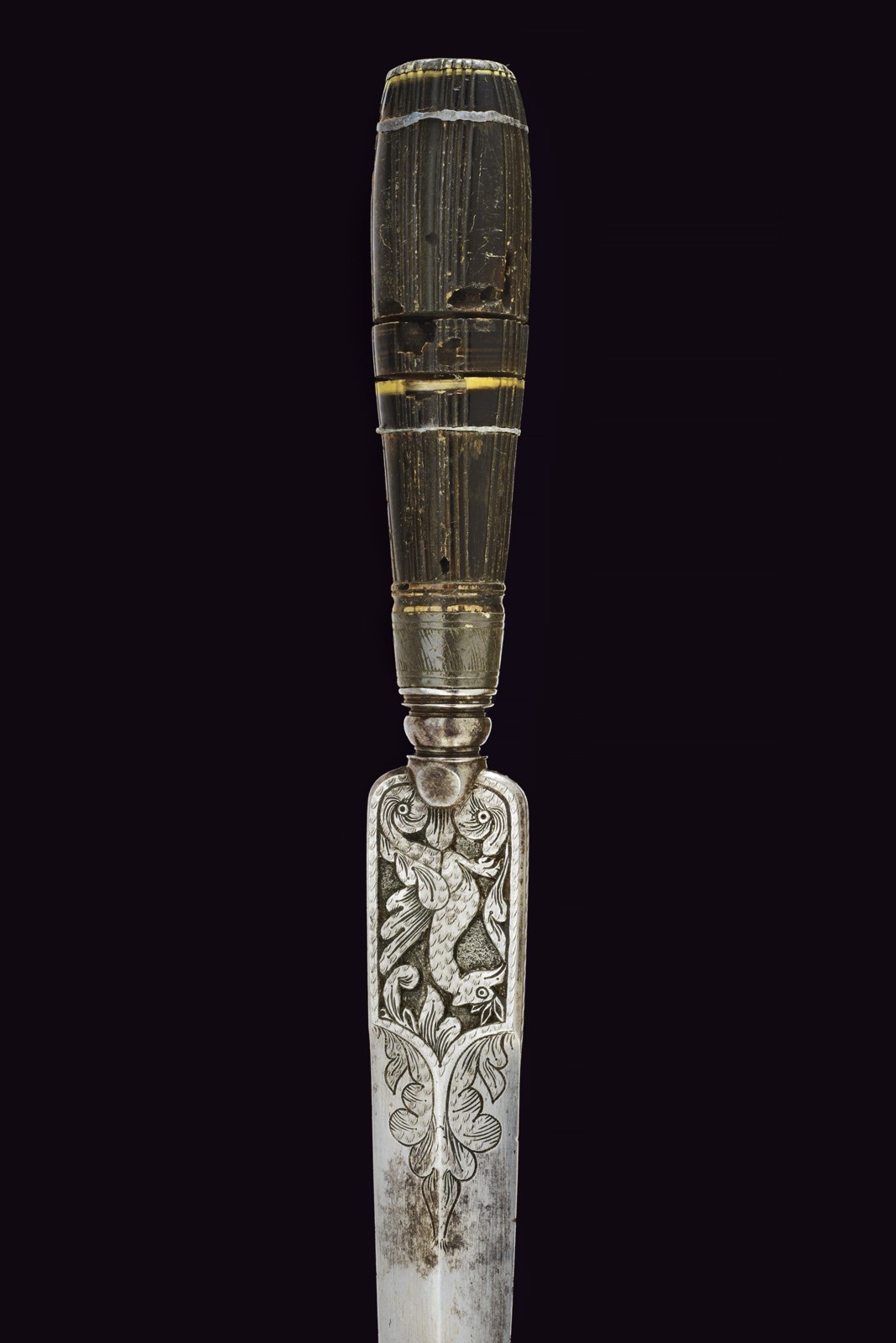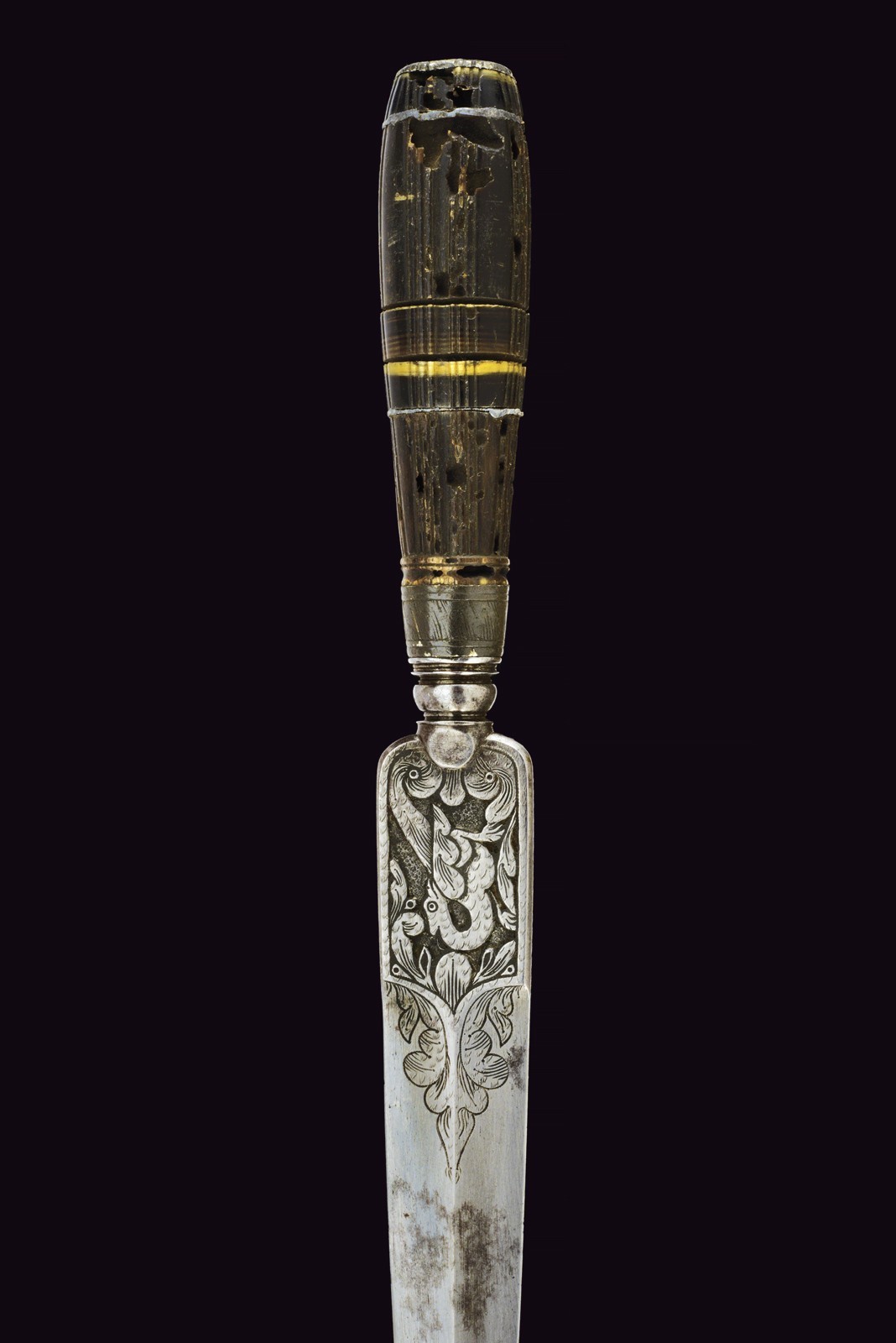 Double-edged blade with central rib, engraved with floral motifs and finely carved in the rectangular tang with griffins and spirals. Round pommel flattened between grooves. Engraved ring nut and cap. Curved grip made of horn sections, one bone disc and two brass discs. Some woodworm damage to the grip, otherwise in excellent condition.