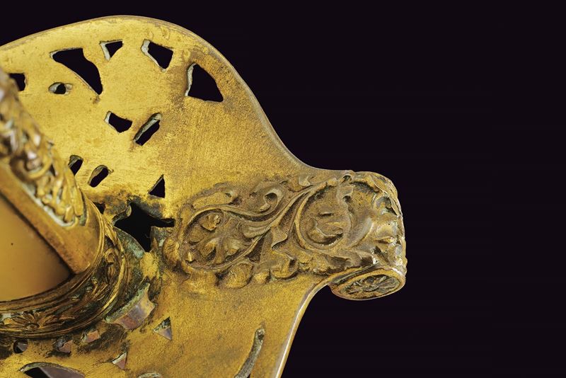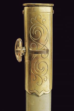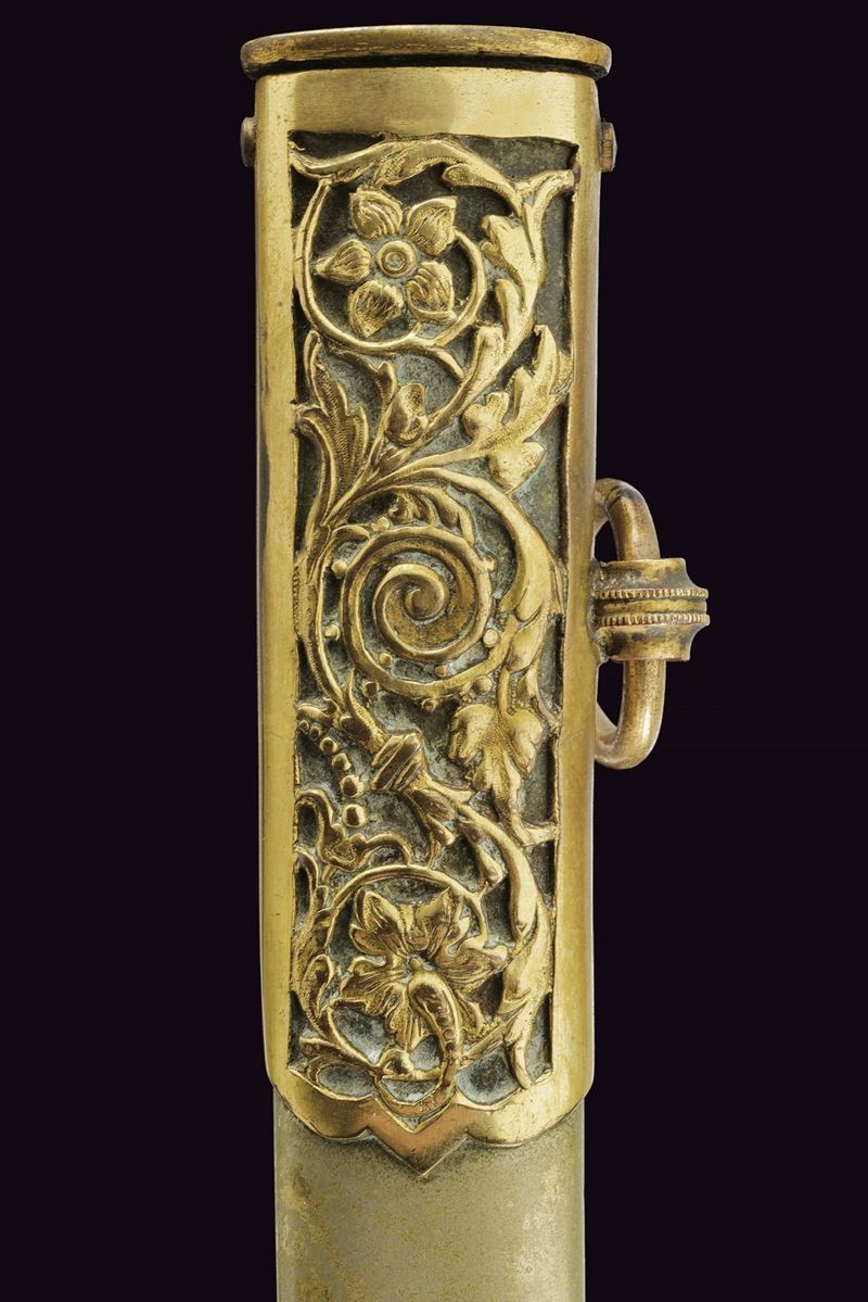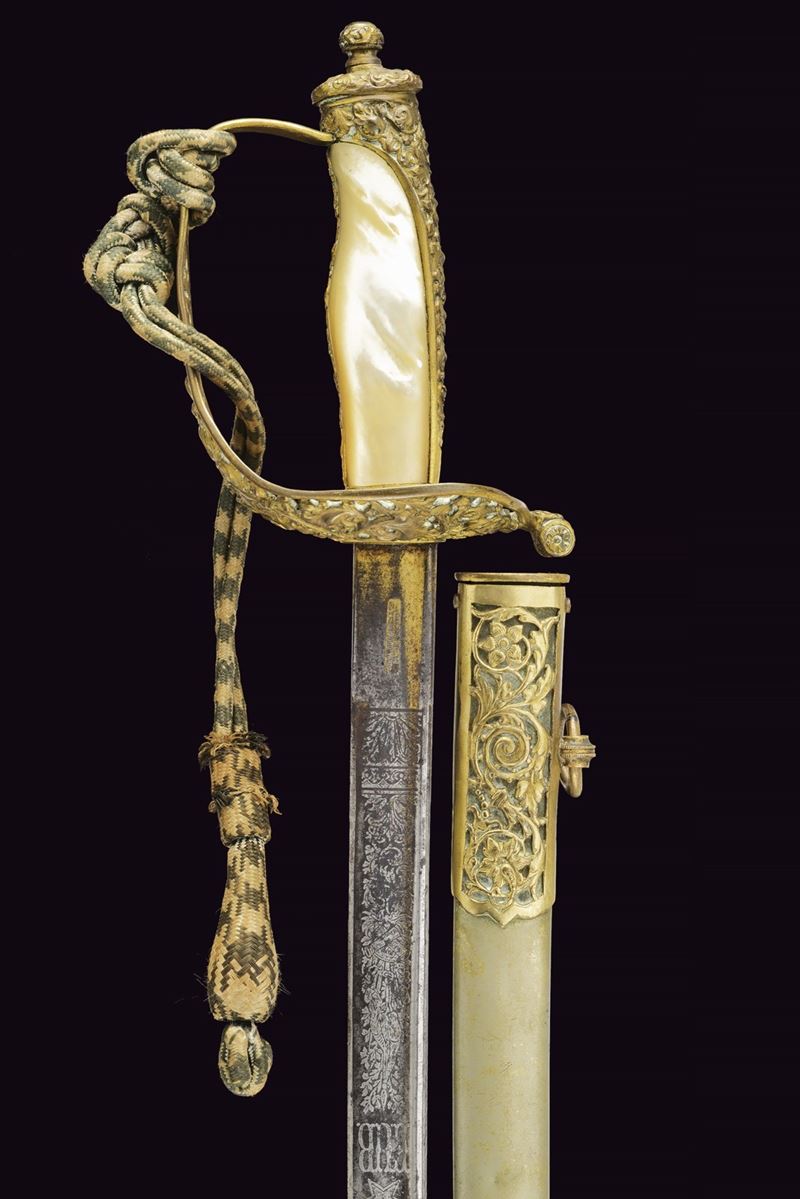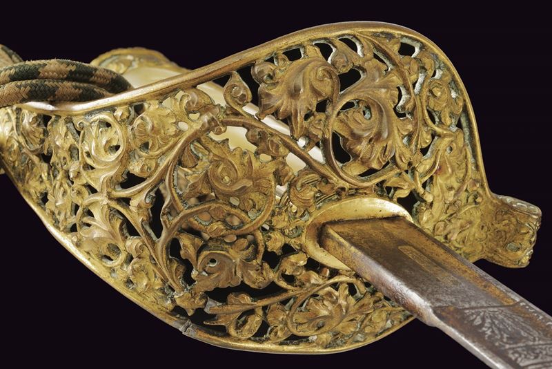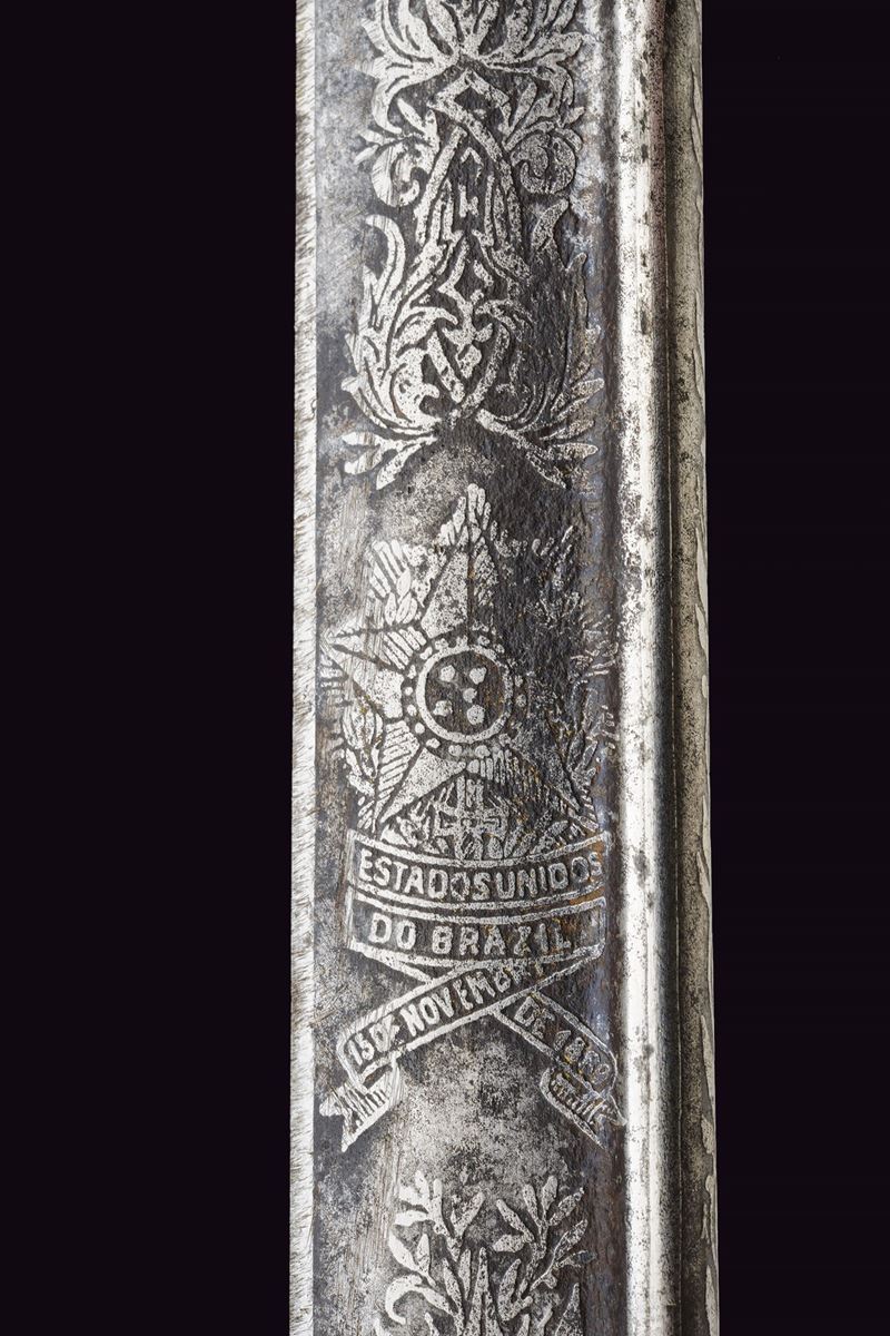 Slightly curved, single-edged blade with cylindrical back, the first half engraved with traces of gilding representing trophies, coat of arms, monogram and floral motifs. The tang marked "CUNHA GUIMARAES & C.IA RIO DE JANERO". Beautiful bronze hilt richly pierced, with a long cap decorated with floral motifs in bas-relief. Mother-of-pearl grip scales. Sword knot. White metal scabbard with pierced brass mounts provided with a ring and a suspension loop. Rare.