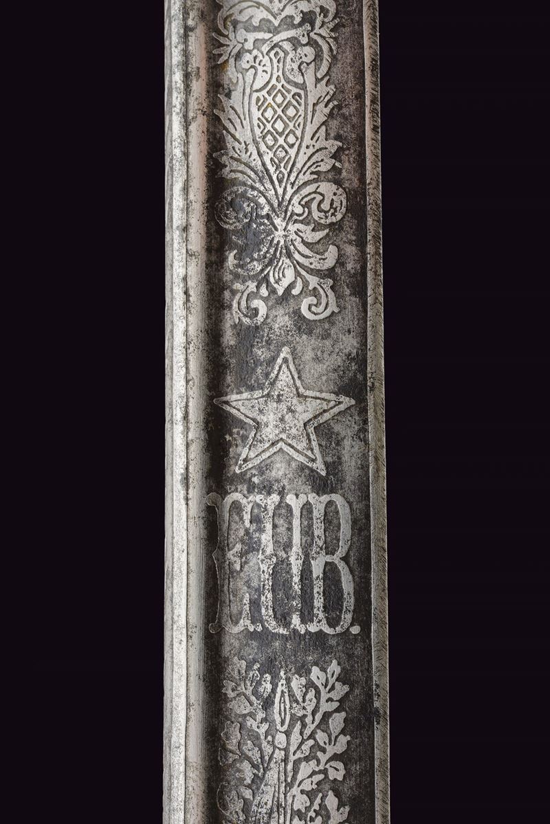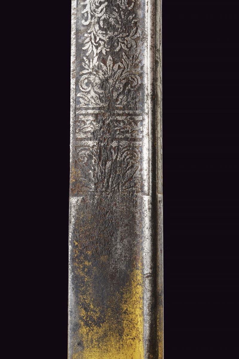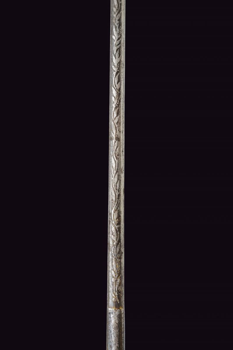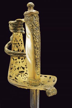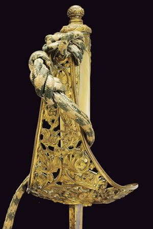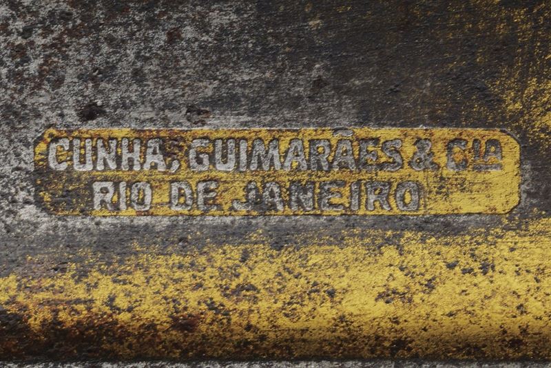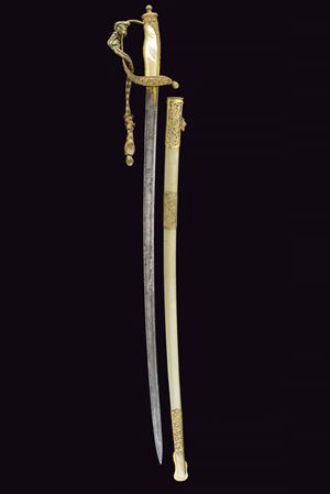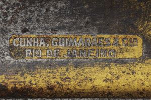 Slightly curved, single-edged blade with cylindrical back, the first half engraved with traces of gilding representing trophies, coat of arms, monogram and floral motifs. The tang marked "CUNHA GUIMARAES & C.IA RIO DE JANERO". Beautiful bronze hilt richly pierced, with a long cap decorated with floral motifs in bas-relief. Mother-of-pearl grip scales. Sword knot. White metal scabbard with pierced brass mounts provided with a ring and a suspension loop. Rare.