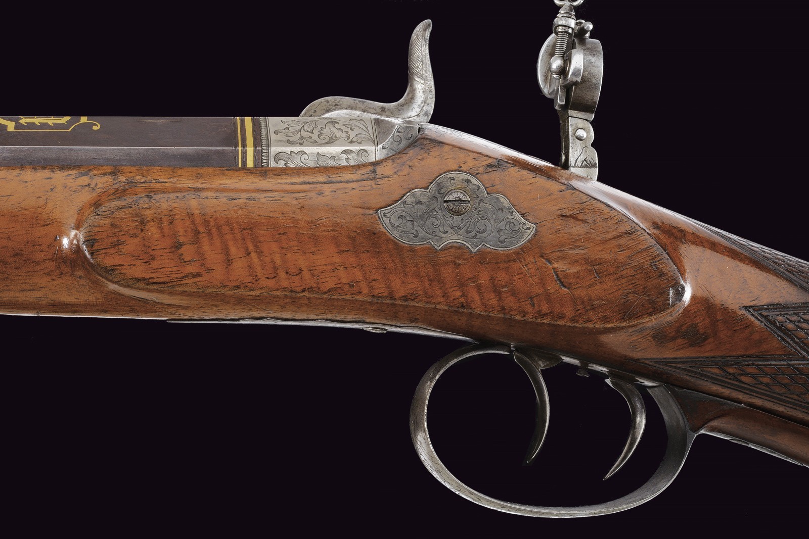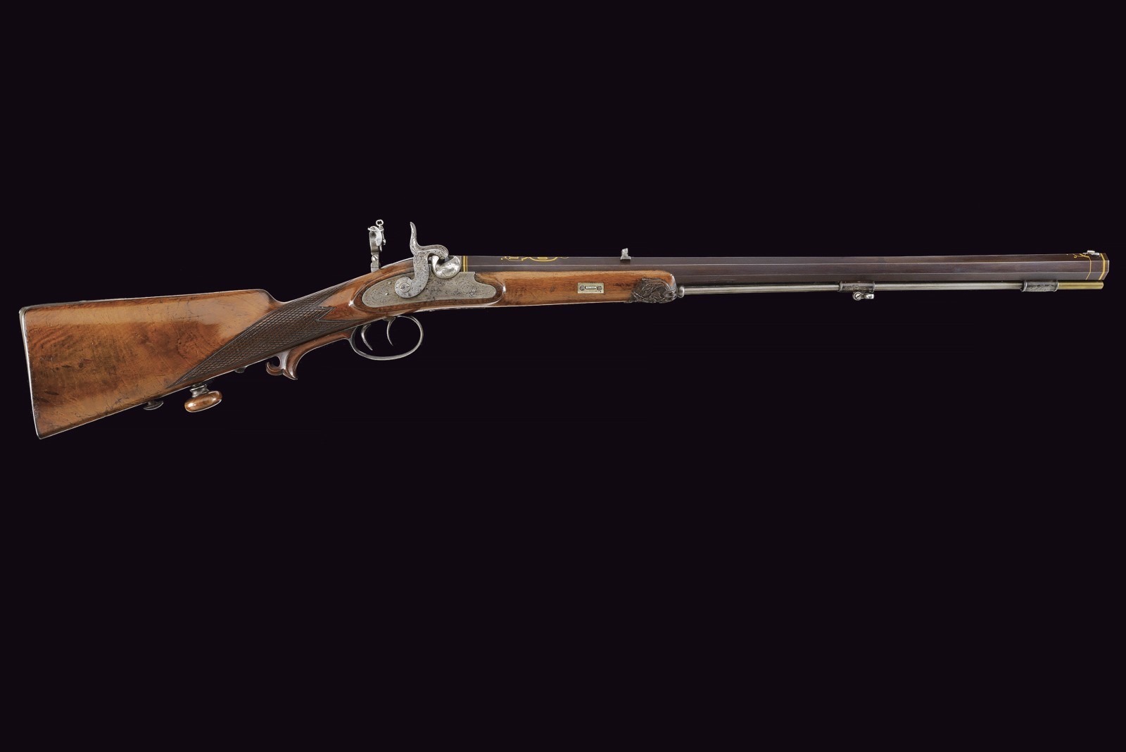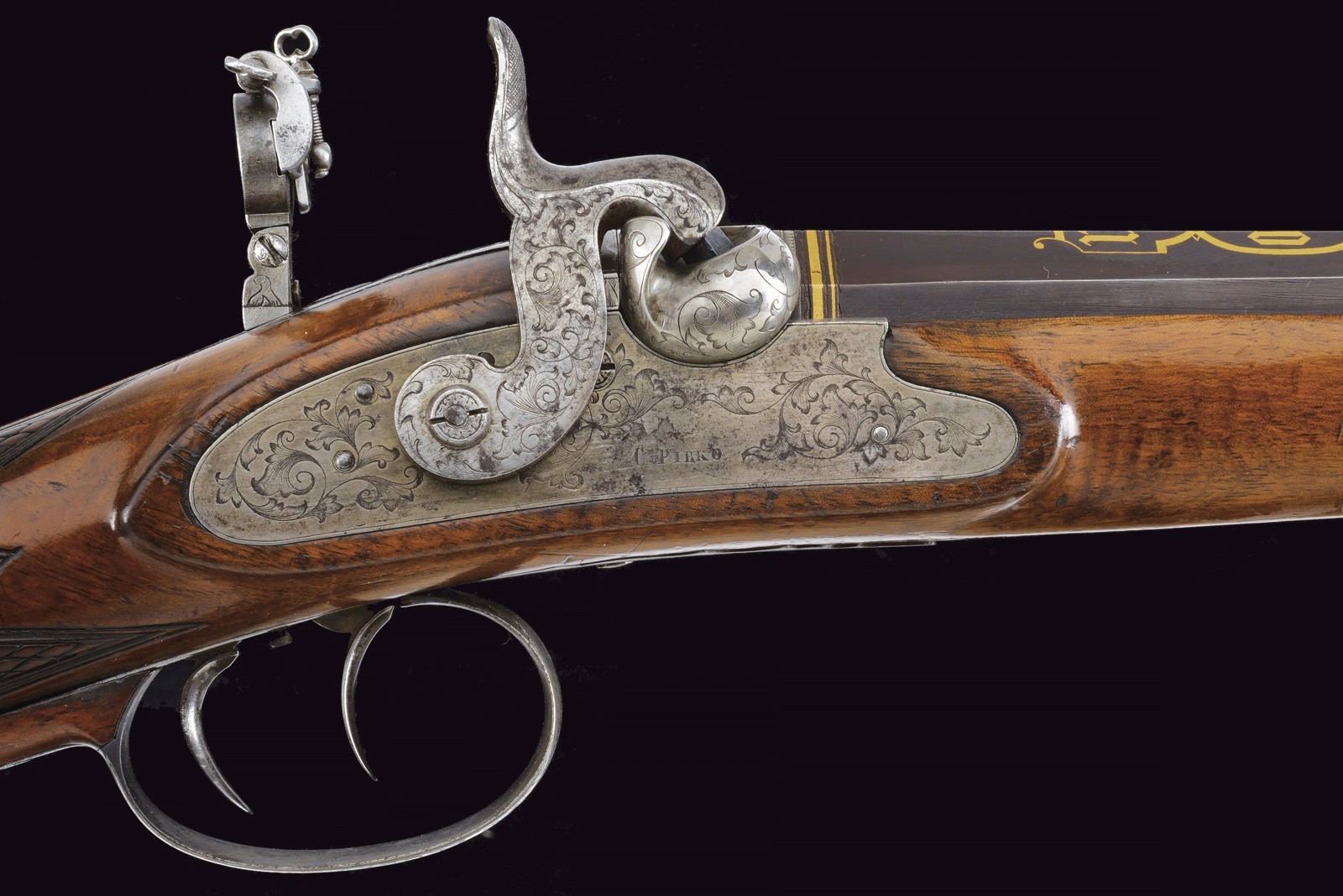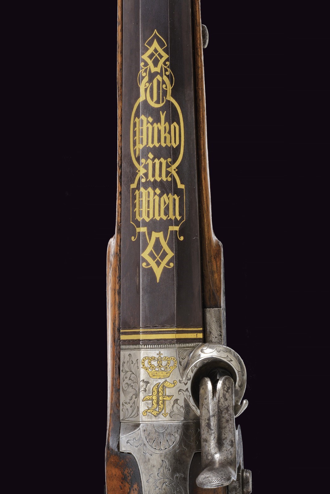 Rifled(clean bore, clearly visible rifling ), octagonal, browned, 15 mm cal with gilt borders and decorations at both ends; at the base a steel finish with a crowned monogram “F” or “FF” among floral motifs, followed by the gold-inlaid signature “Pirko in Wien” within a cartouche; rear sight with one fixed and one folding leaf, front sight. Engraved iron tang with folding diopter. Forward-spring lock with flat lockplate, signed “C. PIRKO” and foliate-engraved; two-stage mechanism, in working order. Half stock with chequered wrist and low-relief floral carving at the fore-end tip and on the left cheek. Iron mounts, decorated en suite. Wood-sculpted trigger guard; wooden pommel under the butt. Iron ramrod.