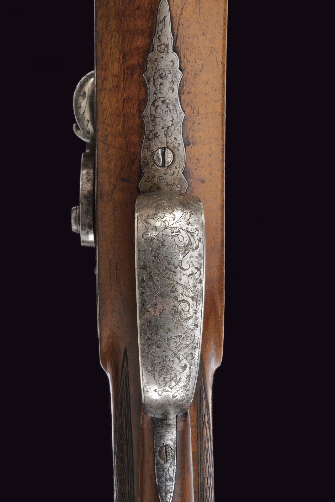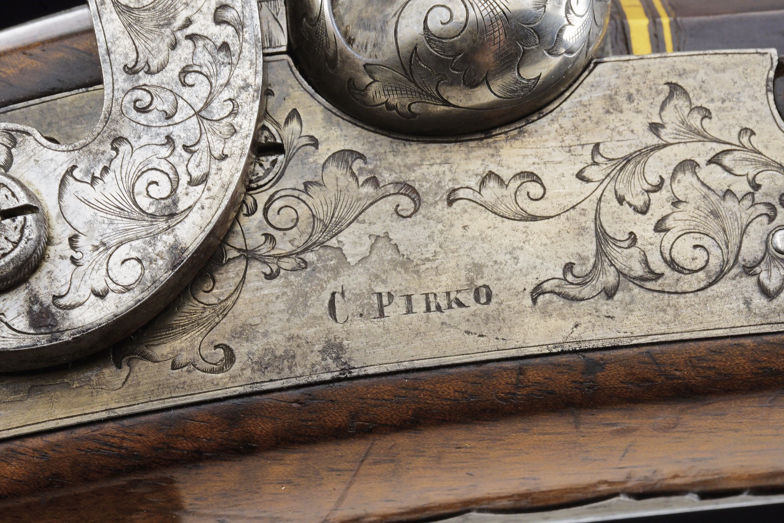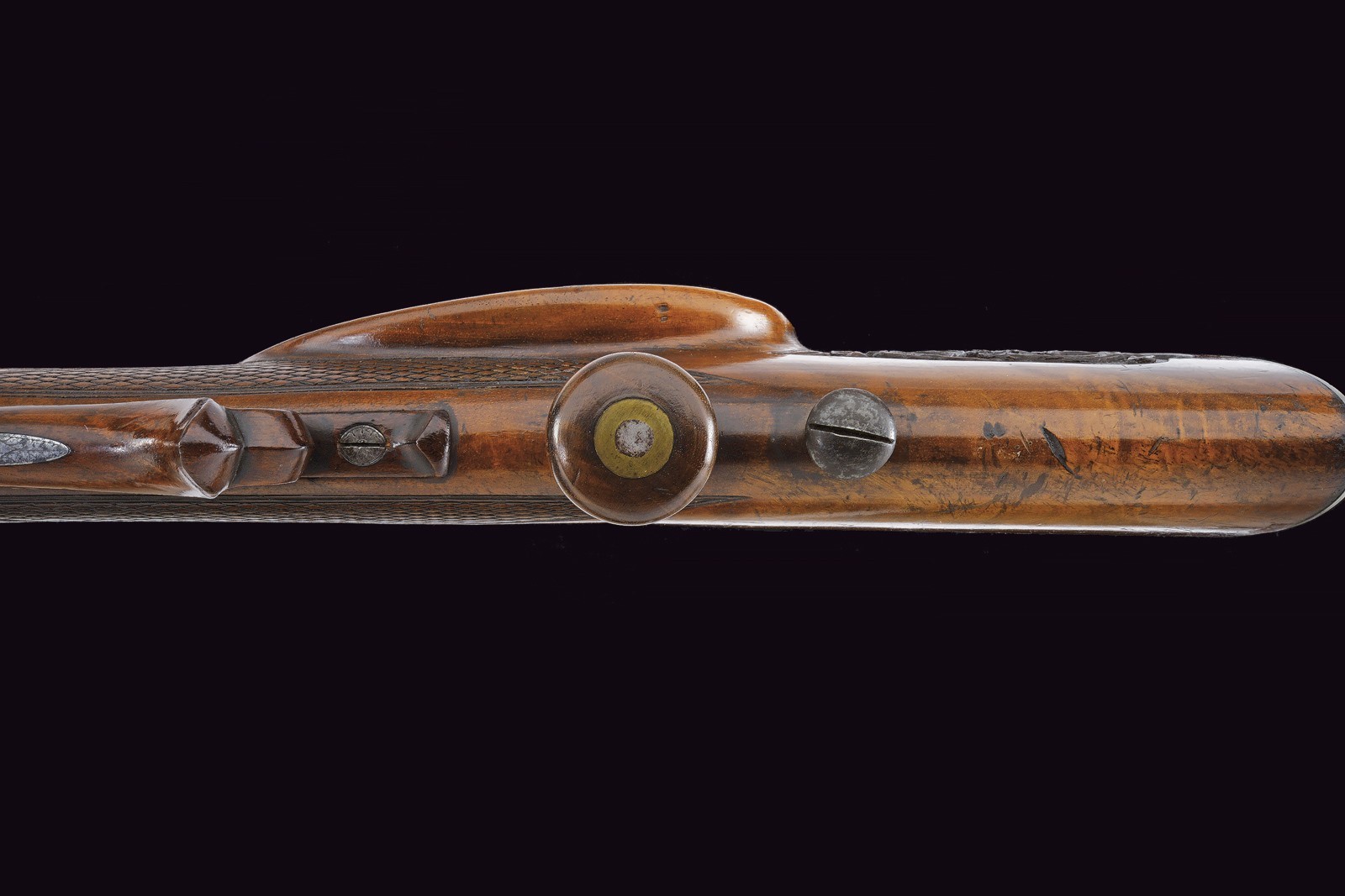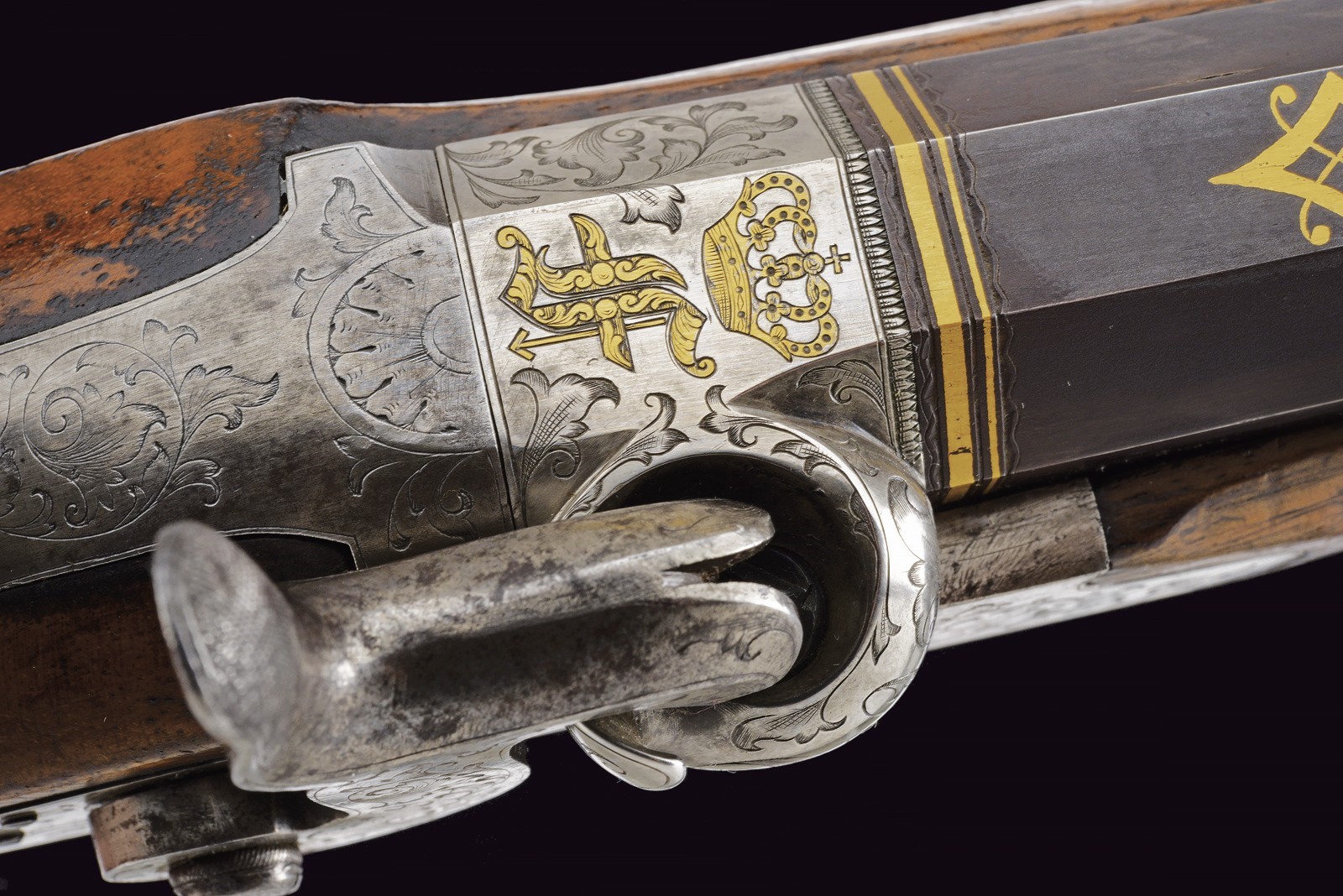 Rifled(clean bore, clearly visible rifling ), octagonal, browned, 15 mm cal with gilt borders and decorations at both ends; at the base a steel finish with a crowned monogram “F” or “FF” among floral motifs, followed by the gold-inlaid signature “Pirko in Wien” within a cartouche; rear sight with one fixed and one folding leaf, front sight. Engraved iron tang with folding diopter. Forward-spring lock with flat lockplate, signed “C. PIRKO” and foliate-engraved; two-stage mechanism, in working order. Half stock with chequered wrist and low-relief floral carving at the fore-end tip and on the left cheek. Iron mounts, decorated en suite. Wood-sculpted trigger guard; wooden pommel under the butt. Iron ramrod.