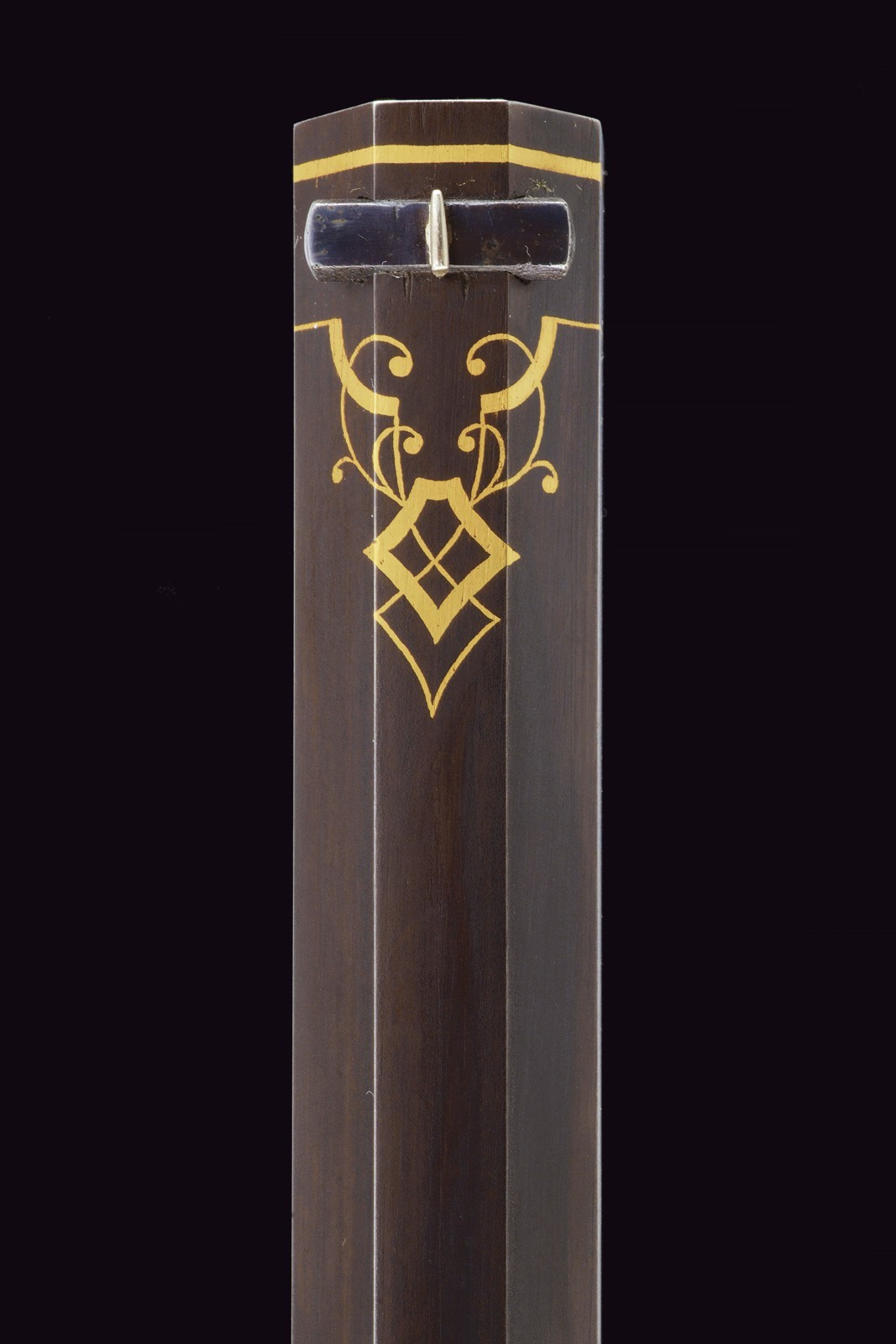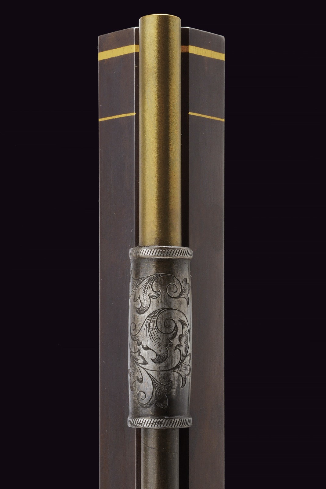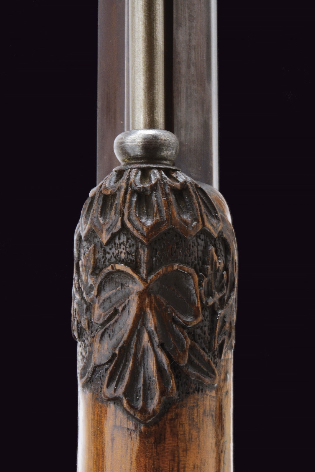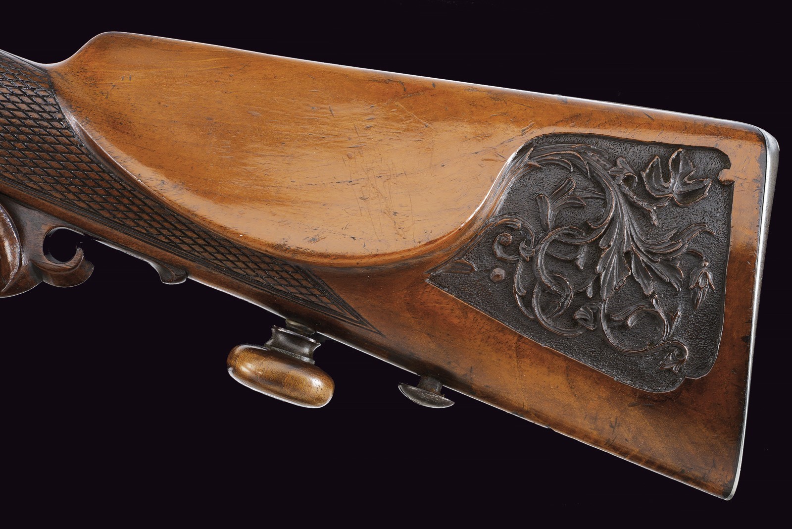 Rifled(clean bore, clearly visible rifling ), octagonal, browned, 15 mm cal with gilt borders and decorations at both ends; at the base a steel finish with a crowned monogram “F” or “FF” among floral motifs, followed by the gold-inlaid signature “Pirko in Wien” within a cartouche; rear sight with one fixed and one folding leaf, front sight. Engraved iron tang with folding diopter. Forward-spring lock with flat lockplate, signed “C. PIRKO” and foliate-engraved; two-stage mechanism, in working order. Half stock with chequered wrist and low-relief floral carving at the fore-end tip and on the left cheek. Iron mounts, decorated en suite. Wood-sculpted trigger guard; wooden pommel under the butt. Iron ramrod.