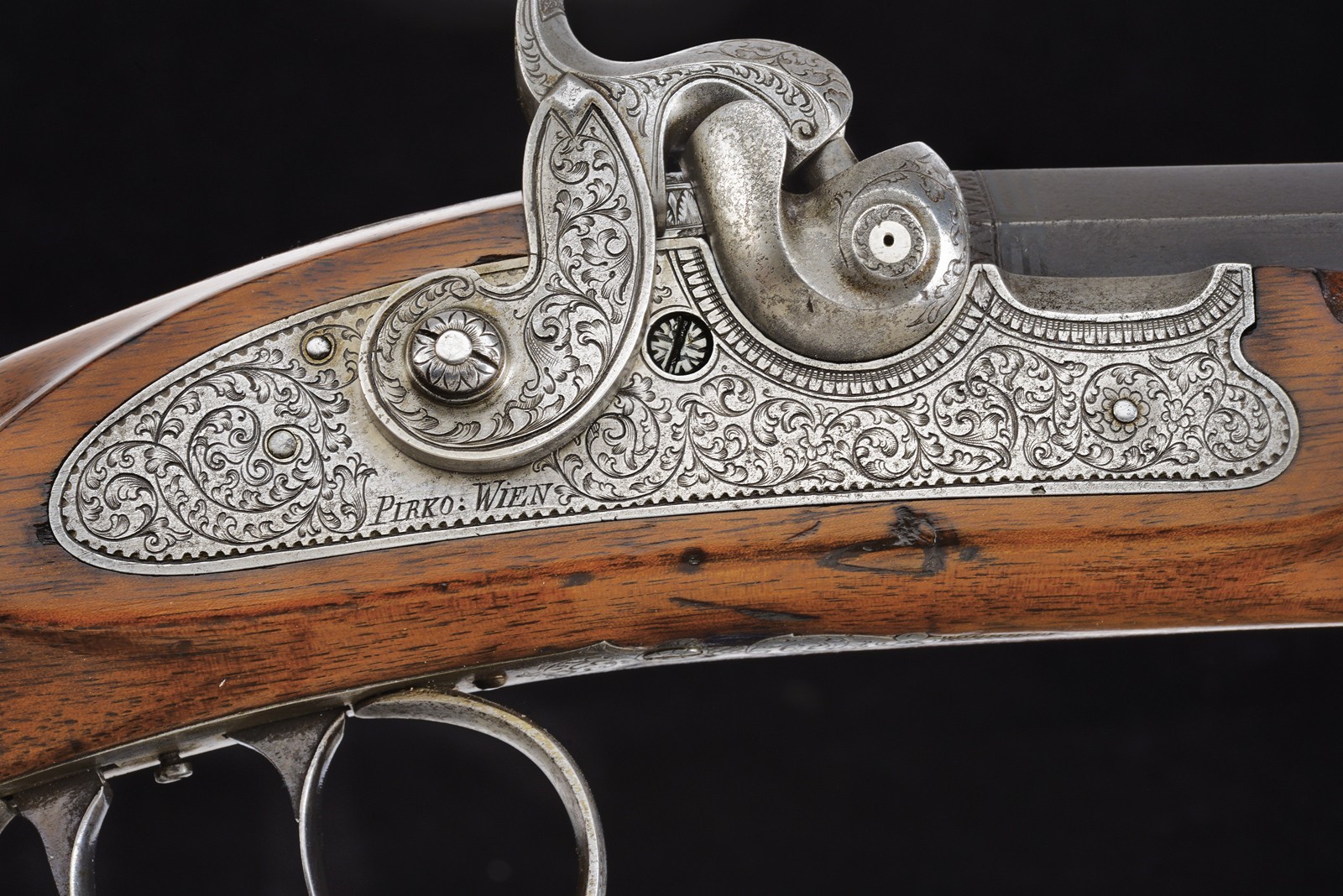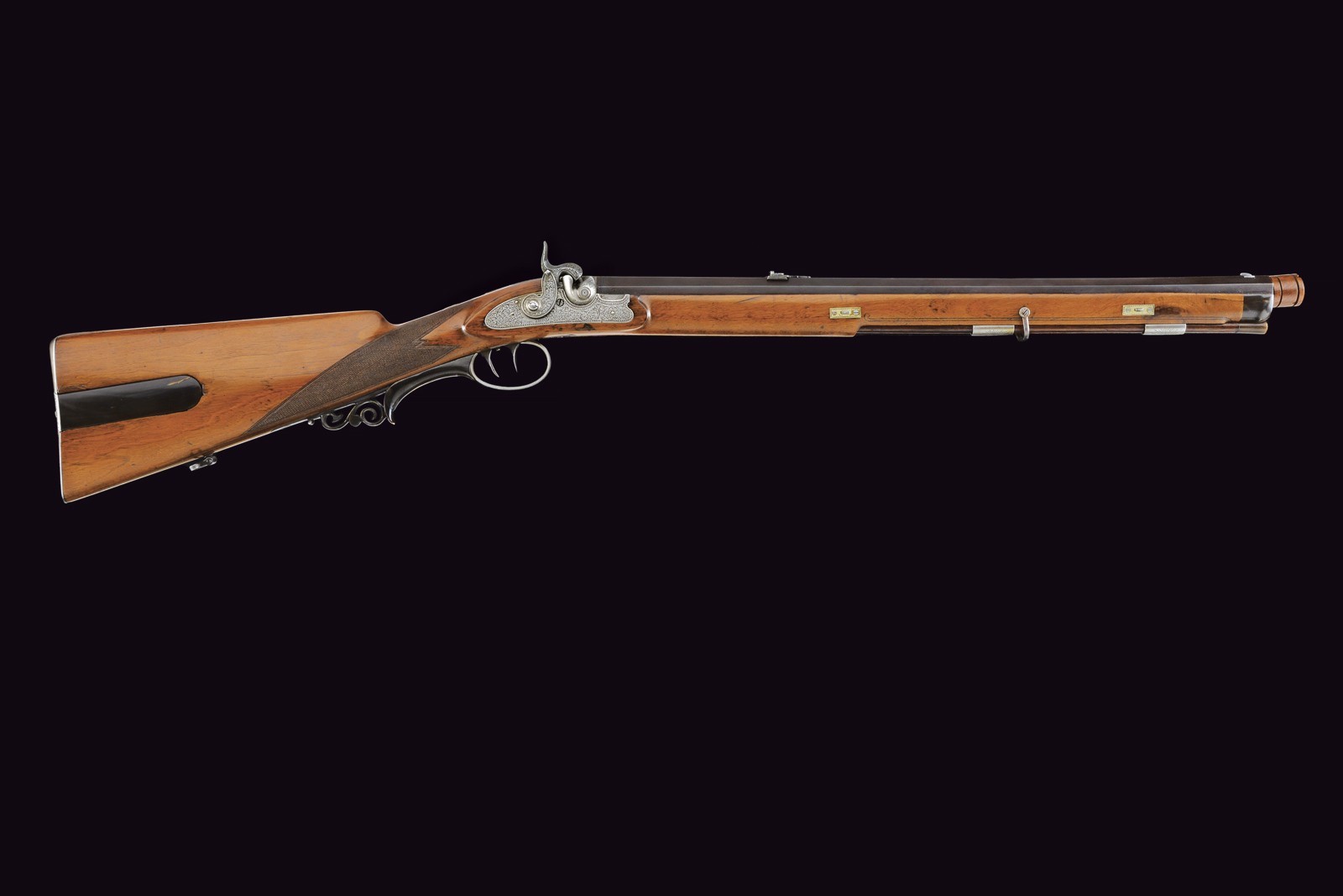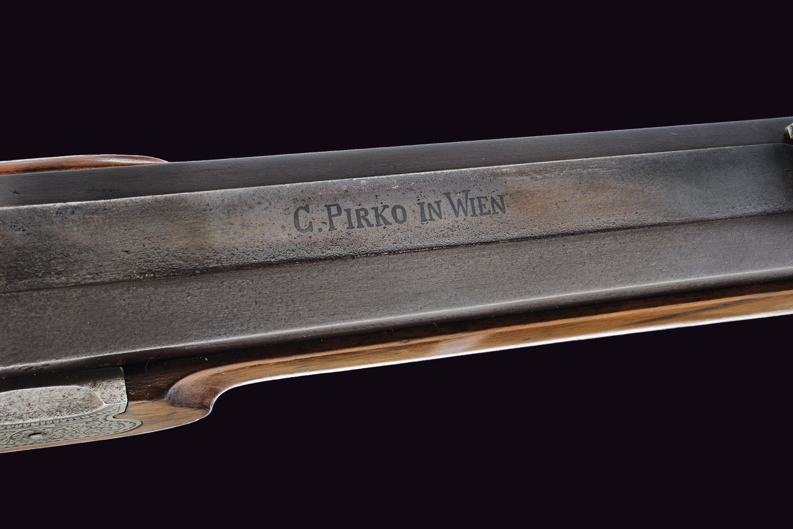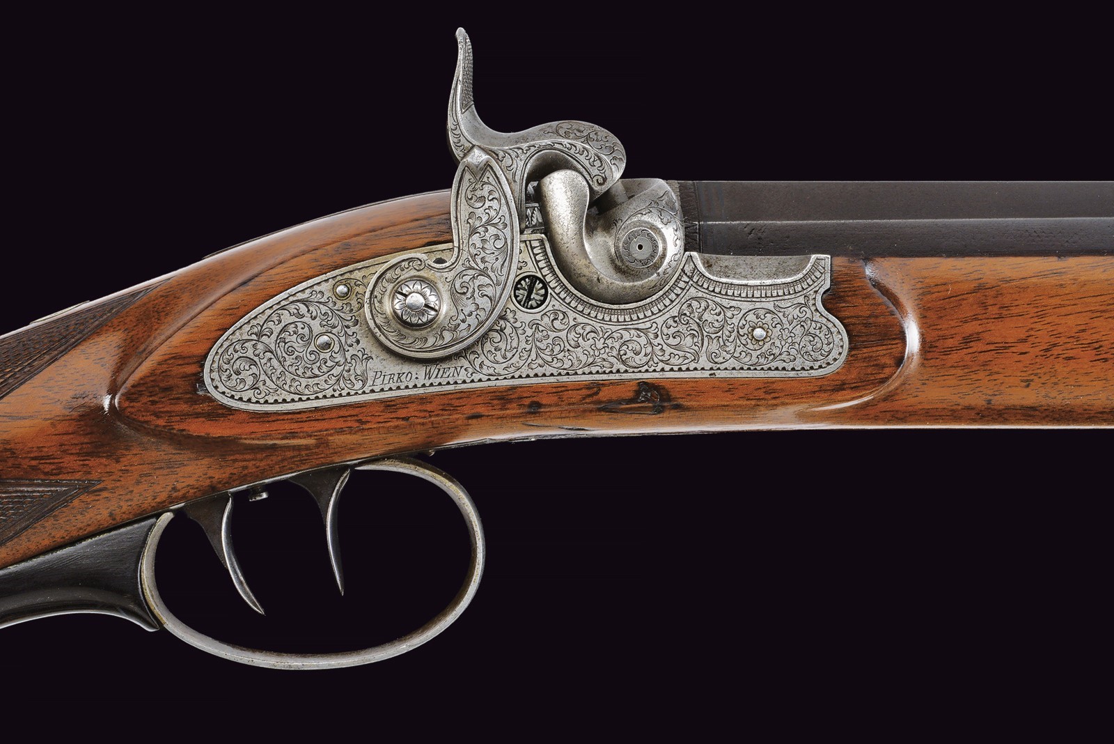 Rifled (clean bore, rifling clearly visible), octagonal, browned, 14 mm cal barrel; at the breech a steel-finished section engraved with scrolls; at the start of the browned part a silver Greek fret, followed by the silver-inlaid inscription “C. PIRKO IN WIEN”; rear sight with one fixed and one folding leaf, front sight with silver side walls and a silver scrollwork insert. Engraved tang. Forward-spring lock with flat lockplate, signed “PIRKO WIEN” and finely floral-engraved. Working mechanism with double set trigger (stecher). Wooden full stock with a chequered base. Iron mounts decorated en suite; the rear part of the trigger guard, the patchbox, and the fore-end tip made of cow horn. Iron-tipped wooden ramrod with brass cartridge extractor. On the back, a small oval silver escutcheon.