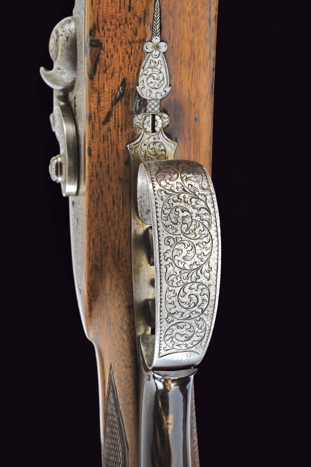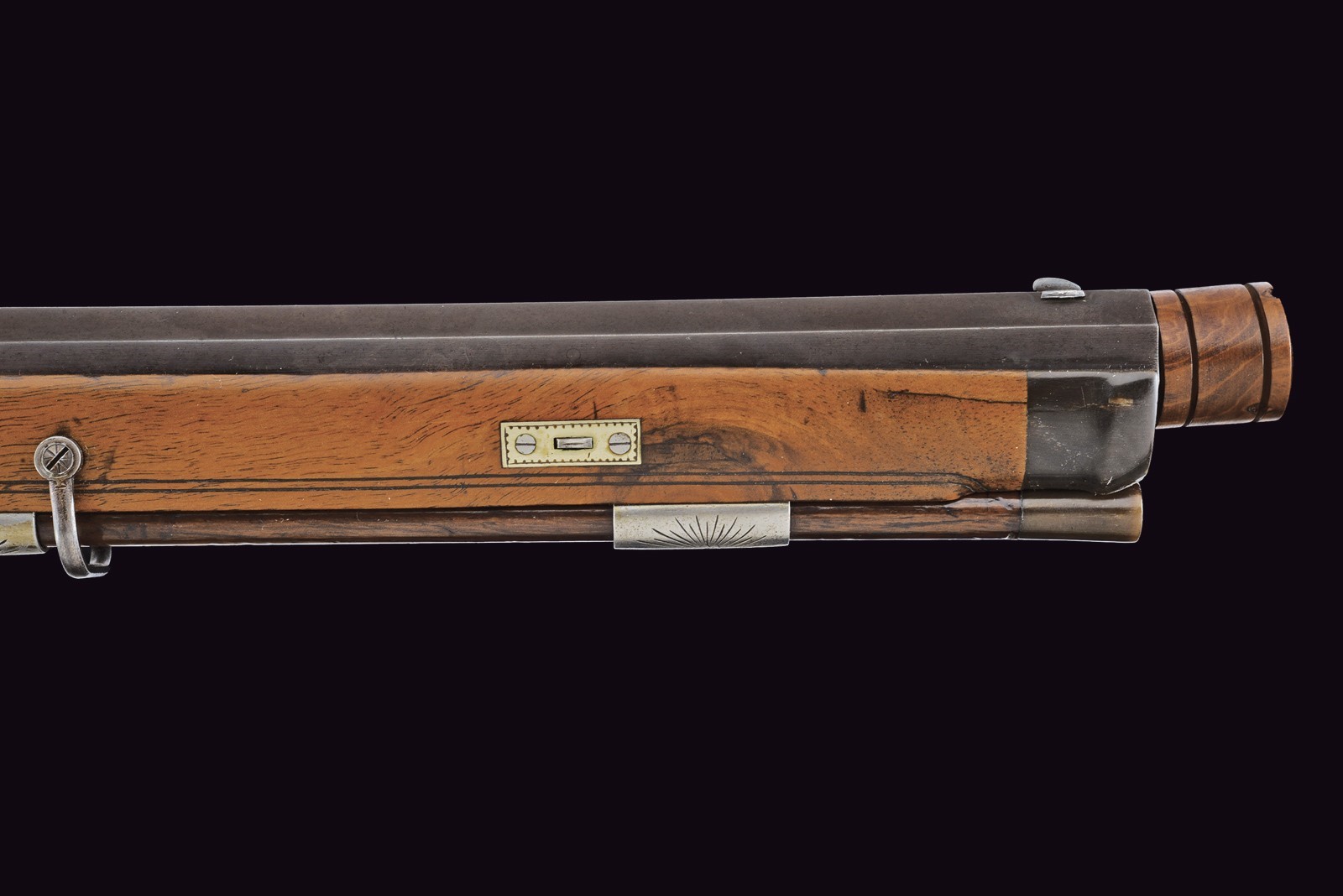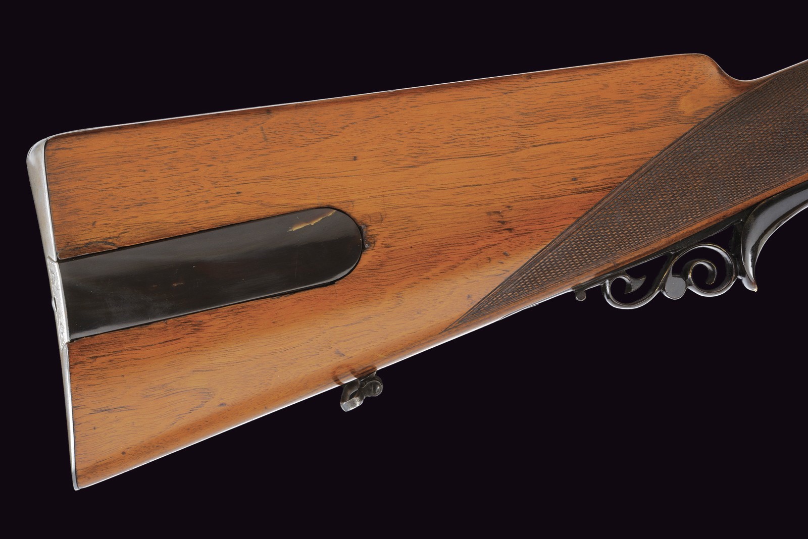 Rifled (clean bore, rifling clearly visible), octagonal, browned, 14 mm cal barrel; at the breech a steel-finished section engraved with scrolls; at the start of the browned part a silver Greek fret, followed by the silver-inlaid inscription “C. PIRKO IN WIEN”; rear sight with one fixed and one folding leaf, front sight with silver side walls and a silver scrollwork insert. Engraved tang. Forward-spring lock with flat lockplate, signed “PIRKO WIEN” and finely floral-engraved. Working mechanism with double set trigger (stecher). Wooden full stock with a chequered base. Iron mounts decorated en suite; the rear part of the trigger guard, the patchbox, and the fore-end tip made of cow horn. Iron-tipped wooden ramrod with brass cartridge extractor. On the back, a small oval silver escutcheon.