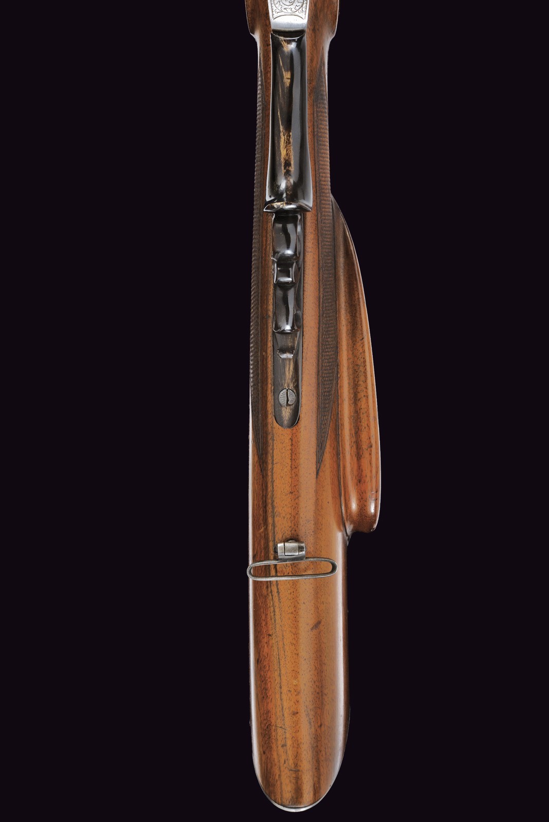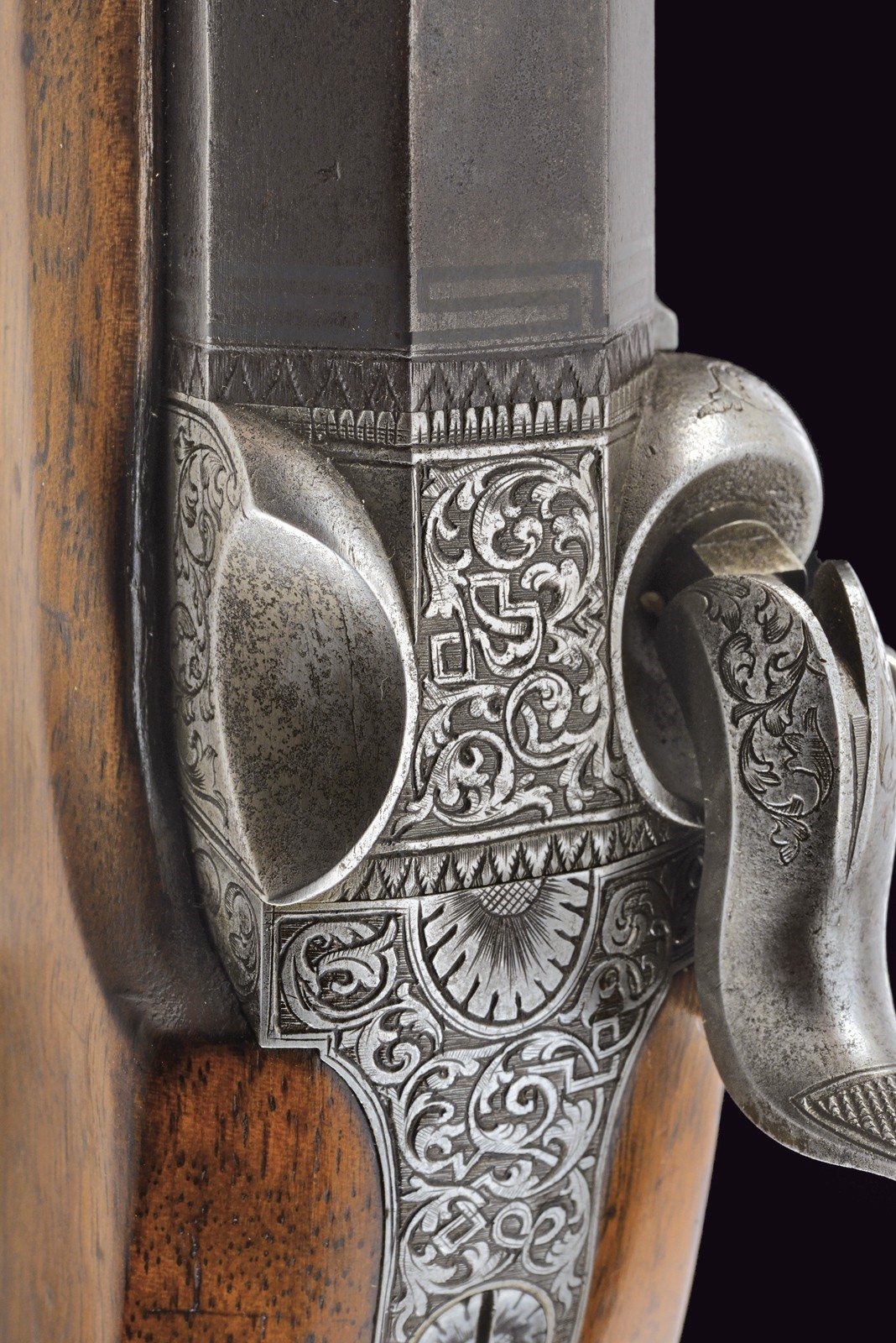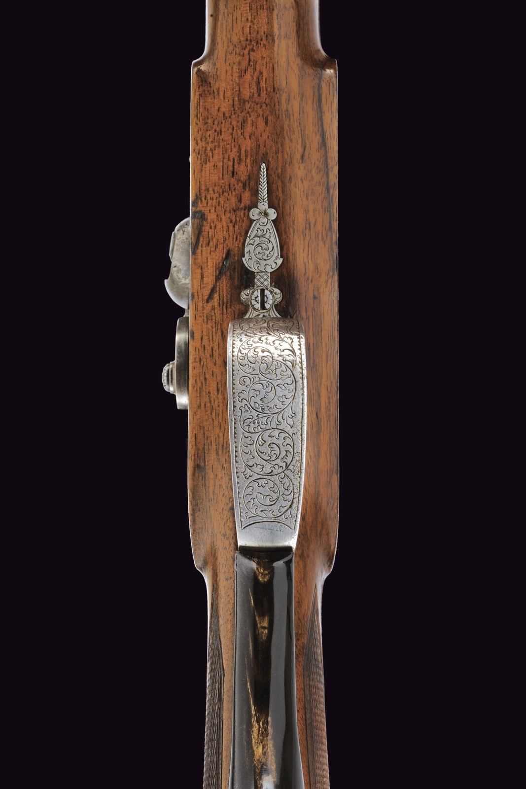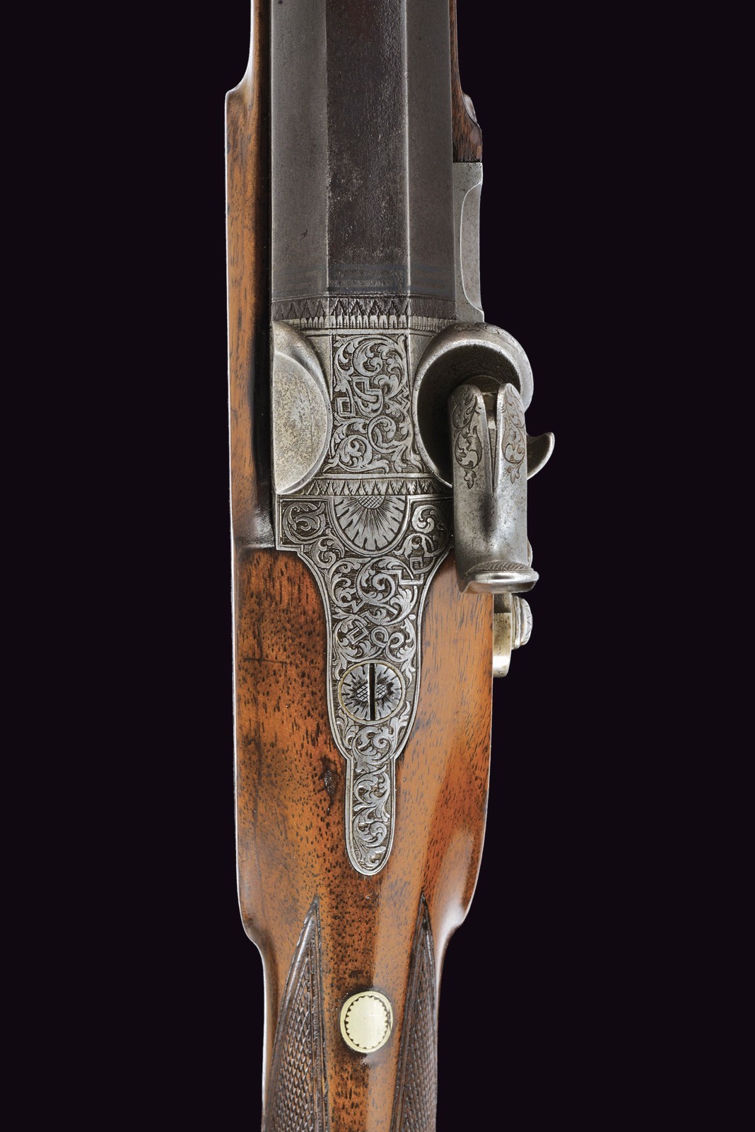 Rifled (clean bore, rifling clearly visible), octagonal, browned, 14 mm cal barrel; at the breech a steel-finished section engraved with scrolls; at the start of the browned part a silver Greek fret, followed by the silver-inlaid inscription “C. PIRKO IN WIEN”; rear sight with one fixed and one folding leaf, front sight with silver side walls and a silver scrollwork insert. Engraved tang. Forward-spring lock with flat lockplate, signed “PIRKO WIEN” and finely floral-engraved. Working mechanism with double set trigger (stecher). Wooden full stock with a chequered base. Iron mounts decorated en suite; the rear part of the trigger guard, the patchbox, and the fore-end tip made of cow horn. Iron-tipped wooden ramrod with brass cartridge extractor. On the back, a small oval silver escutcheon.