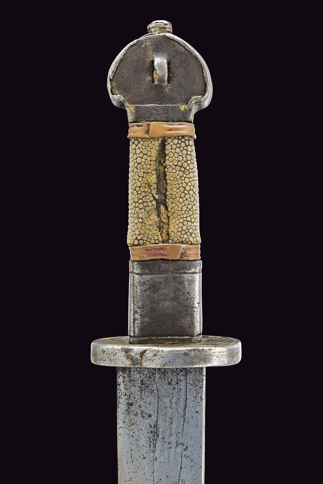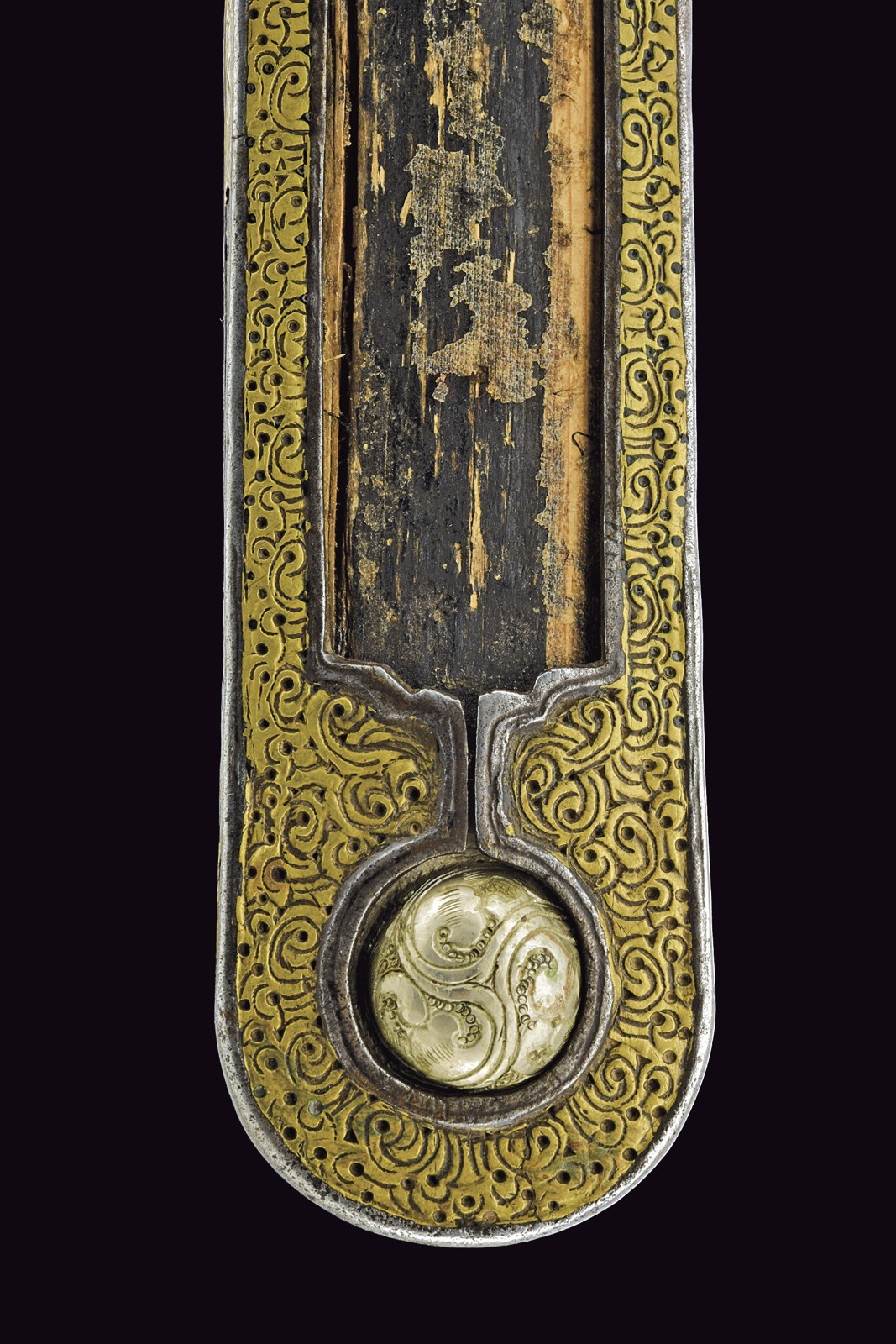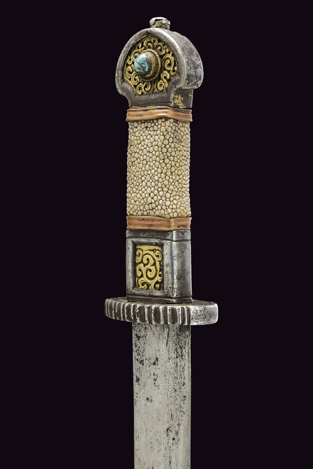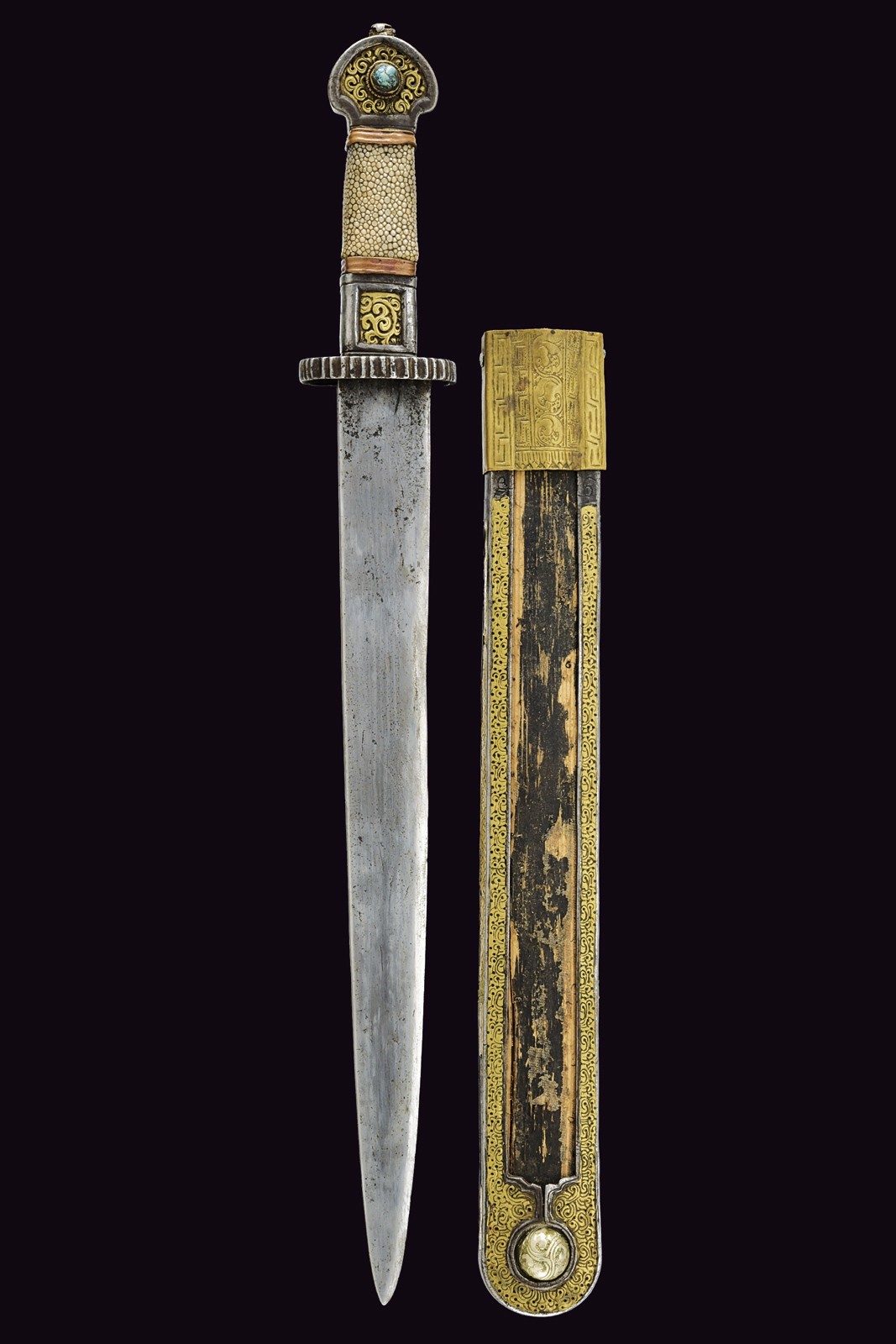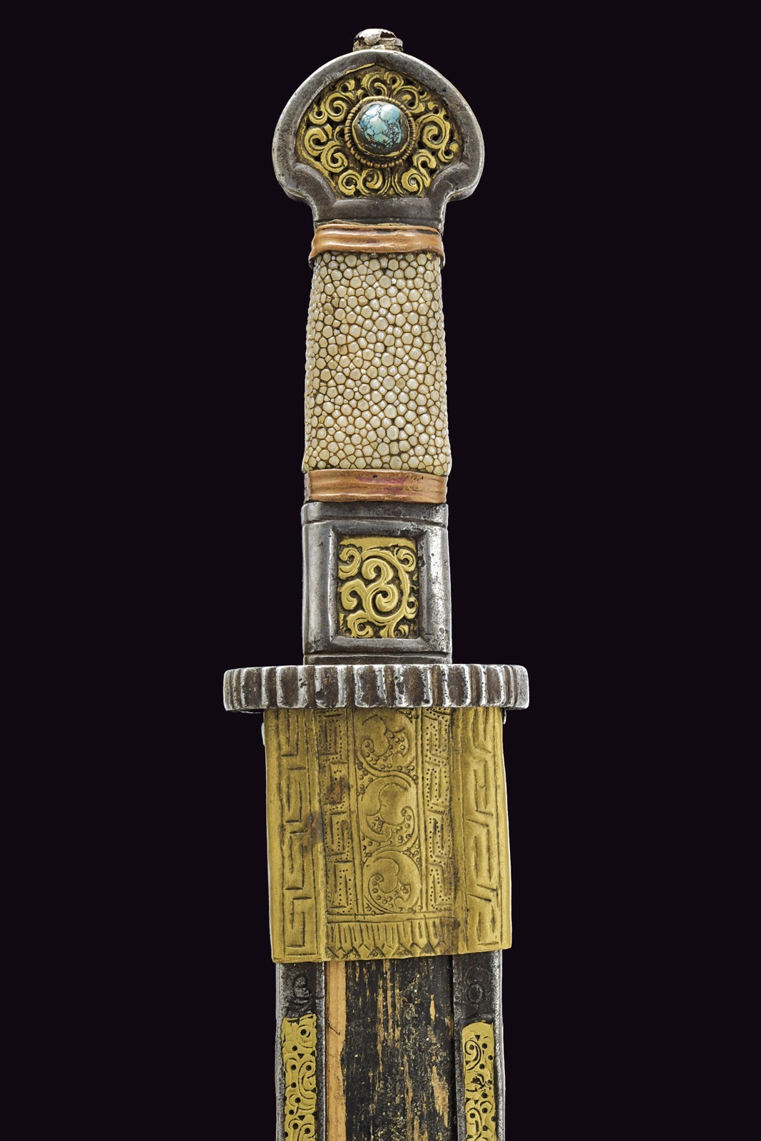 Straight, single-edged blade (some areas with imperfections). Iron hilt, elliptical quillon worked with vertical grooves on the front border, outer surface with remains of brass-inlaid decorations; iron pommel and ring nut with central elements made of brass worked with floral spirals, the pommel partly pierced and surmounted by a turquoise cabochon stone. Wooden grip covered with fish leather, with copper band at the ends. Wooden scabbard with very few remains of the leather or fabric covering; iron mounts, the front part with brass spiral decorations, the lower part with a spherical decorative silver element; brass-foil cap decorated with geometric and floral motifs; the rear part of the hilt is smooth. Some brass parts with remains of gilding.