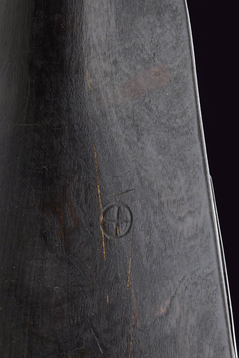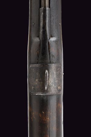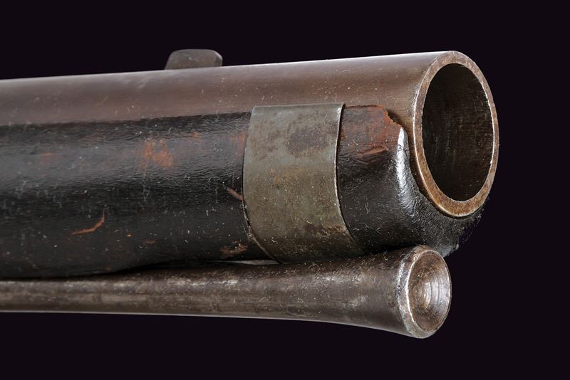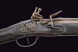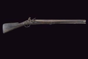 Heavy, smoothbore, round barrel; unusual breech with rear sight; foresight and 28 mm cal. at the nozzle. Flintlock with safety lock at the tang. Wooden full stock (signs of use and time; small defects) with iron mounts and ramrod.