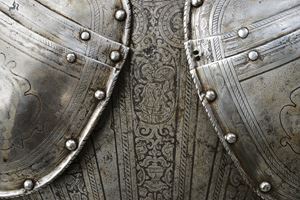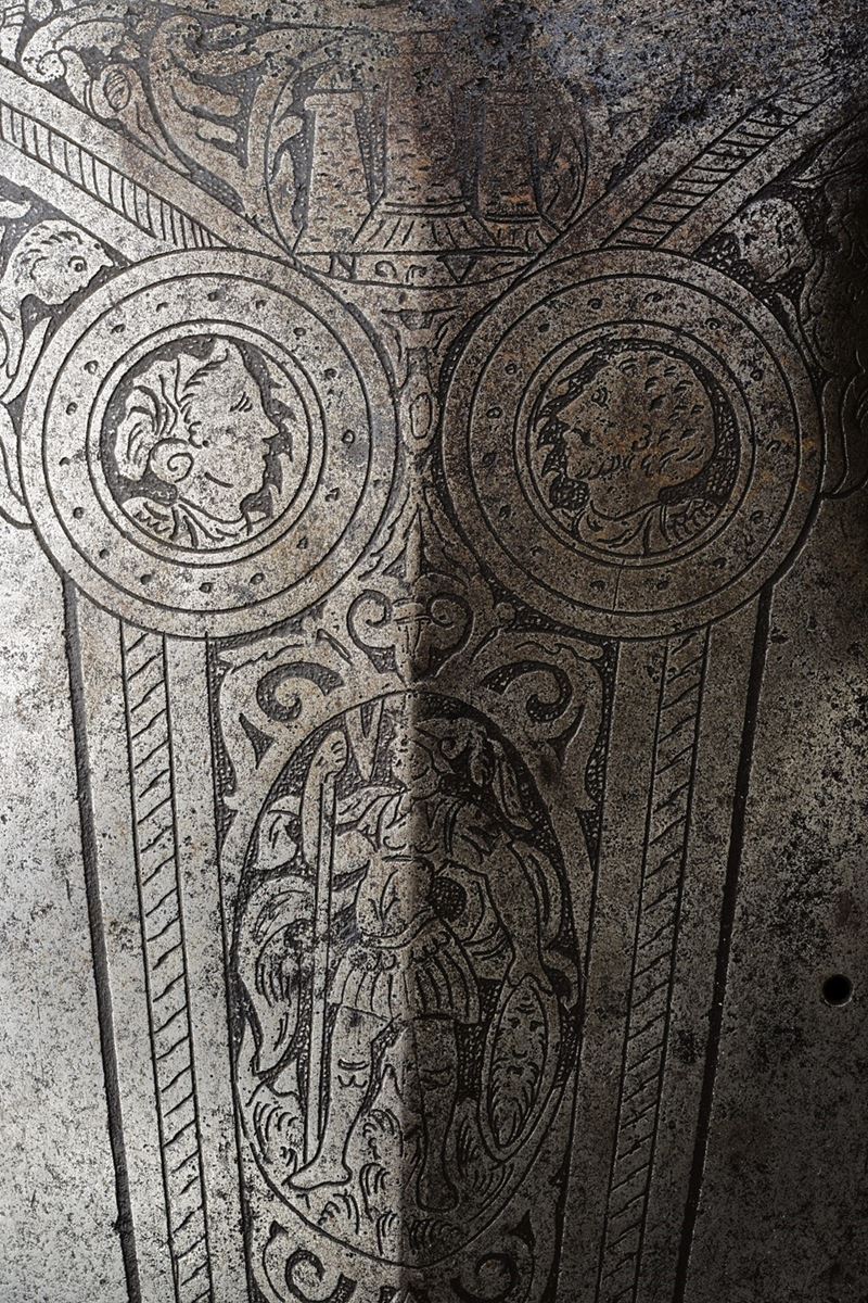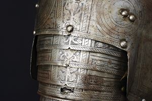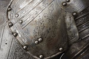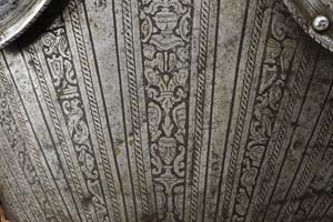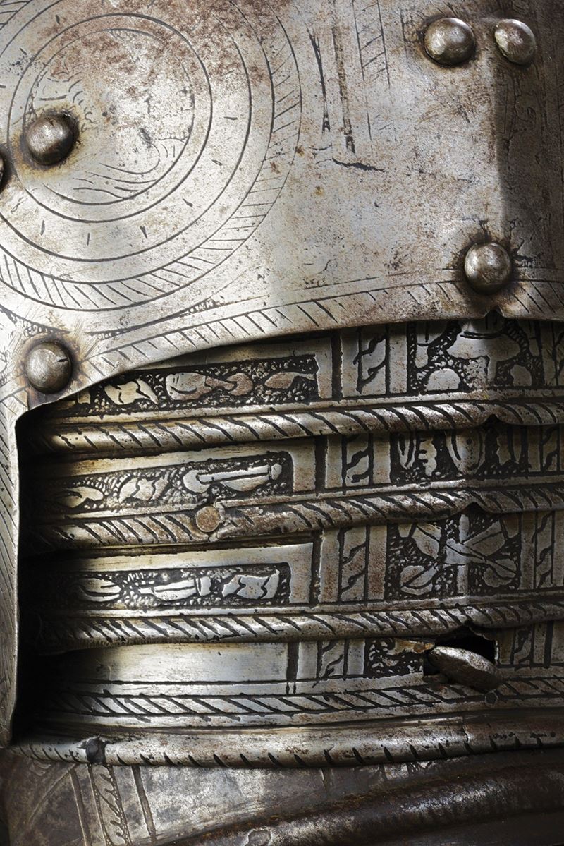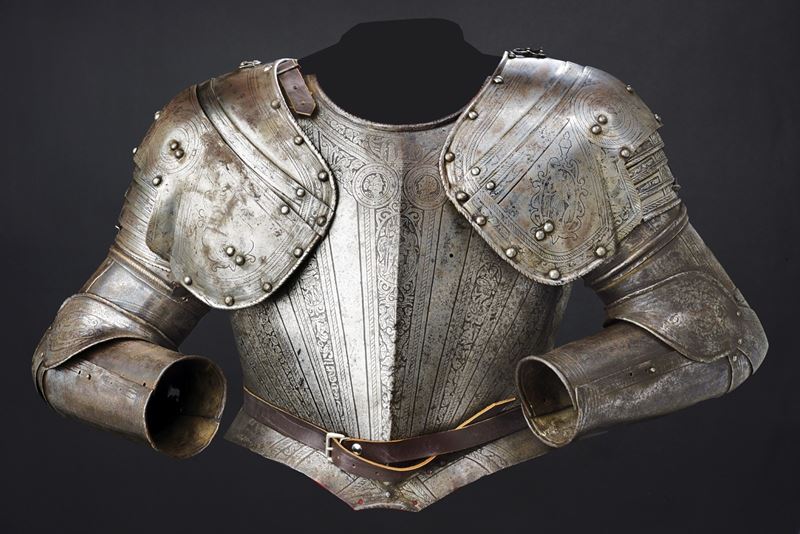 Iron breastplate and backplate, relevant, surfaces completely engraved with bands, medallions and trophies of arms, alternating with other polished areas; on the neckline, a cartouche surmounted by three towers and the initials "N V", attributed to the Master of the Castle. Not pertinent full brassards and some parts of the engravings are refreshed. Modern leather strings and repairs.