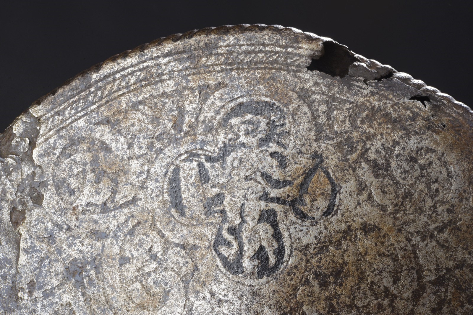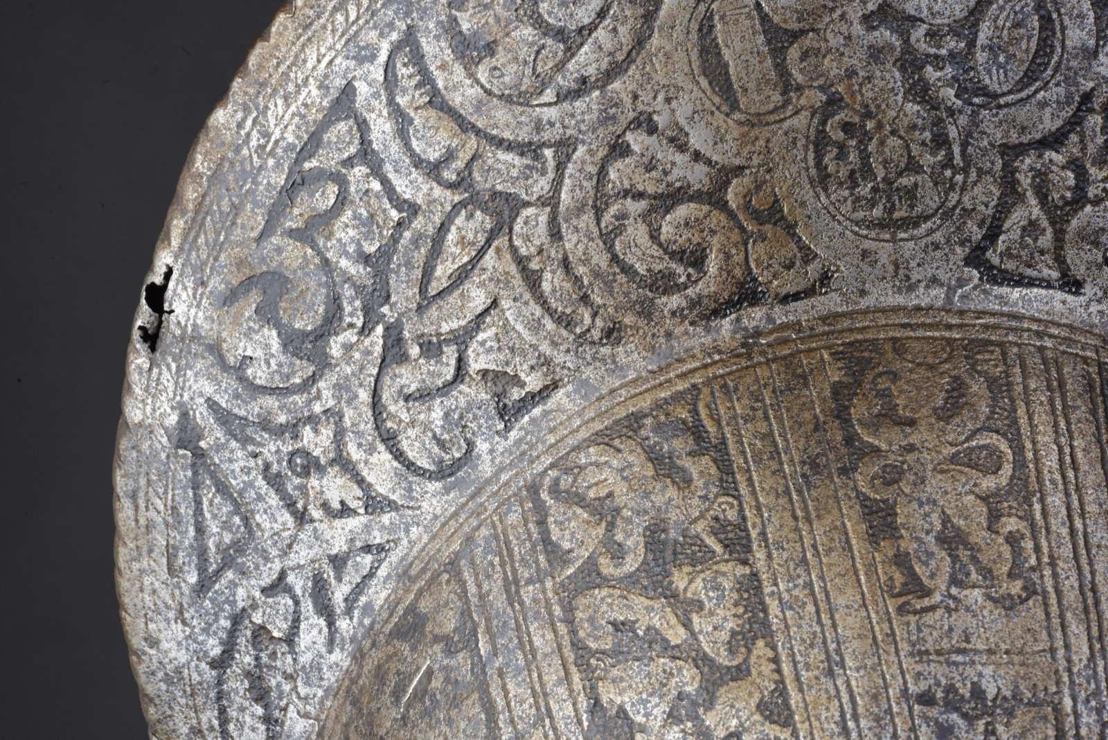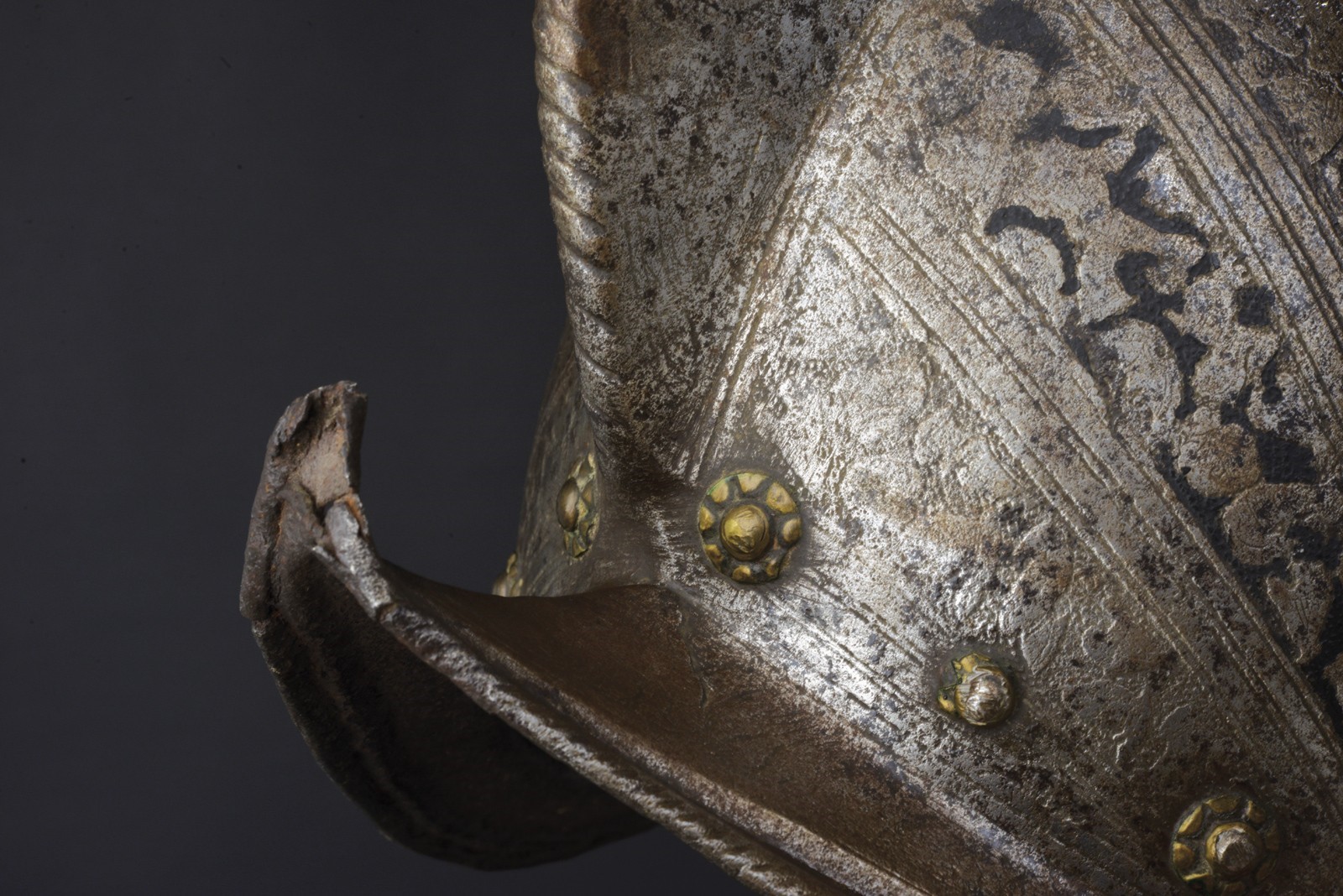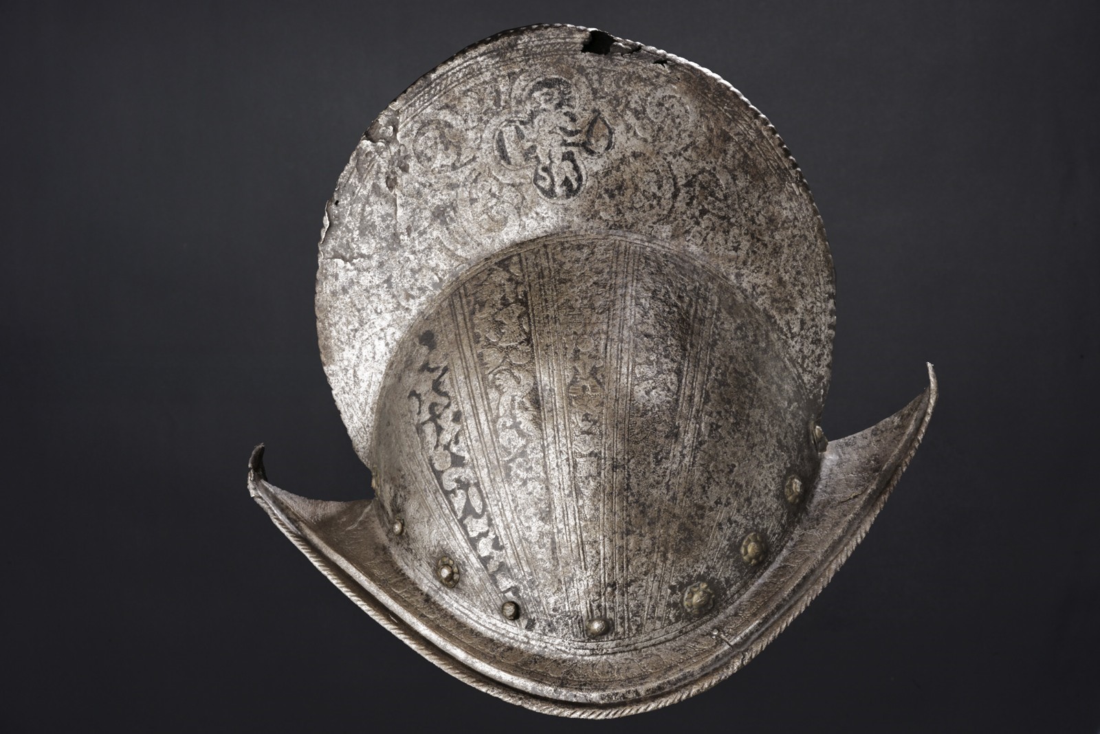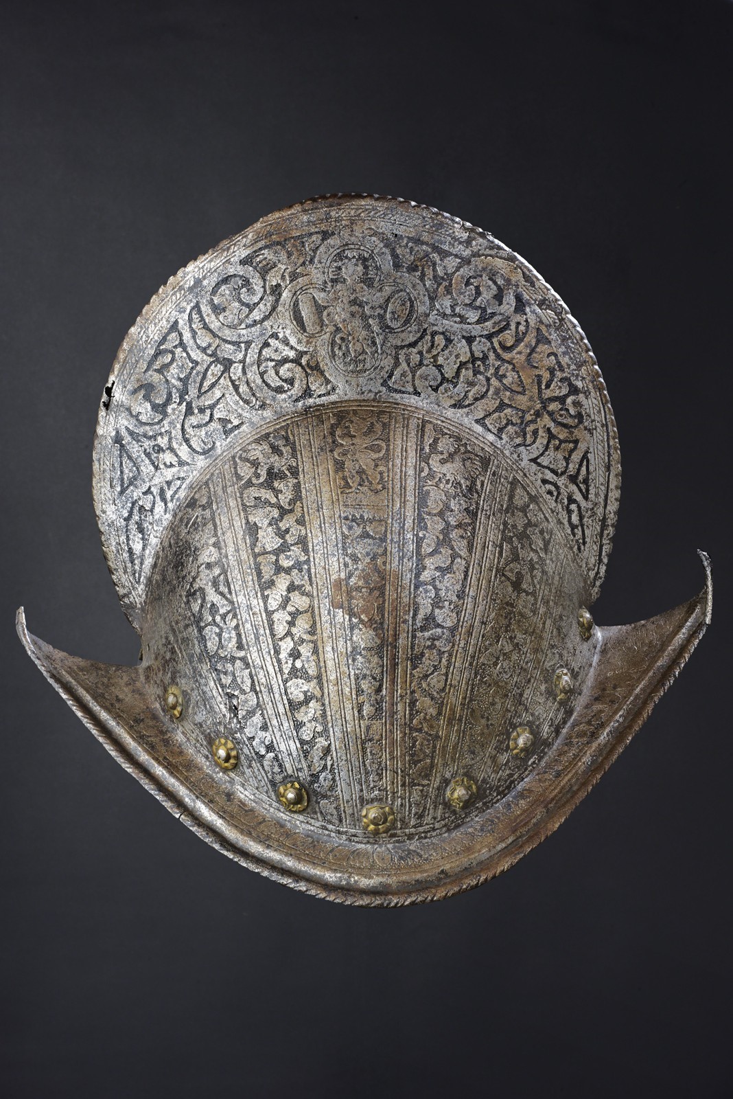 Single-piece iron skull, high crest (damaged); decorated all over with scrolls and medallions on the crest, alternating bands with outlines and trophies of arms. Boat-shaped rim engraved with foliage, lowered and twisted along the edge. The base of the skull with iron rivets and brass rosettes. Missing plume-holder.