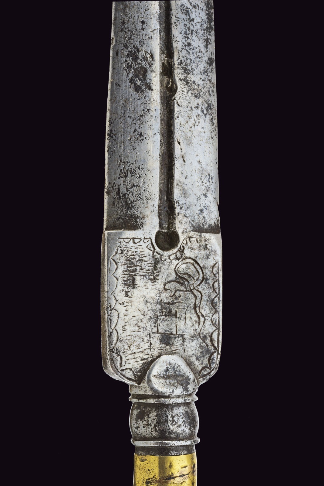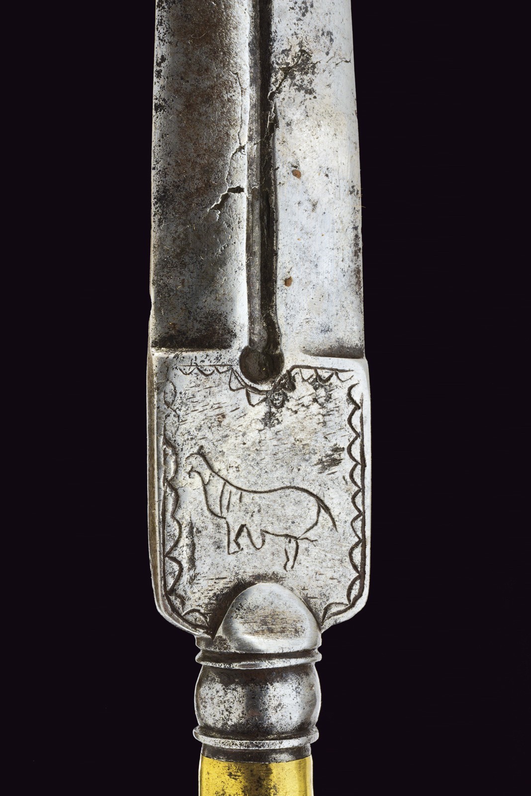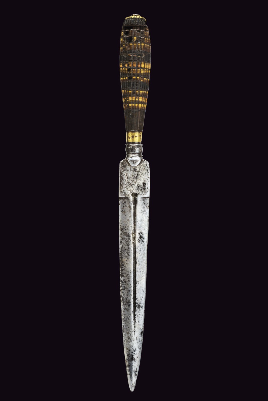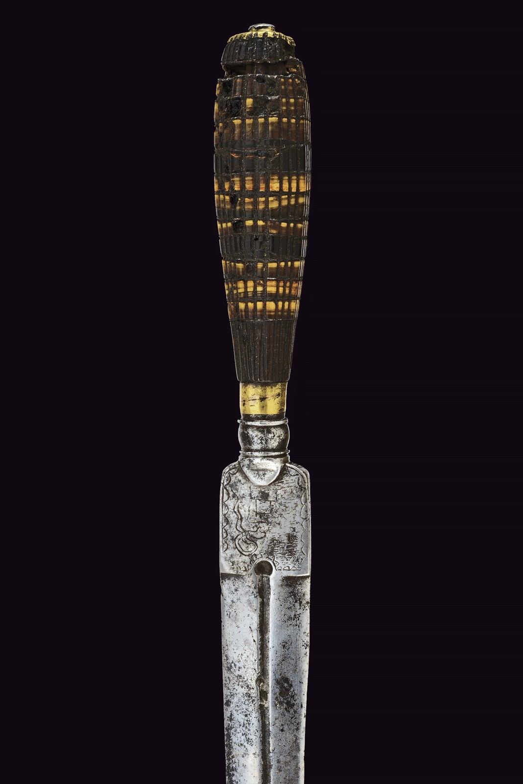Double-edged blade, with central fuller and square tang, with remains of engraved decorations. Flattened, round knot with small frames. Smooth, brass ring nut. Faceted grip divided in horn and bone (alterned) sectors, separated by brass discs. Shaped, brass cap.