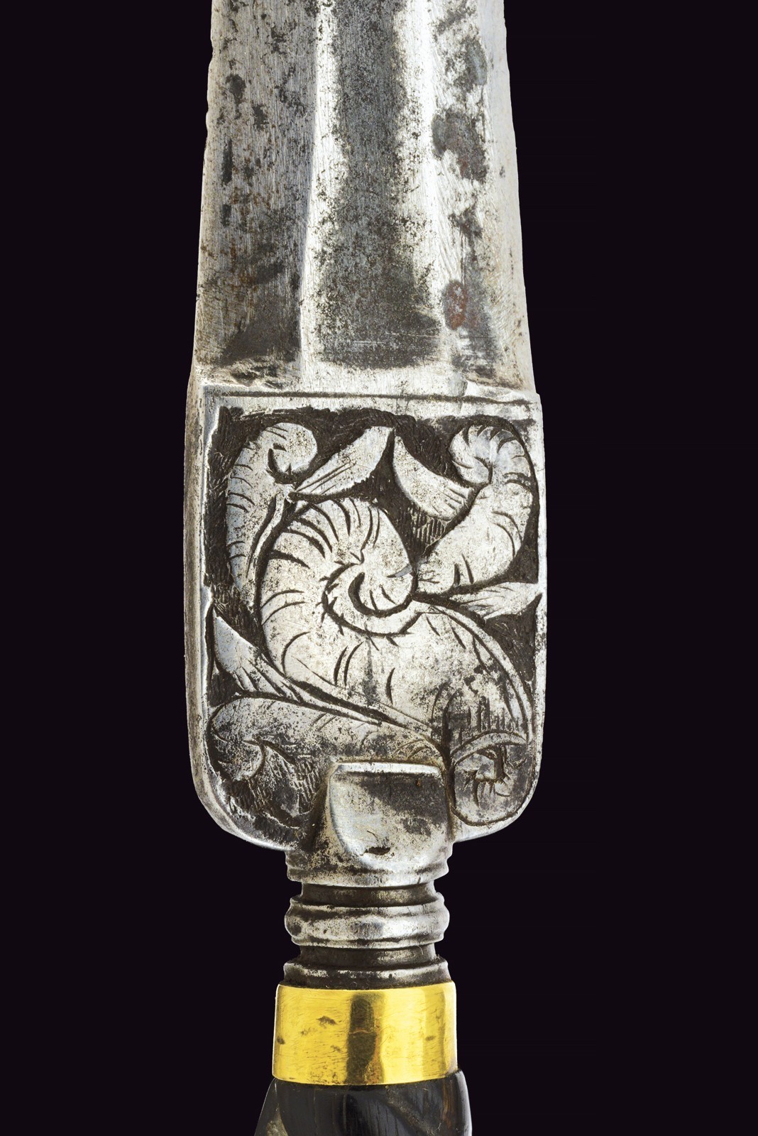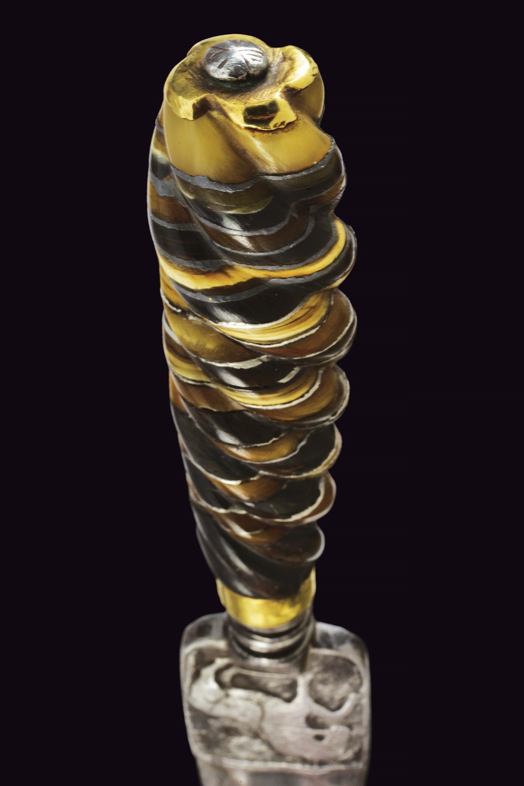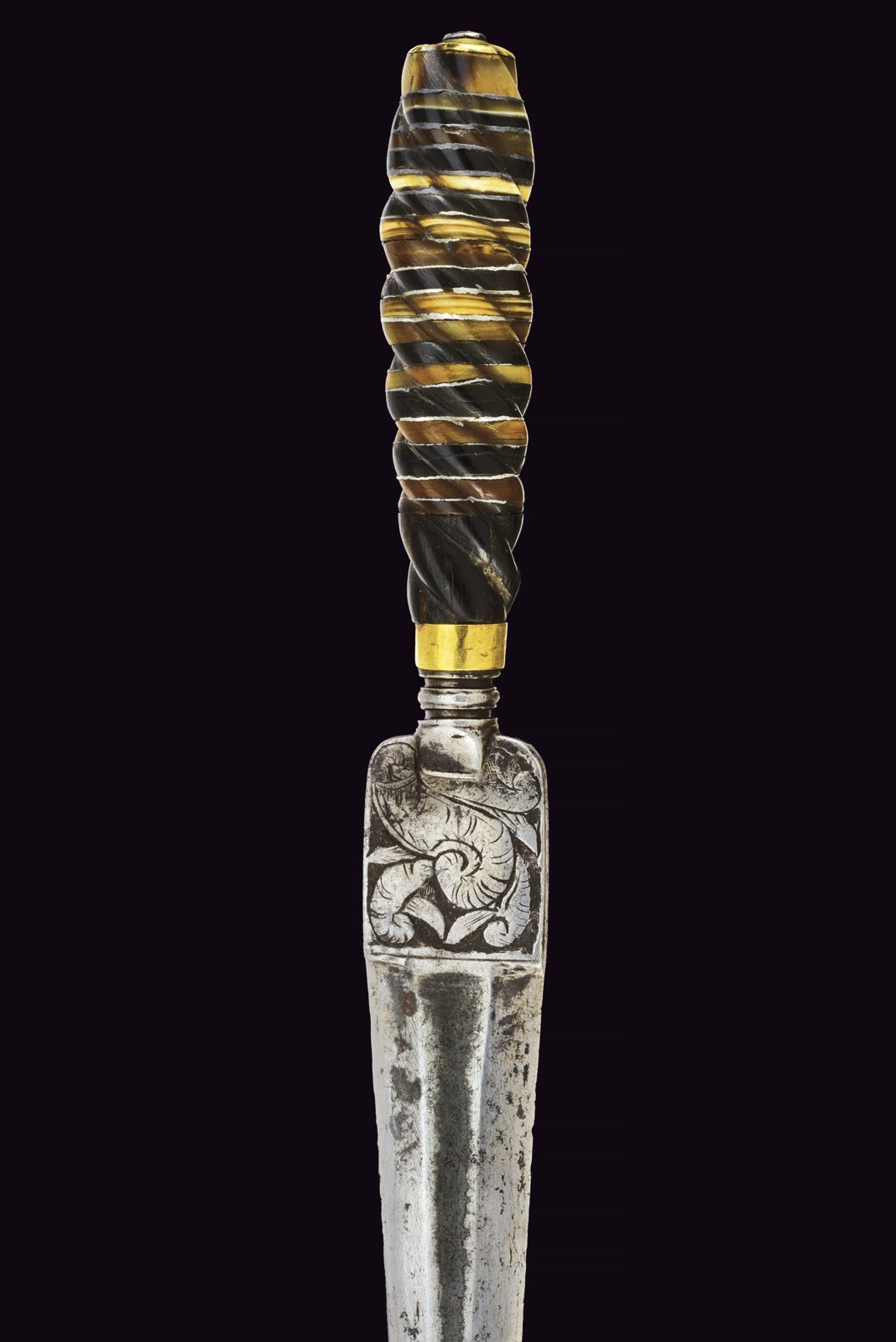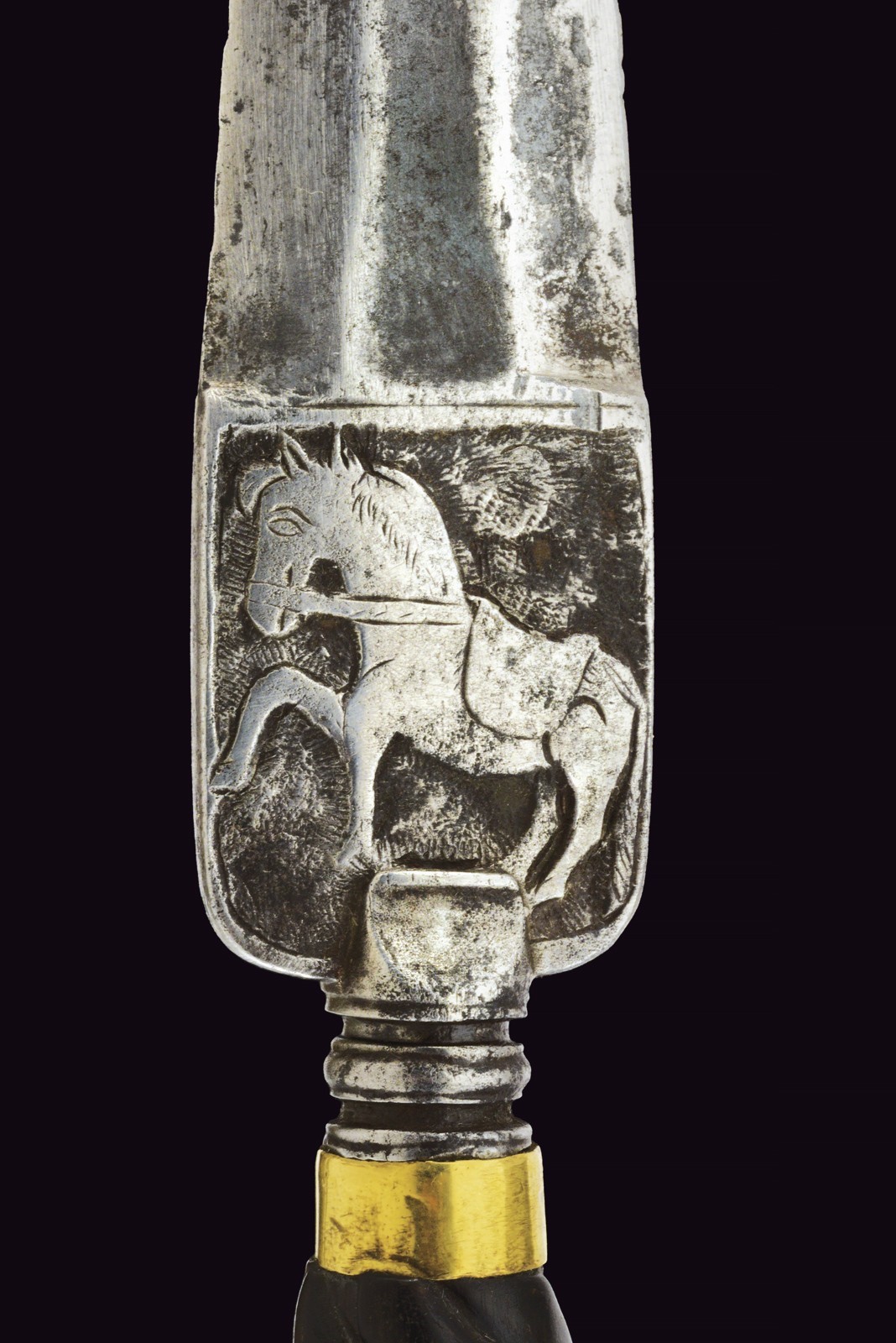Triangular blade with three flat sides, rectangular tang carved in bas-relief with a horse and fantastical animals. Cushion grip. Twisted, raised grip, divided in sectors made of horn in different colours and others made of bone. Smooth, brass ring nut and cap.