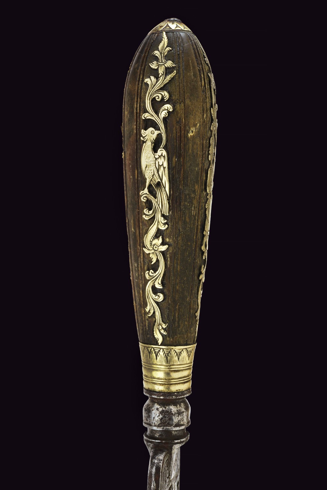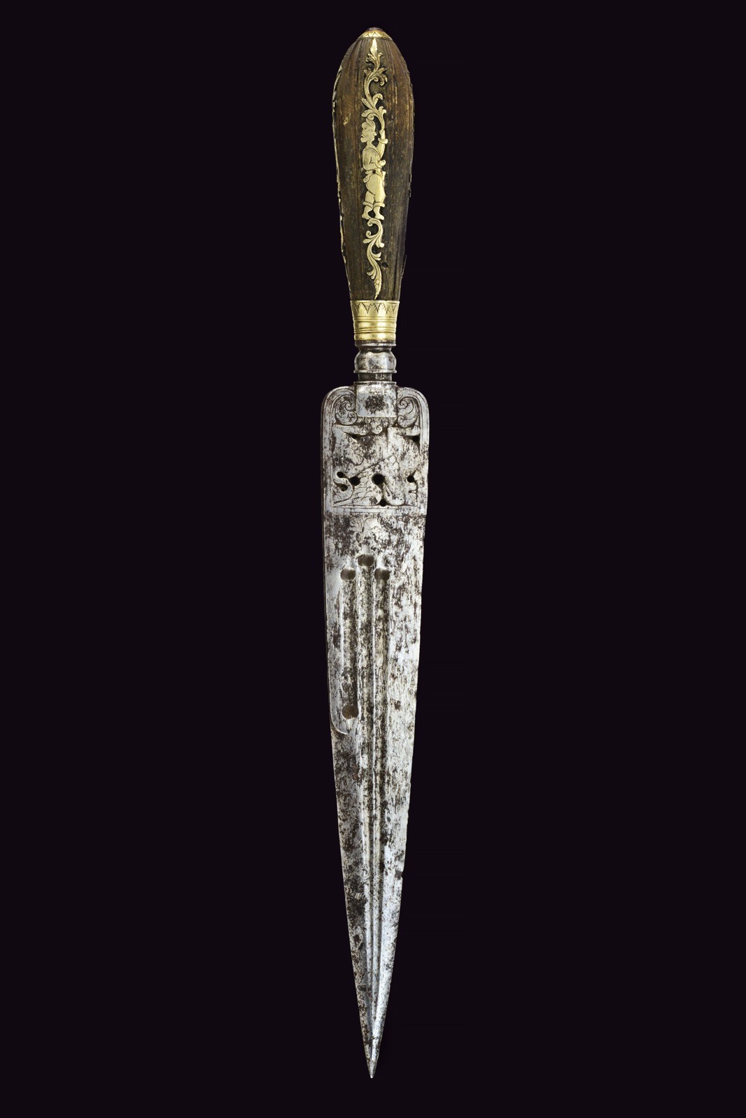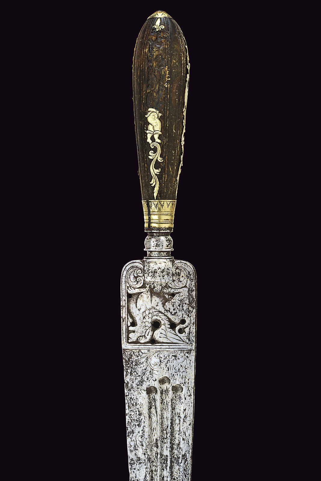 Single-and-false-edged blade, with triple fuller; fretwork tang decorated with winged sphinxes and punched spirals. Strongly grooved and faceted knot, brass ring nut with small frames and punched with geometric motifs. Faceted, raised, horn (?) grip, with inlays of animal figures, men and spirals (partially missing) made of white metal. Small cap en suite.