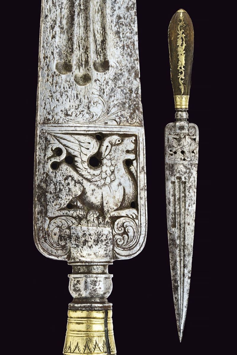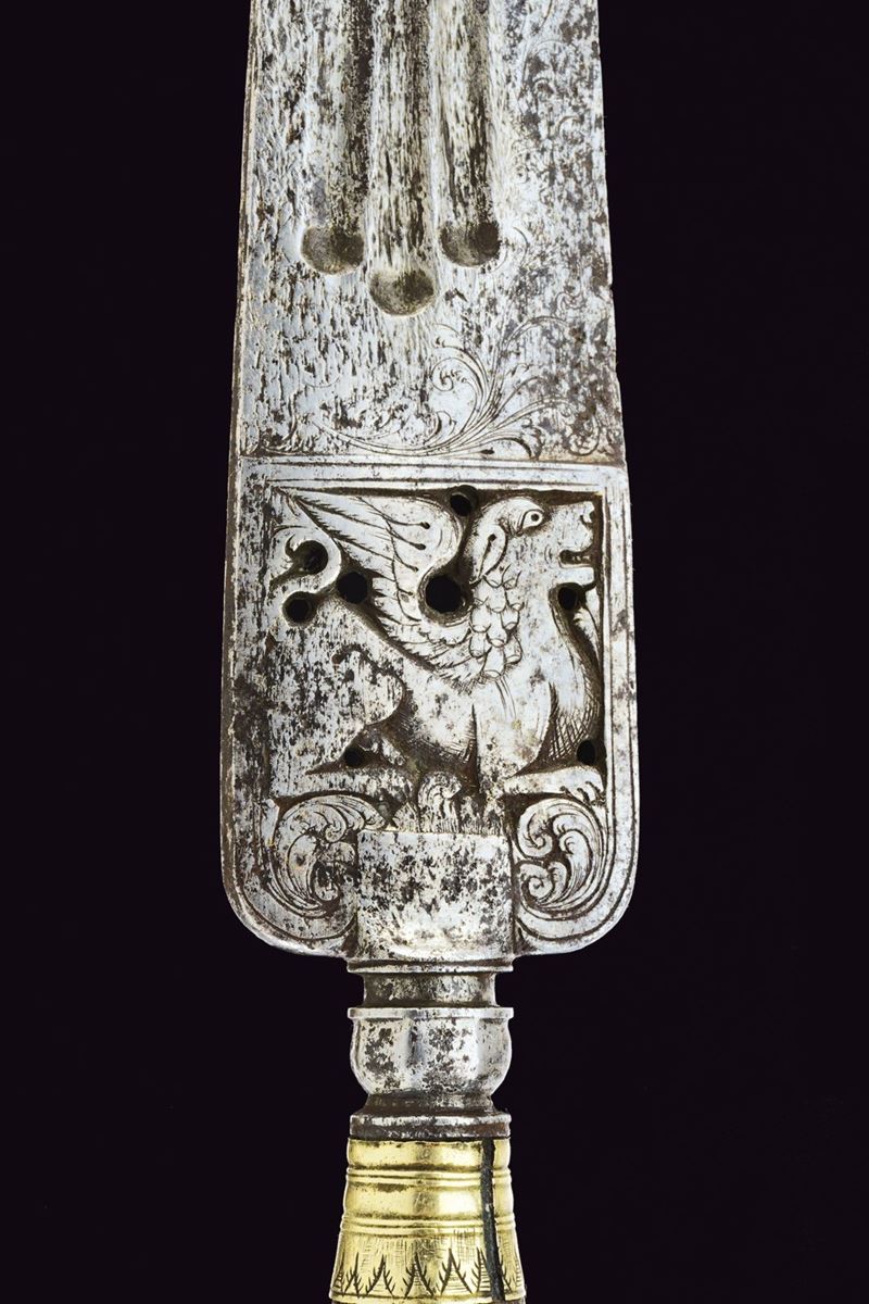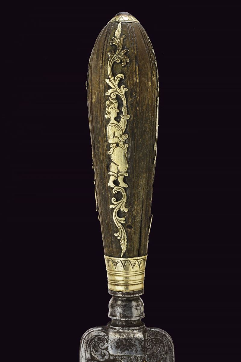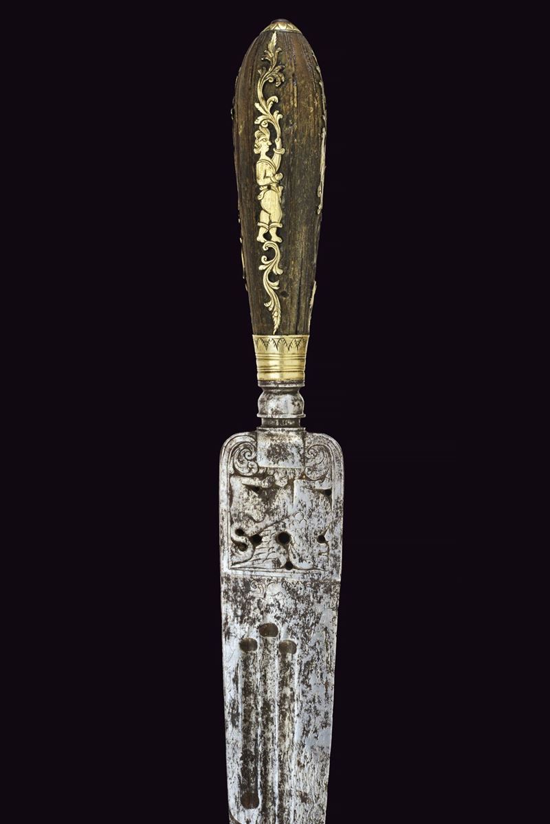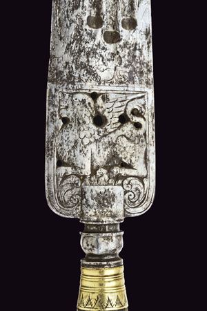 Single-and-false-edged blade, with triple fuller; fretwork tang decorated with winged sphinxes and punched spirals. Strongly grooved and faceted knot, brass ring nut with small frames and punched with geometric motifs. Faceted, raised, horn (?) grip, with inlays of animal figures, men and spirals (partially missing) made of white metal. Small cap en suite.