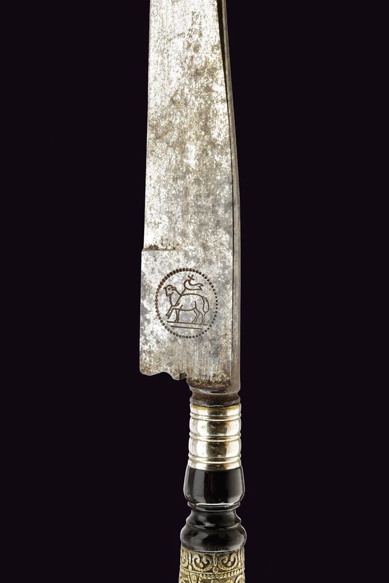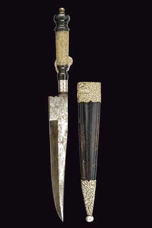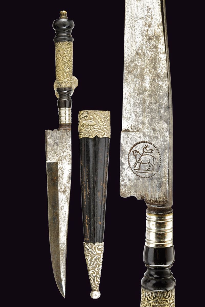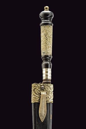 Single-edged blade with mark on the tang. Fluted silver ring-nut. Spool-shaped horn handle with central section in silver decorated with floral and geometric motifs. Original leather scabbard decorated en suite.