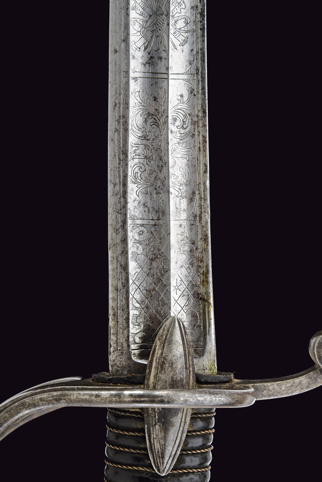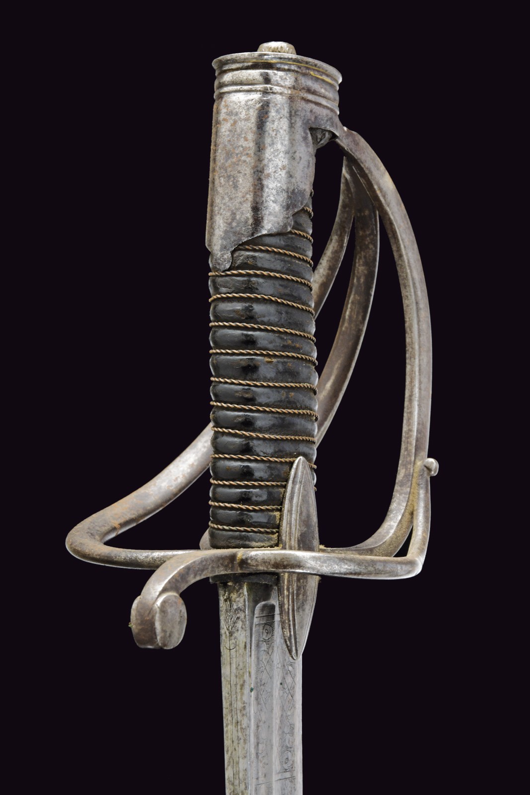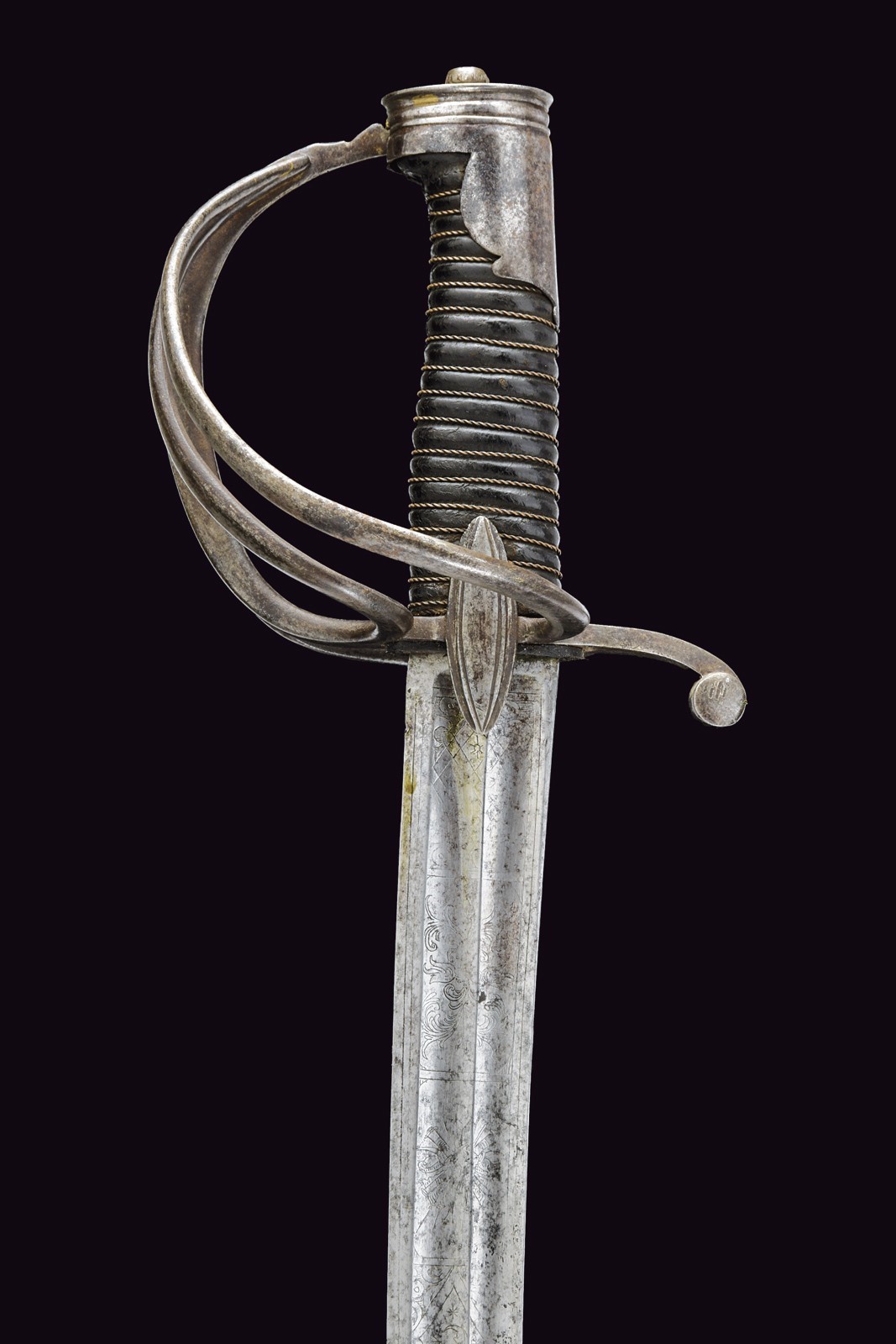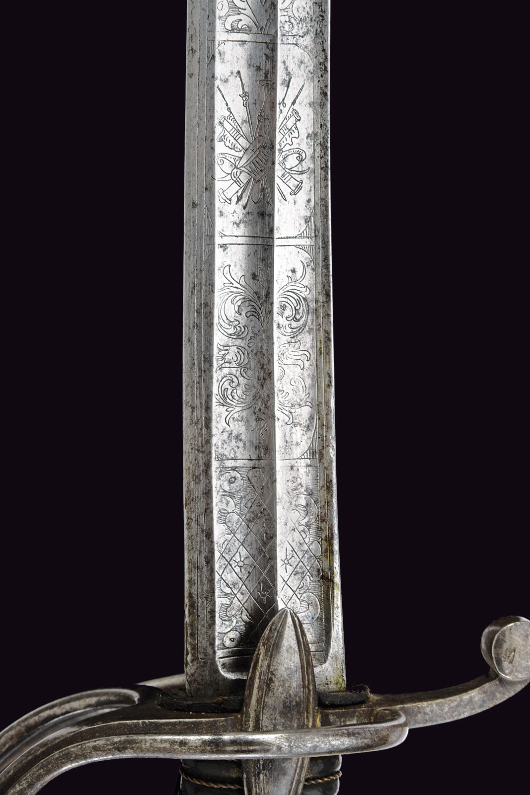 Broad, curved, single-and false-edged blade and double fullers: the back fuller bifurcates after the first quarter. The forte is engraved with a Pandur head, crescent moon, stars, trophies and floral motifs. Short ricasso; the rear part engraved with an arrow. Iron hilt with guard featuring three loop-guards, langets, and a short smooth cap; leather-covered grip with wire binding. Iron scabbard without mounts, except for the drag.