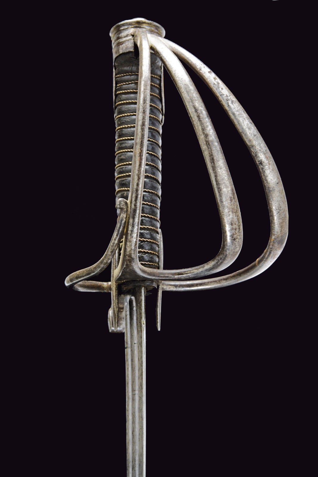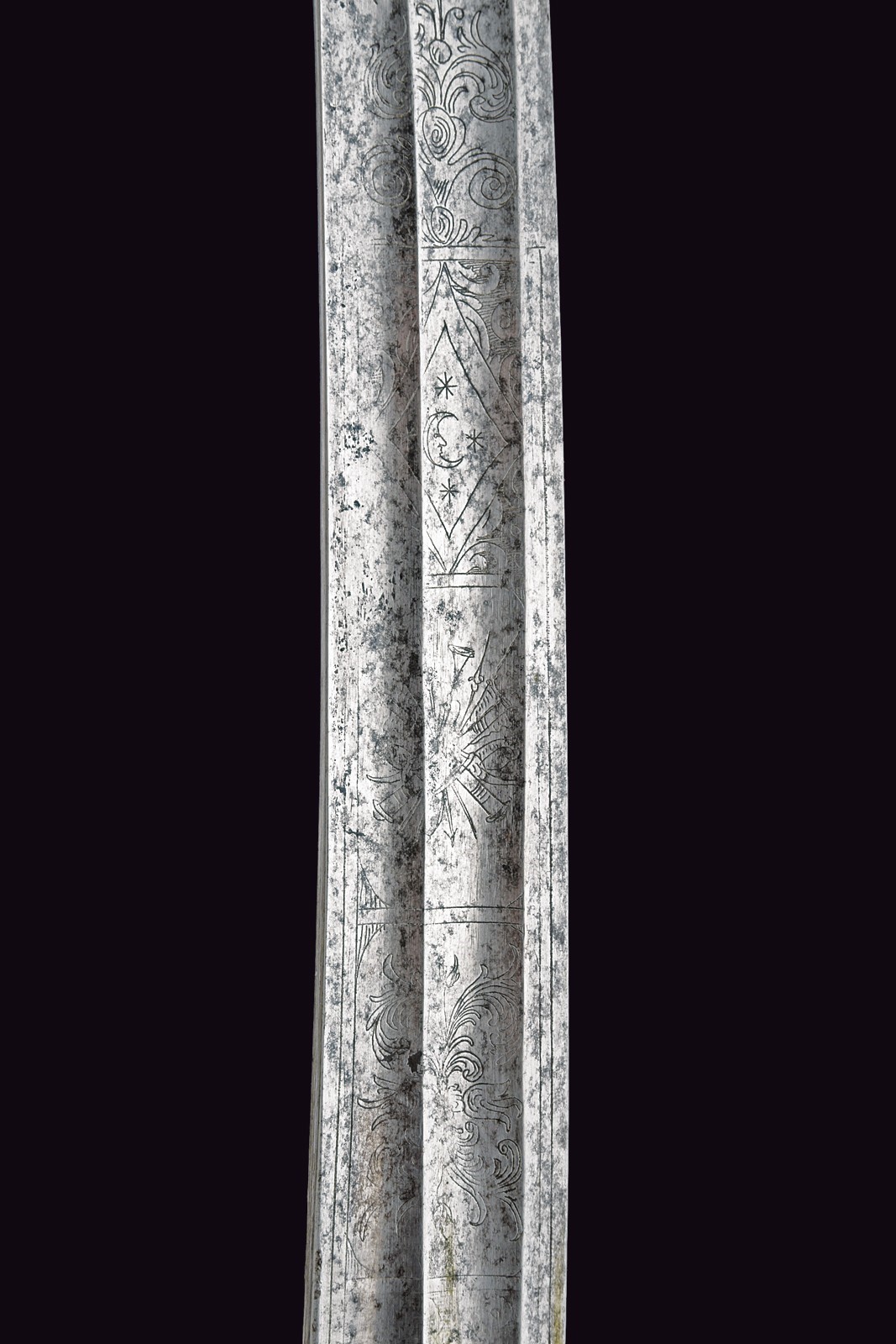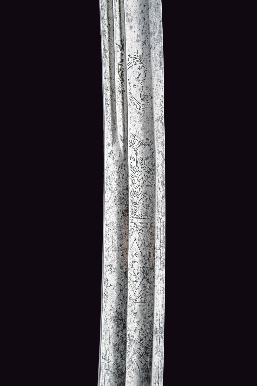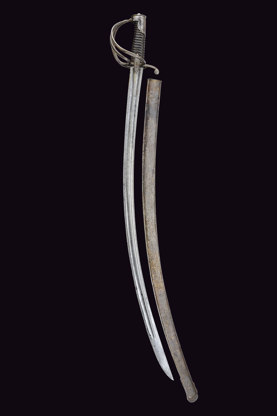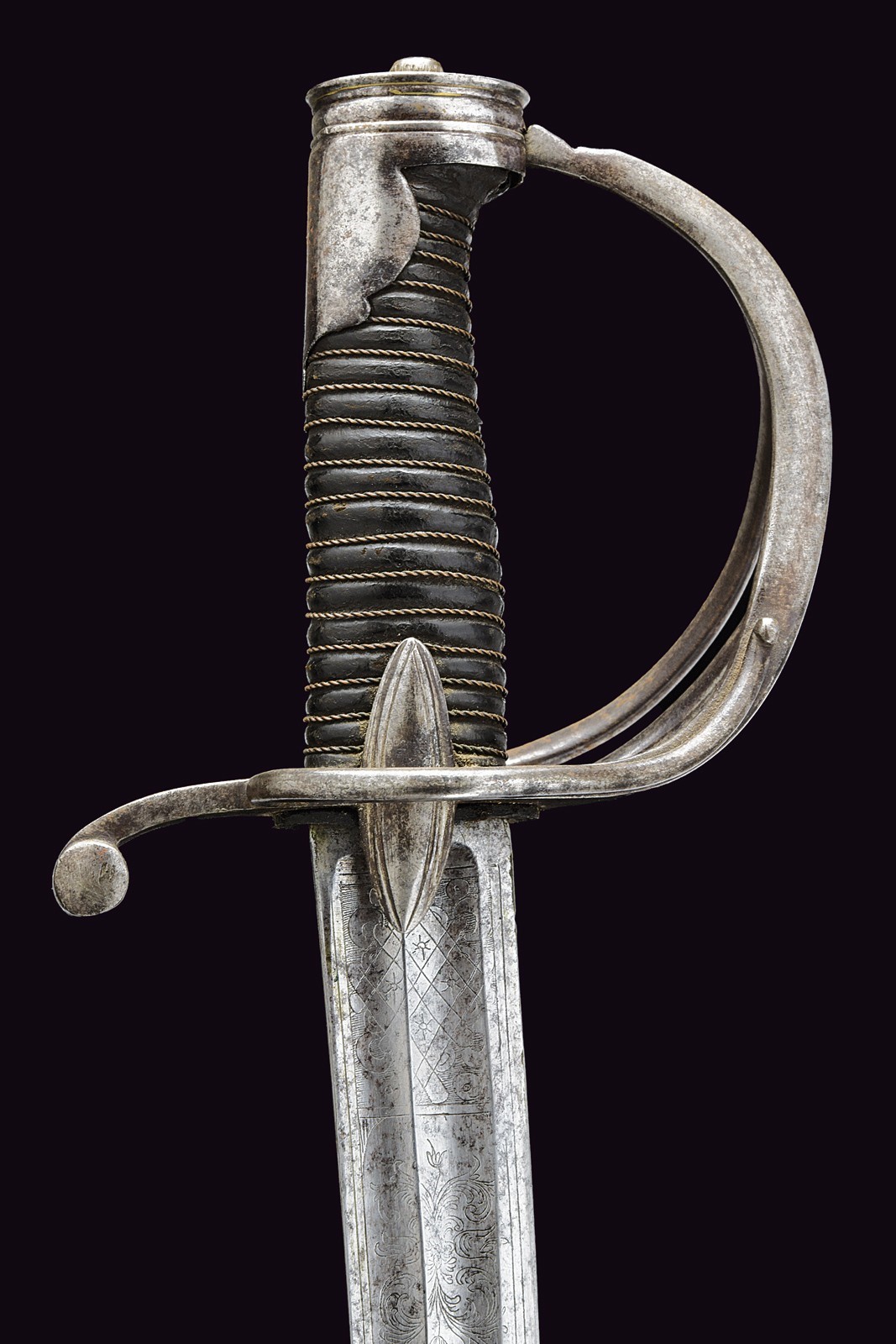 Broad, curved, single-and false-edged blade and double fullers: the back fuller bifurcates after the first quarter. The forte is engraved with a Pandur head, crescent moon, stars, trophies and floral motifs. Short ricasso; the rear part engraved with an arrow. Iron hilt with guard featuring three loop-guards, langets, and a short smooth cap; leather-covered grip with wire binding. Iron scabbard without mounts, except for the drag.