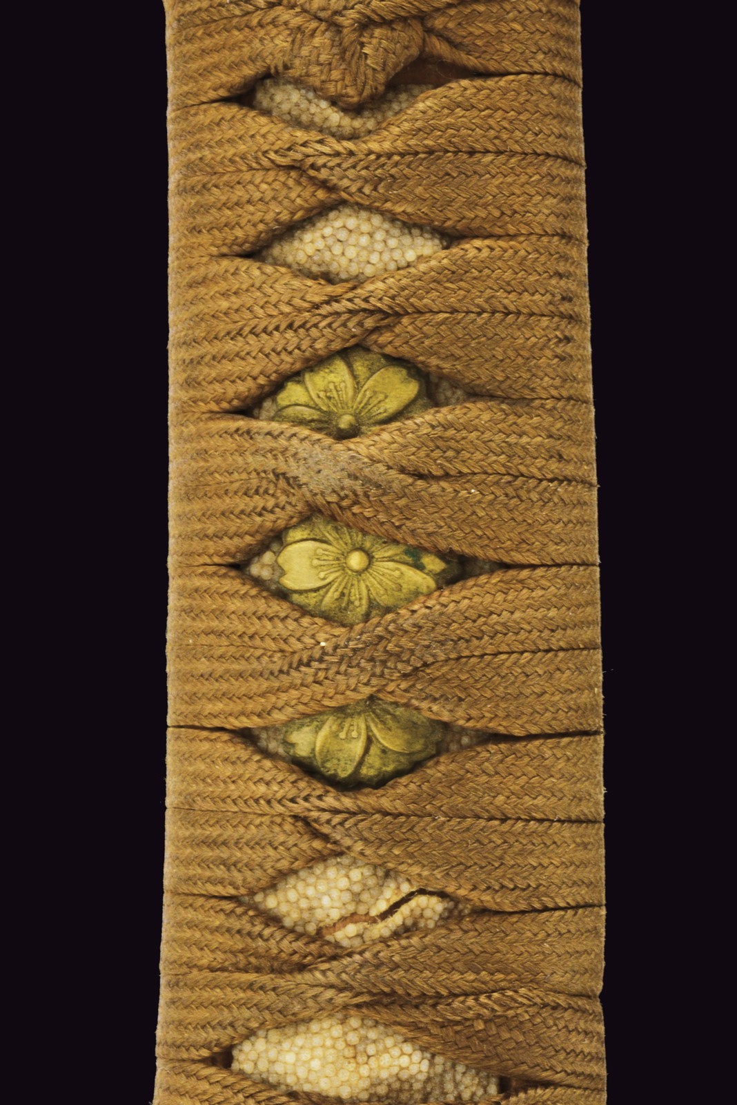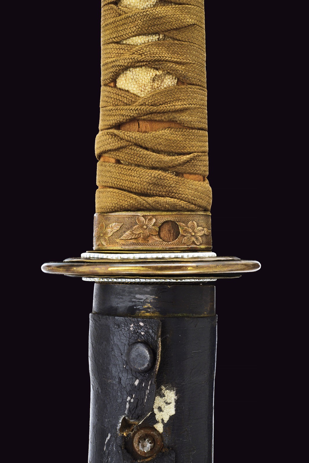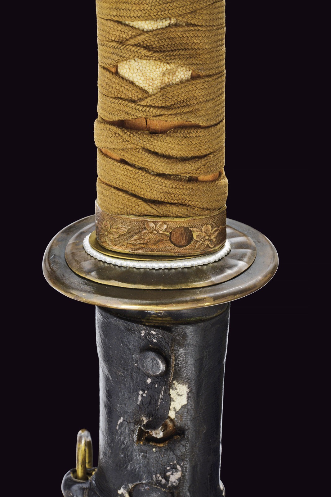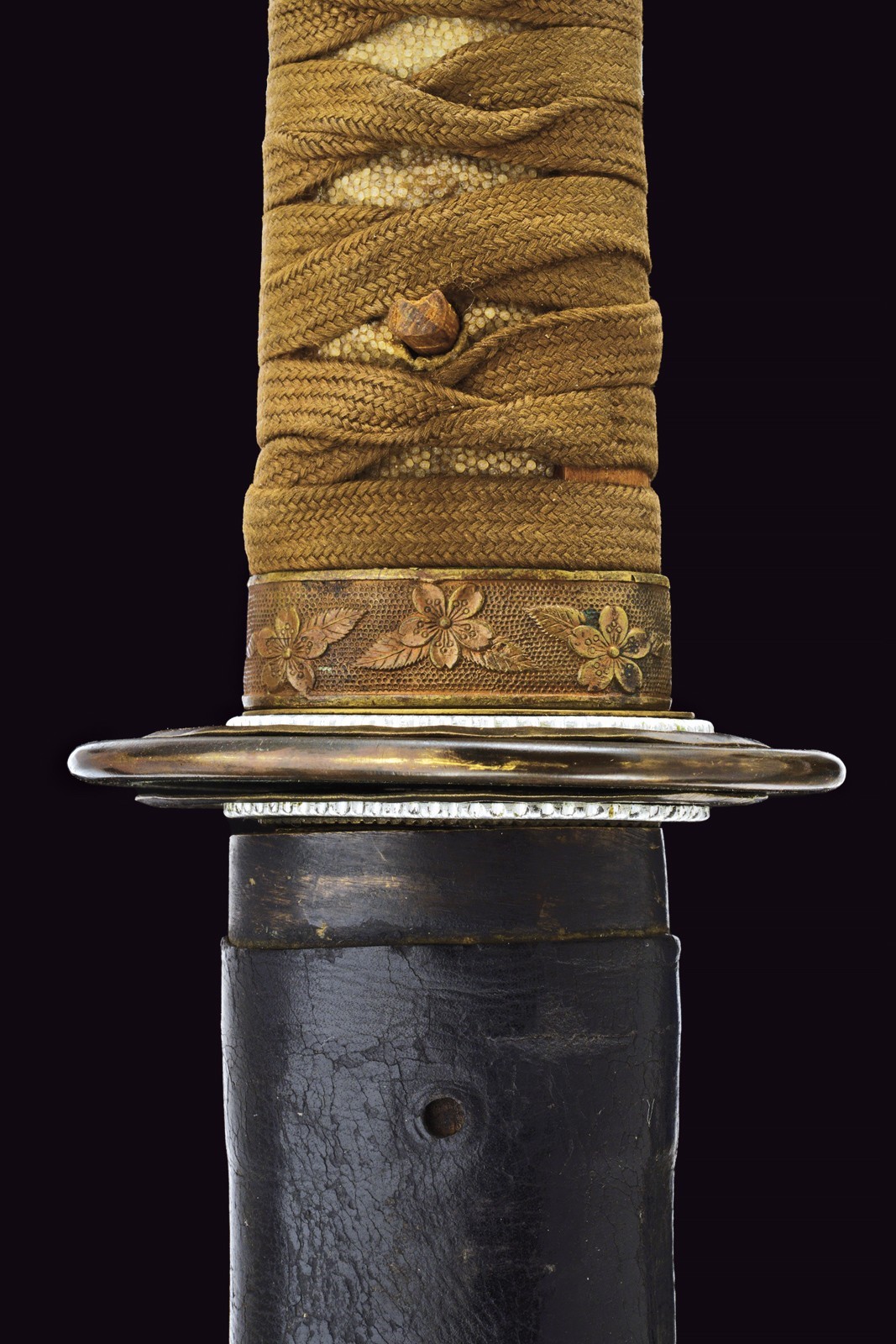 Shinogi-zukuri blade, Iori-mune (Nagasa 65.5 cm) with hamon and hada not discernible. Slight signs of use and age. Nakago with two Mekugi-ana, one Mei to be identified (perhaps: ‘Nakamura Sada Saku’). No arsenal stamps. Brass-coloured metal Habaki. In Koshirae of the military navy type (perhaps with some later replacements). Tsuba in brass-coloured metal. Fuchi-kashira with cherry blossoms, the first with a hole for the release button (which is not present on the fitting). Old Tsuka-ito in beige silk with signs of use and age, partially to be re-tied. Tsuka with Samè in stingray leather. Menuki with cherry blossoms. Saya in plain wood without finish, with leather cover and single lug.