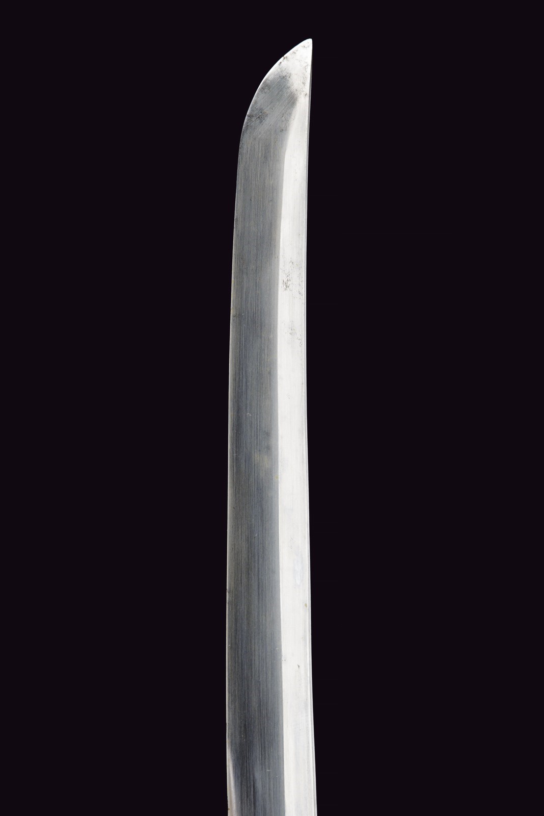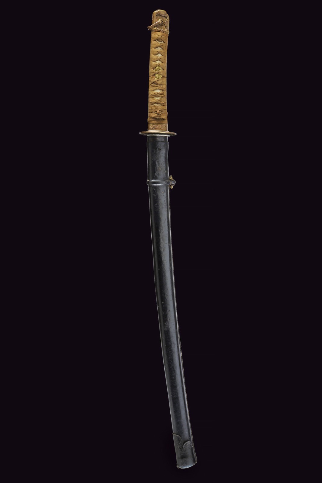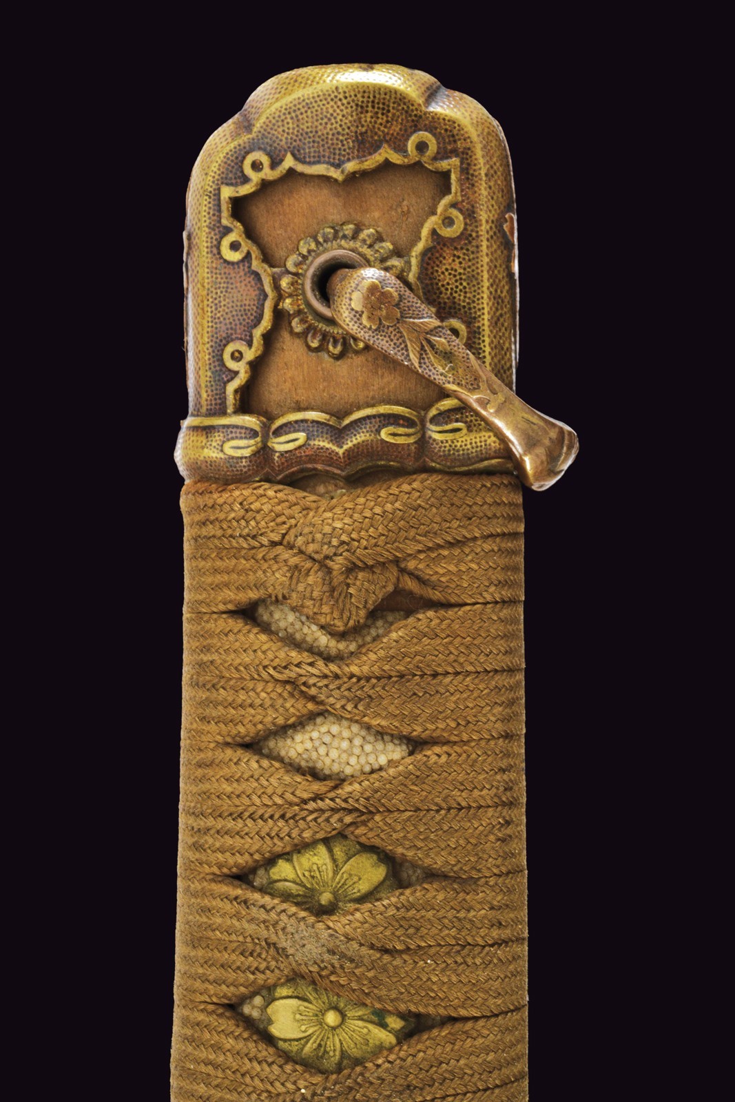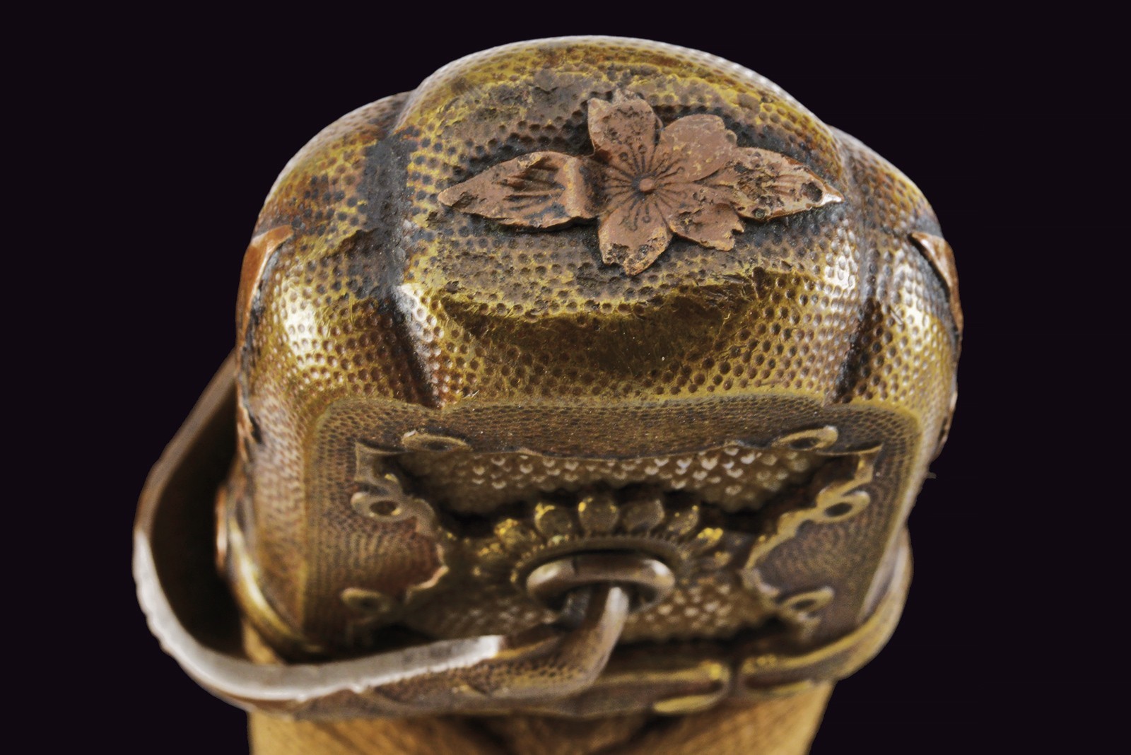 Shinogi-zukuri blade, Iori-mune (Nagasa 65.5 cm) with hamon and hada not discernible. Slight signs of use and age. Nakago with two Mekugi-ana, one Mei to be identified (perhaps: ‘Nakamura Sada Saku’). No arsenal stamps. Brass-coloured metal Habaki. In Koshirae of the military navy type (perhaps with some later replacements). Tsuba in brass-coloured metal. Fuchi-kashira with cherry blossoms, the first with a hole for the release button (which is not present on the fitting). Old Tsuka-ito in beige silk with signs of use and age, partially to be re-tied. Tsuka with Samè in stingray leather. Menuki with cherry blossoms. Saya in plain wood without finish, with leather cover and single lug.