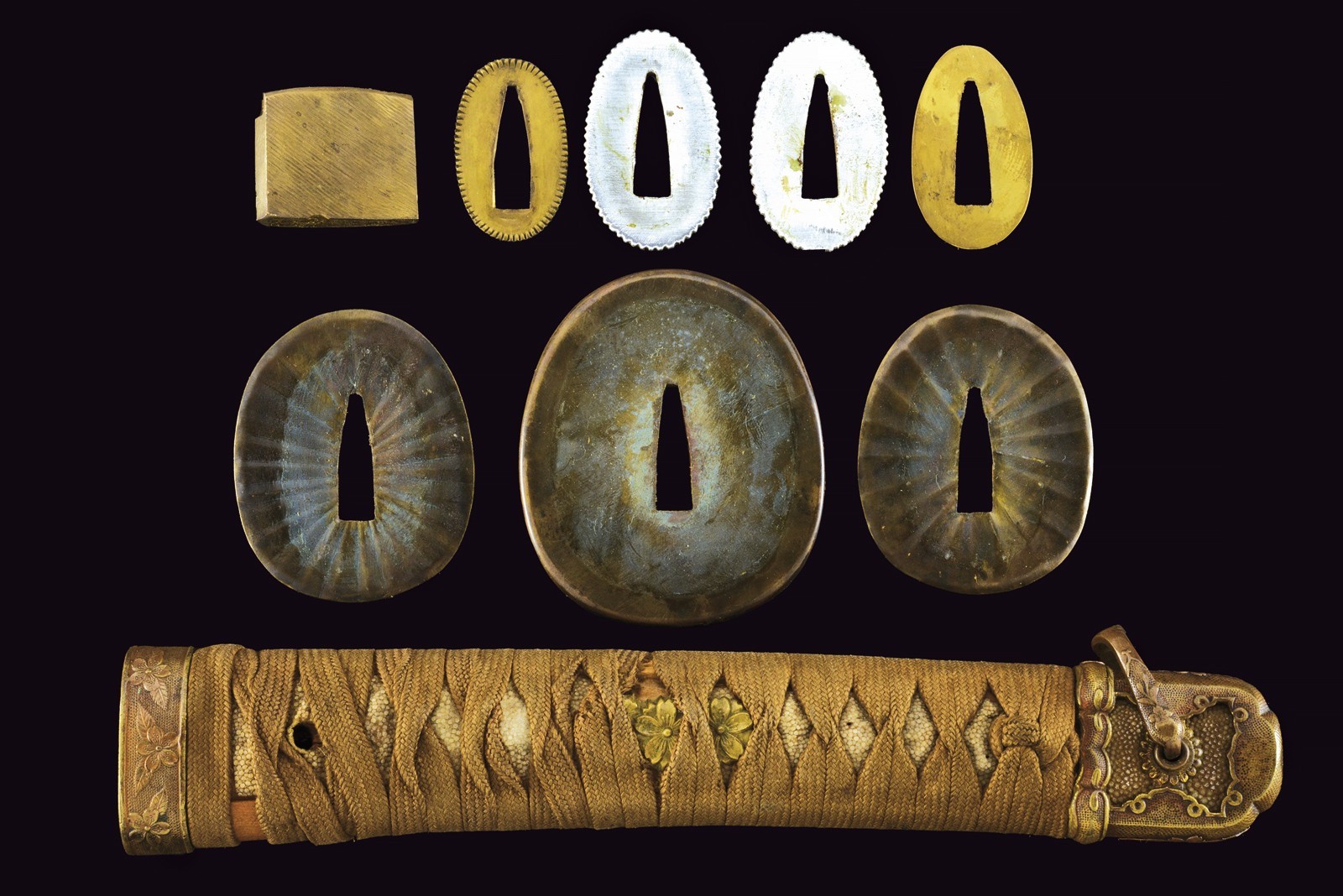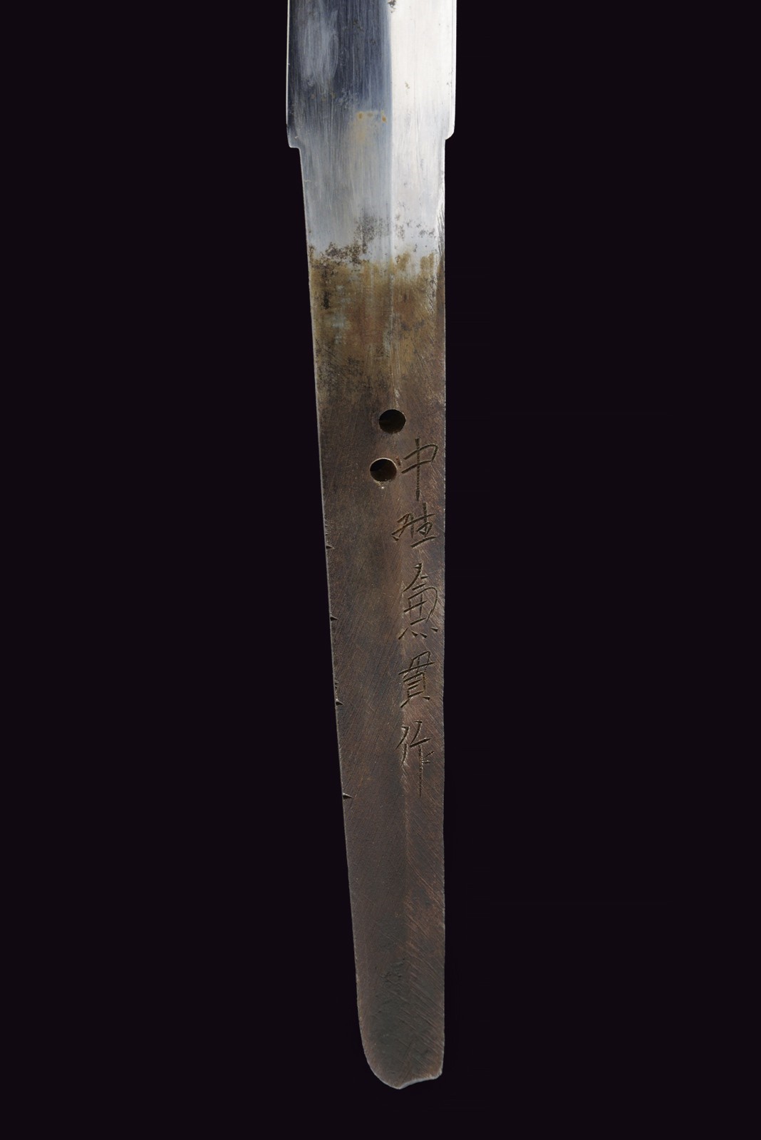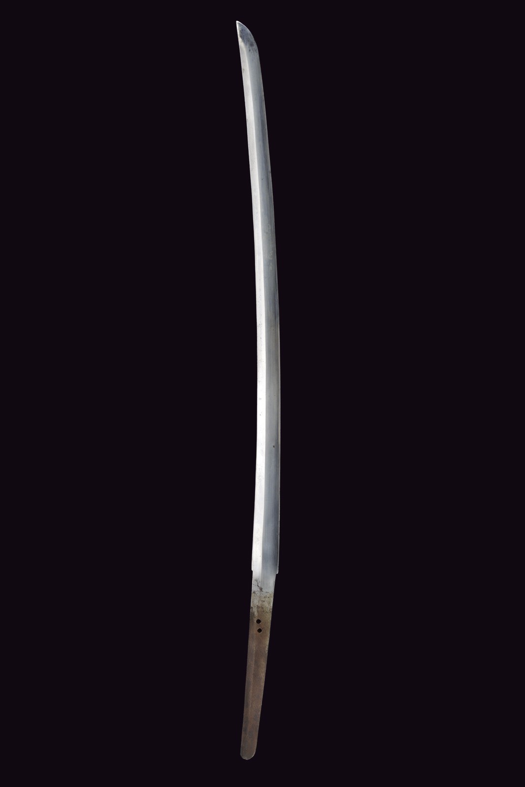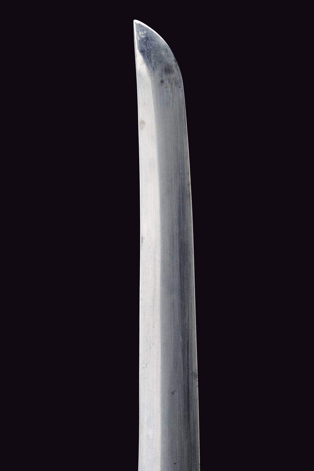 Shinogi-zukuri blade, Iori-mune (Nagasa 65.5 cm) with hamon and hada not discernible. Slight signs of use and age. Nakago with two Mekugi-ana, one Mei to be identified (perhaps: ‘Nakamura Sada Saku’). No arsenal stamps. Brass-coloured metal Habaki. In Koshirae of the military navy type (perhaps with some later replacements). Tsuba in brass-coloured metal. Fuchi-kashira with cherry blossoms, the first with a hole for the release button (which is not present on the fitting). Old Tsuka-ito in beige silk with signs of use and age, partially to be re-tied. Tsuka with Samè in stingray leather. Menuki with cherry blossoms. Saya in plain wood without finish, with leather cover and single lug.