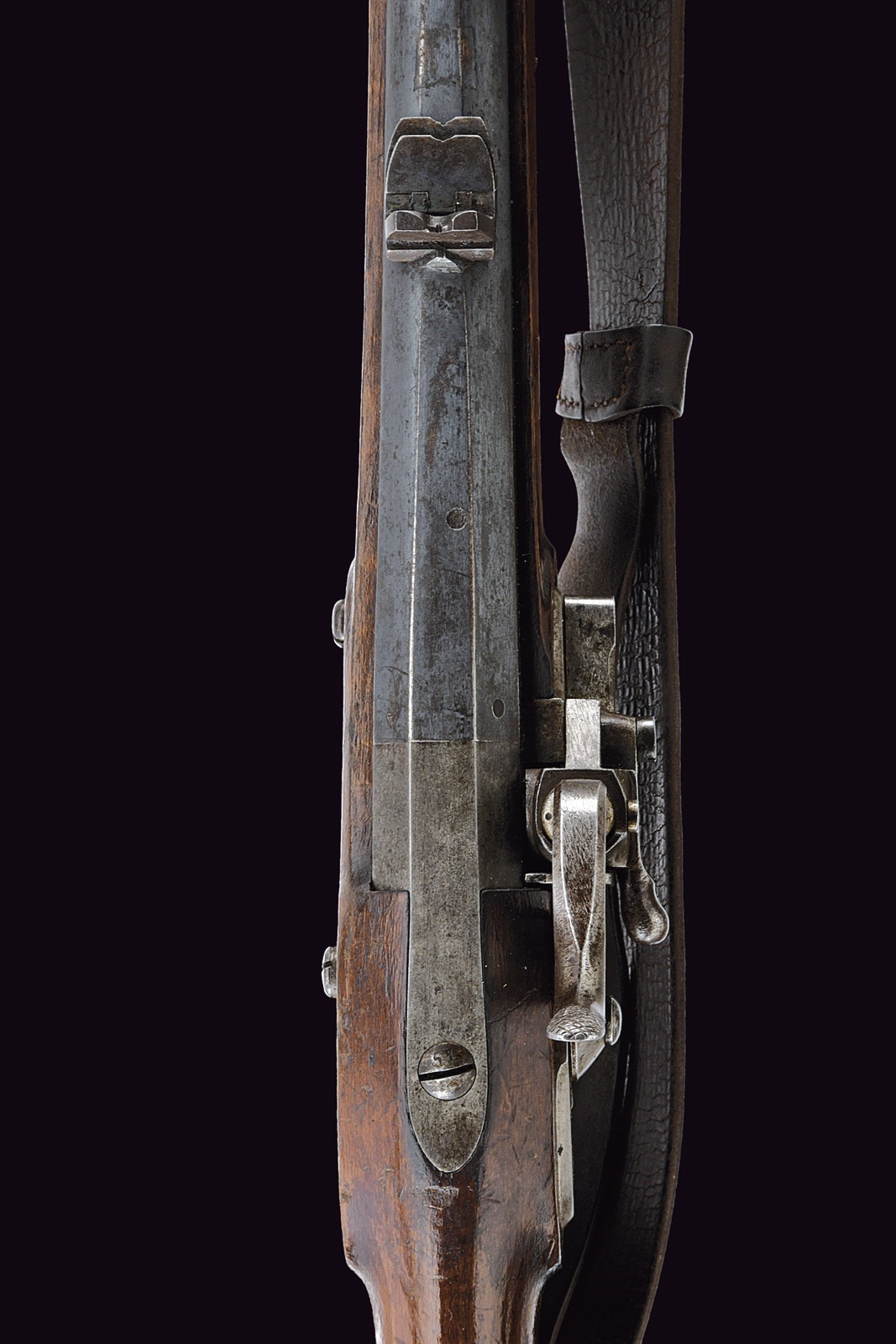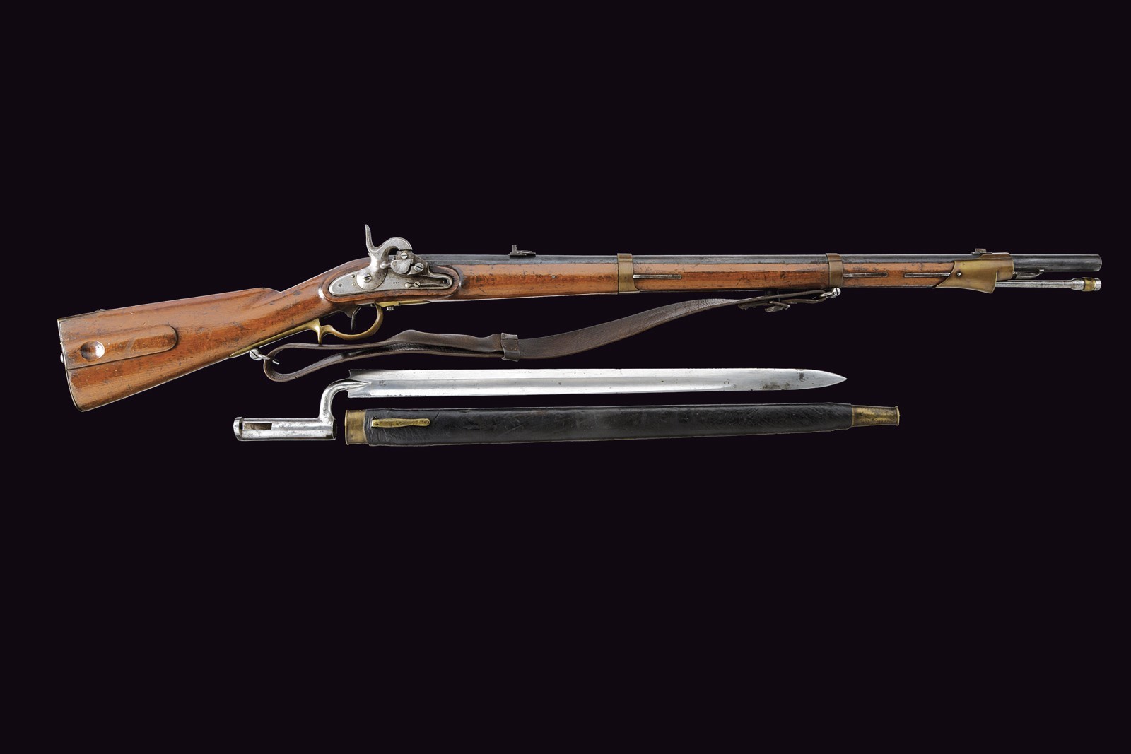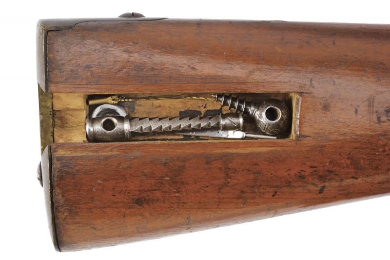 Rifled, 18 mm cal. barrel (bore with some pitting but clearly visible rifling), octagonal at the first part with sun mark and another not clearly legible marking, then round towards the nozzle with clutch for the bayonet; fixed rear sight with two folding leaves, foresight. Smooth tang. Augustin system lock, dated “847” and featuring the Imperial eagle. Wooden full stock with various marks and patchbox. Complete with Laukart bayonet featuring several marks and with scabbard. Leather shoulder strap and three small cleaning tools included.