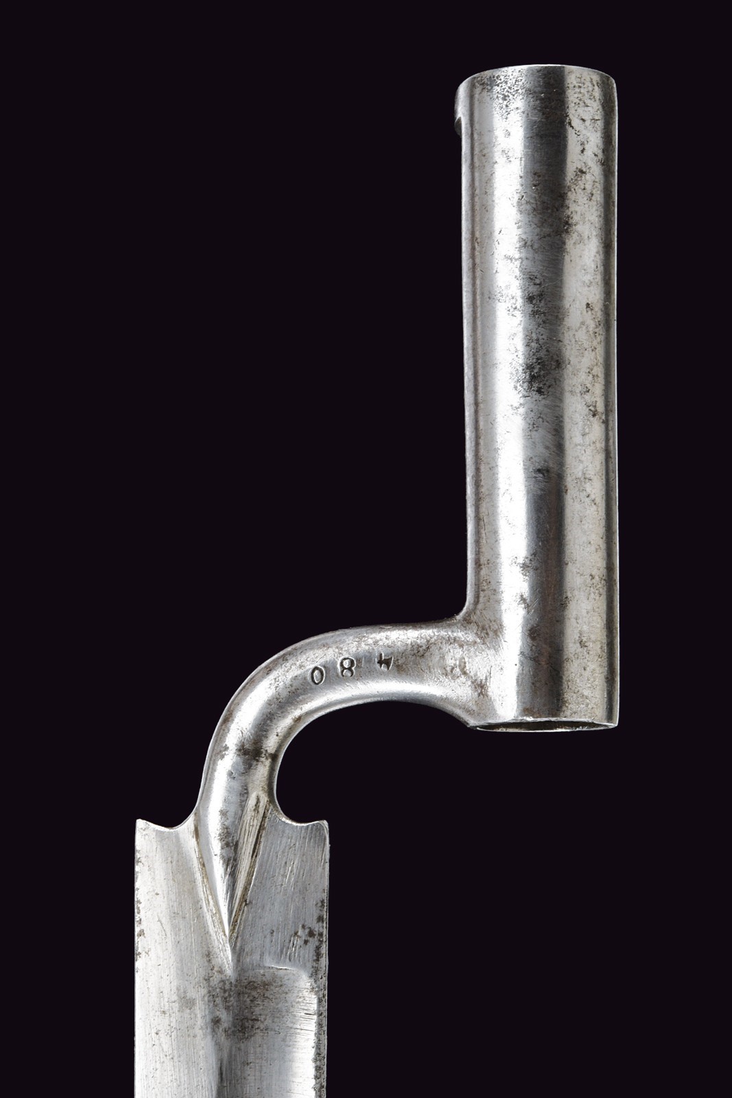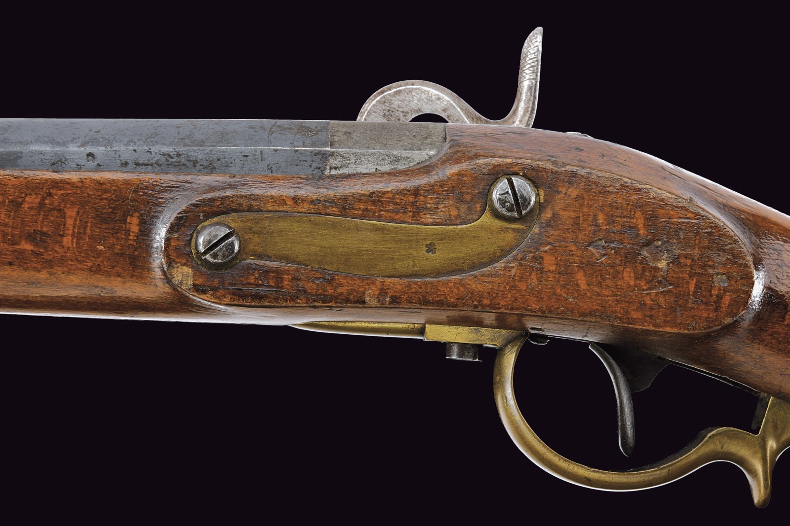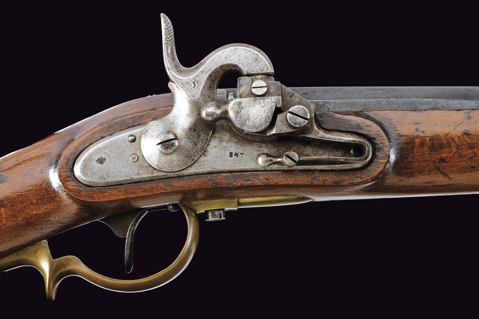 Rifled, 18 mm cal. barrel (bore with some pitting but clearly visible rifling), octagonal at the first part with sun mark and another not clearly legible marking, then round towards the nozzle with clutch for the bayonet; fixed rear sight with two folding leaves, foresight. Smooth tang. Augustin system lock, dated “847” and featuring the Imperial eagle. Wooden full stock with various marks and patchbox. Complete with Laukart bayonet featuring several marks and with scabbard. Leather shoulder strap and three small cleaning tools included.