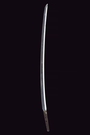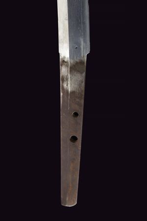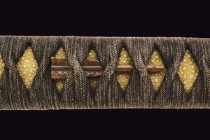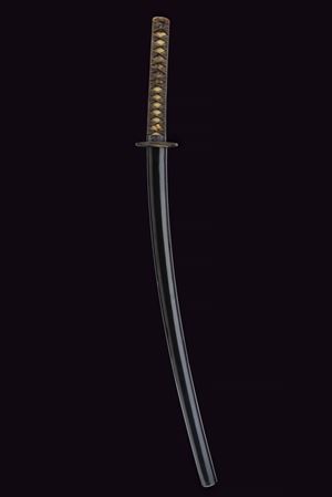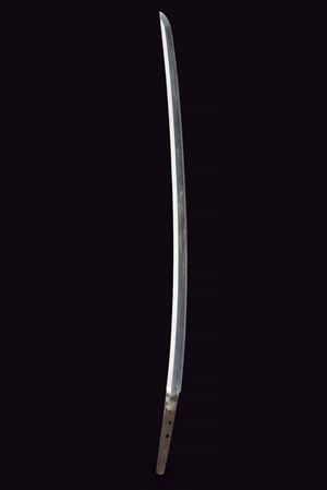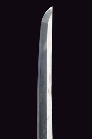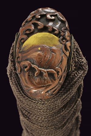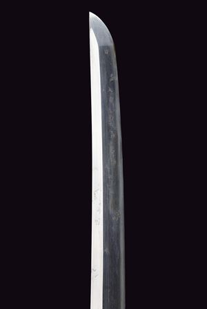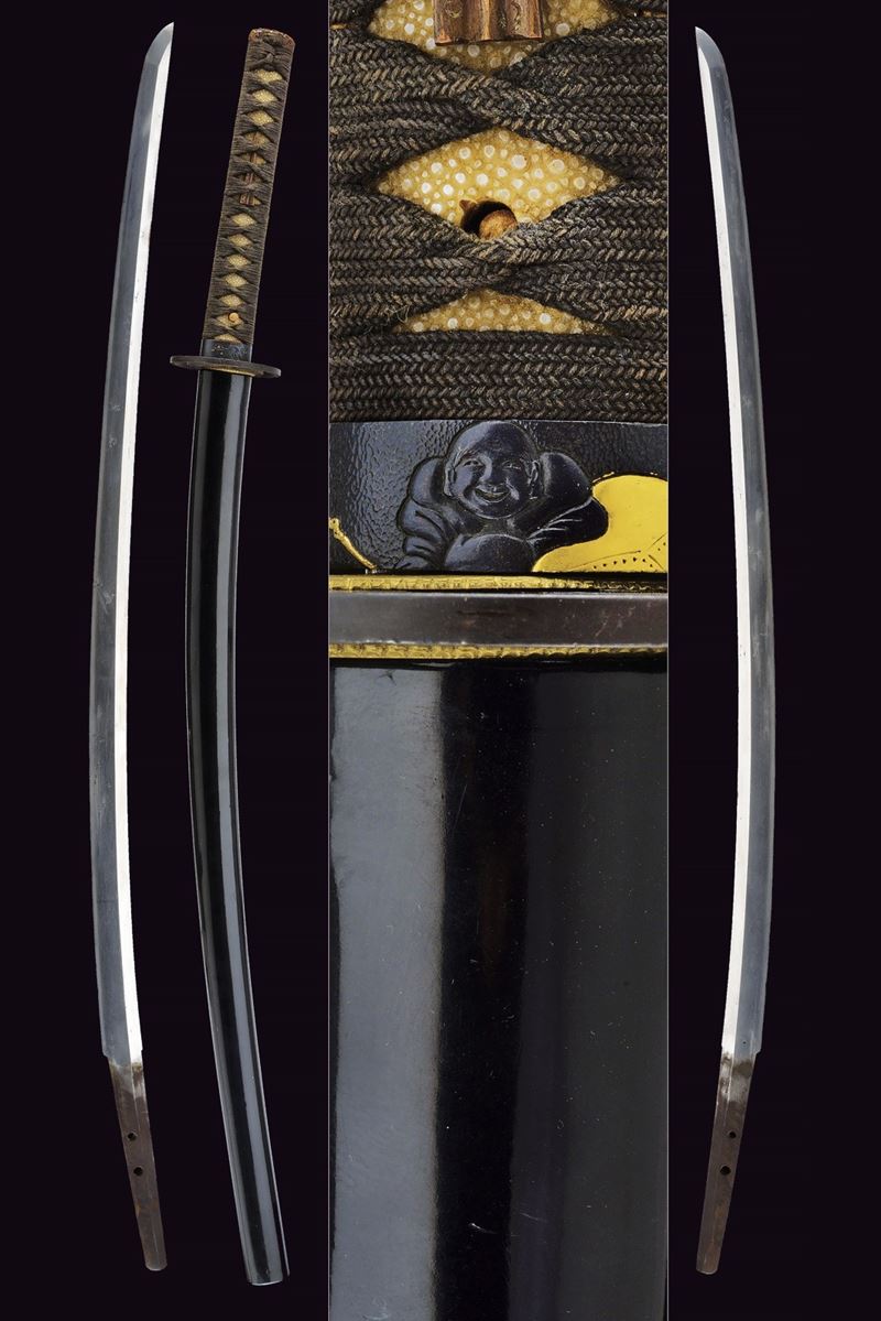 Shinogi-zukuri blade, Iori-mune (Nagasa 67.7 cm), hamon only faintly visible. Nakago with two Mekugi-ana. Mu-mei. Some pitting. Habaki in silver-colored metal. Composite Koshirae (20th century, with some possibly older elements). Maru-gata Tsuba in iron. Fine Fuchi-Kashira in irogane: one in dark metal depicting a figure and a pine tree with gilt highlights, the other in relief in bronze-colored metal, showing a rising golden sun over ocean waves. Tsuka wrapped in aged green fabric, showing signs of use and time, with Samé (stingray skin). Menuki in bronze-colored irogane, shaped as fans. Glossy, black-lacquered saya.