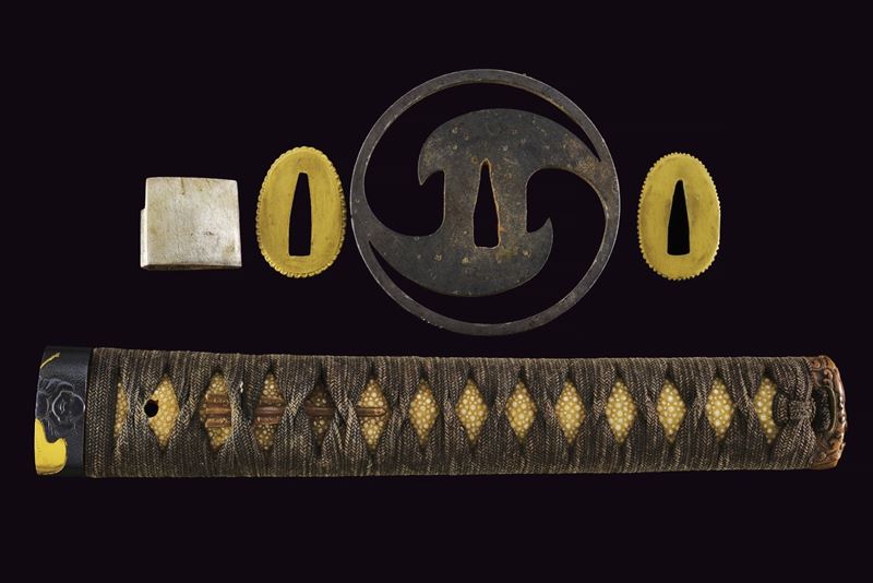 Shinogi-zukuri blade, Iori-mune (Nagasa 67.7 cm), hamon only faintly visible. Nakago with two Mekugi-ana. Mu-mei. Some pitting. Habaki in silver-colored metal. Composite Koshirae (20th century, with some possibly older elements). Maru-gata Tsuba in iron. Fine Fuchi-Kashira in irogane: one in dark metal depicting a figure and a pine tree with gilt highlights, the other in relief in bronze-colored metal, showing a rising golden sun over ocean waves. Tsuka wrapped in aged green fabric, showing signs of use and time, with Samé (stingray skin). Menuki in bronze-colored irogane, shaped as fans. Glossy, black-lacquered saya.