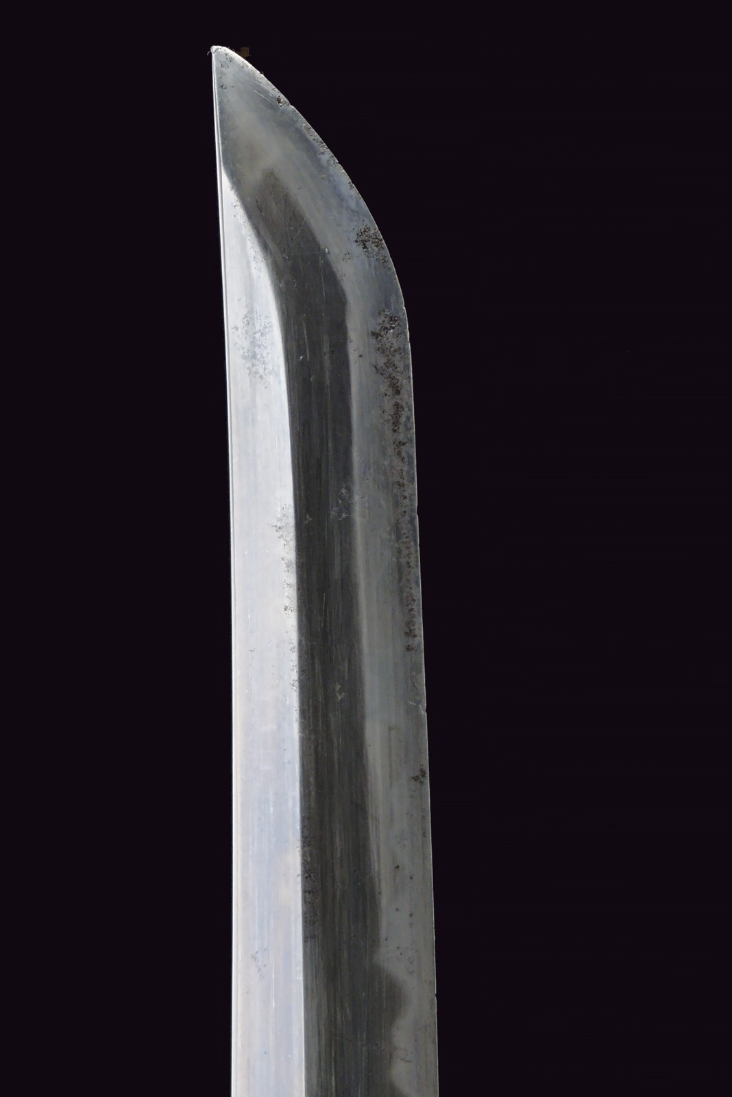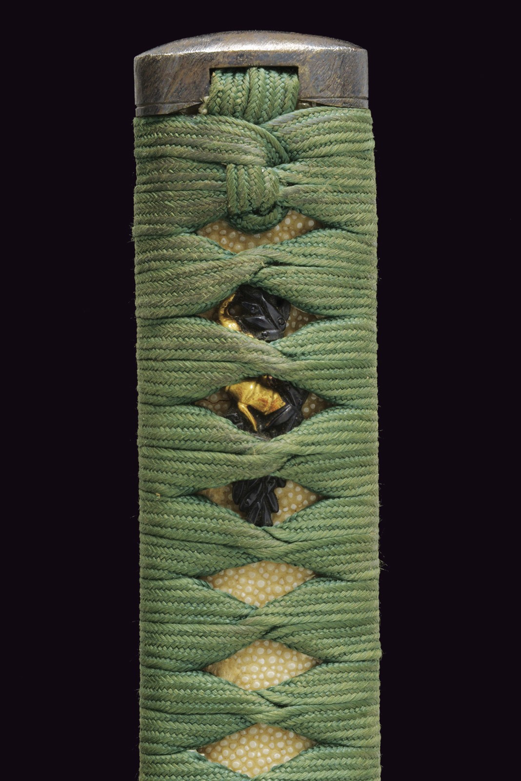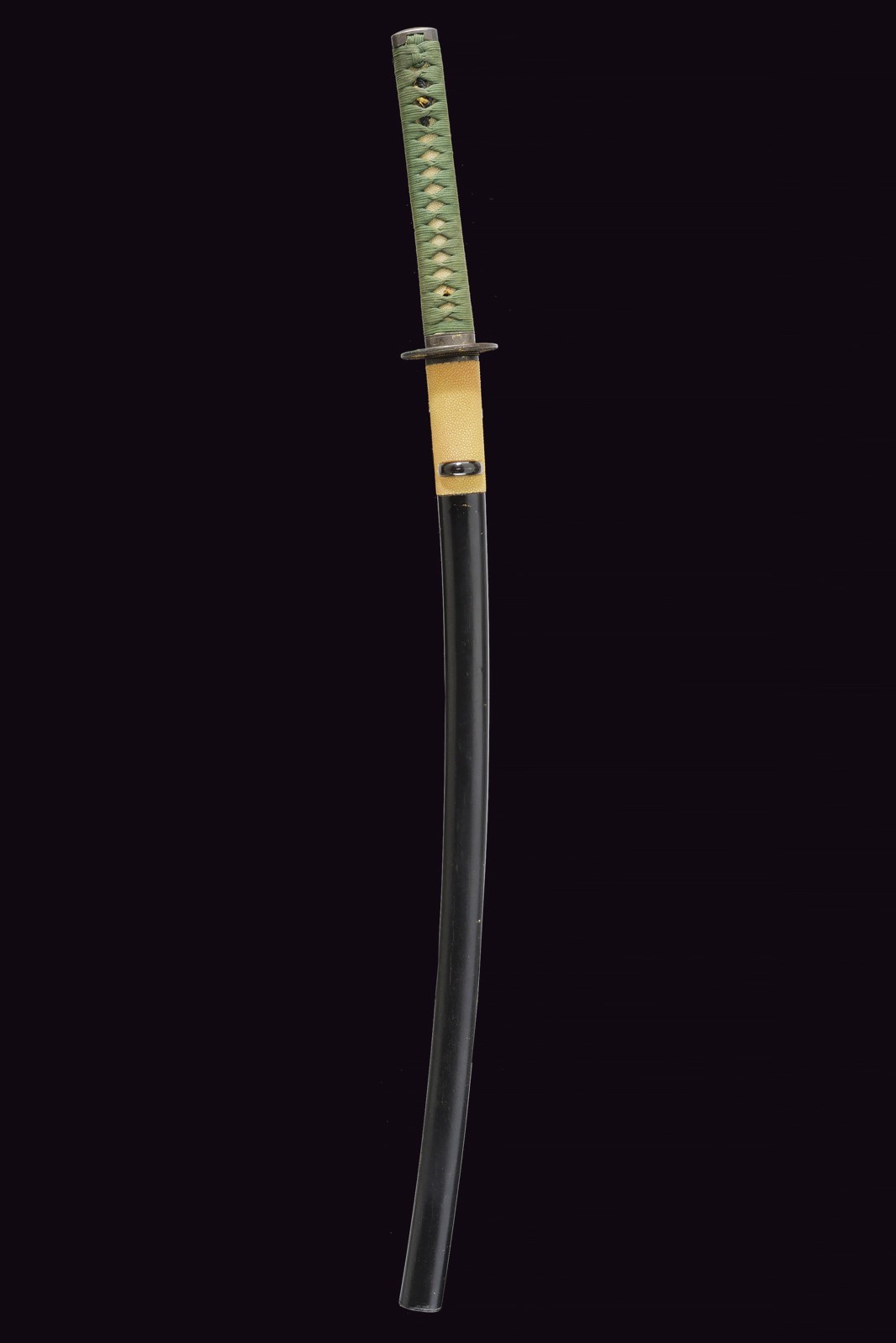 Blade (Nagasa of 65.7 cm) with visible hamon and hada. Nakago mei ‘Noshu Seki Maekawa Kane Tsugu Saku Kore’, with a mekugi-ana. Brass habaki with remains of silvering. Koshirae with beautiful tsuba, fuchi-kashira of simple workmanship and fine menuki. Tsuka-ito in green silk. Saya in black lacquered wood. The mekugi is missing. Showa-era blade, circa 1930, the koshirae from the late Edo period.