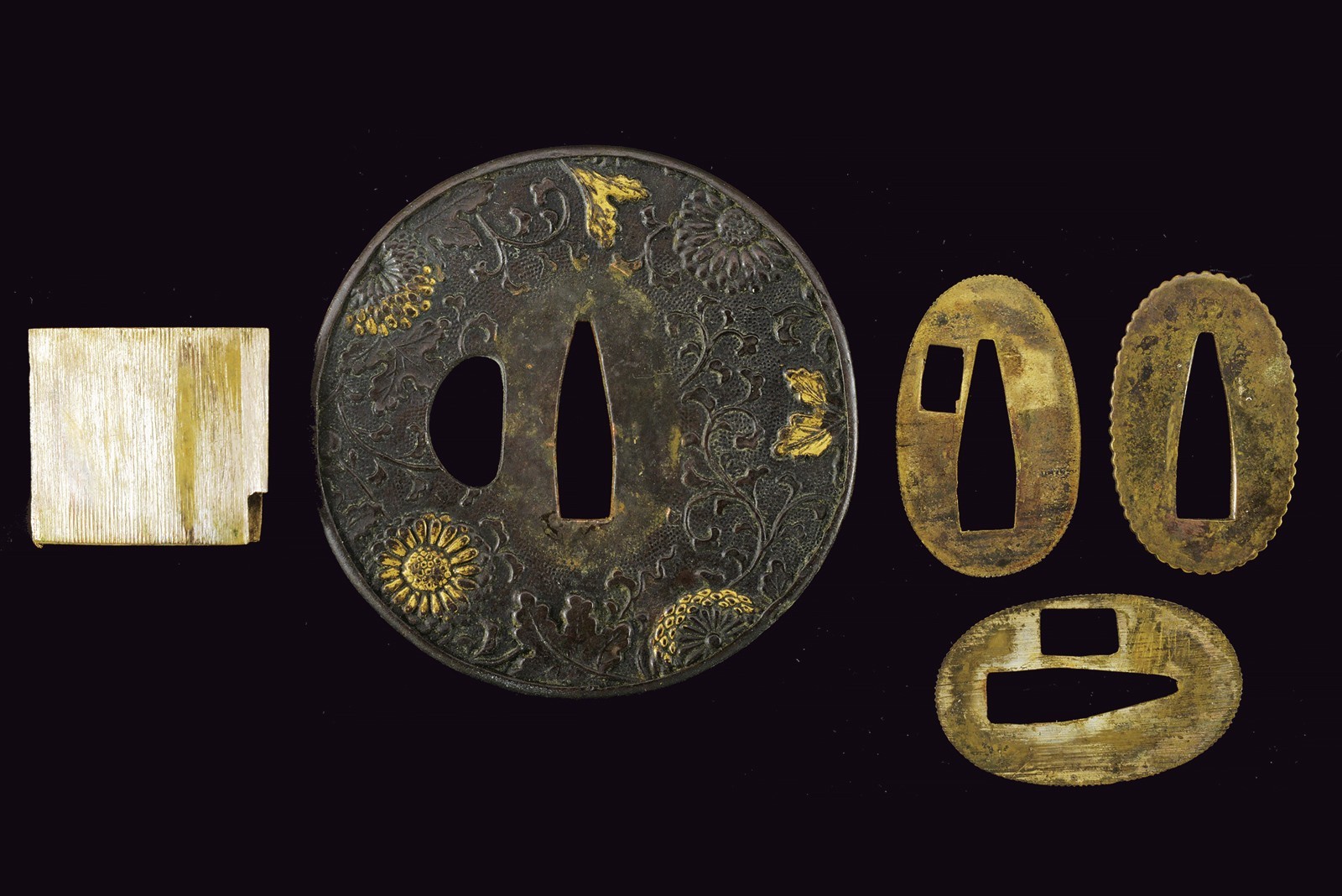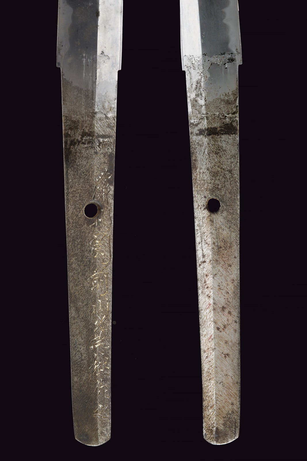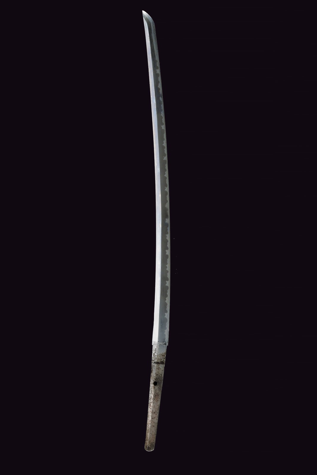 Blade (Nagasa of 65.7 cm) with visible hamon and hada. Nakago mei ‘Noshu Seki Maekawa Kane Tsugu Saku Kore’, with a mekugi-ana. Brass habaki with remains of silvering. Koshirae with beautiful tsuba, fuchi-kashira of simple workmanship and fine menuki. Tsuka-ito in green silk. Saya in black lacquered wood. The mekugi is missing. Showa-era blade, circa 1930, the koshirae from the late Edo period.