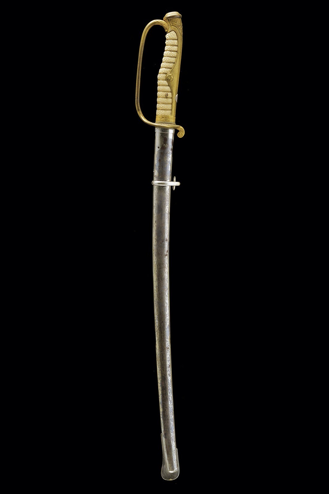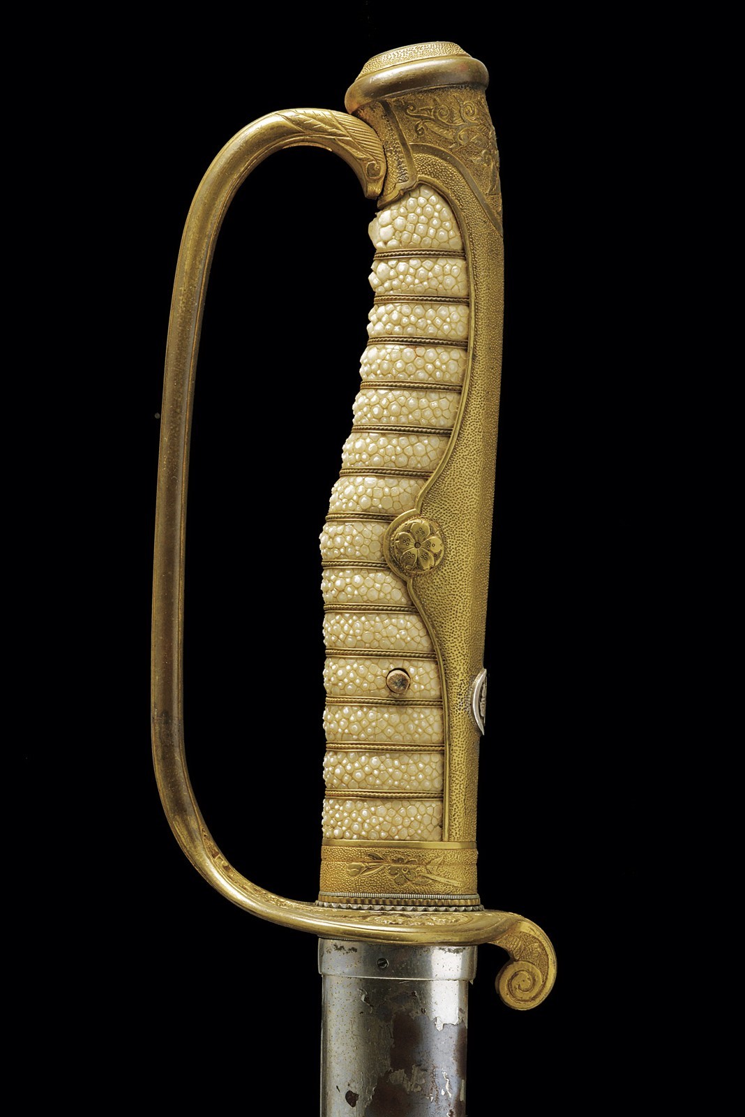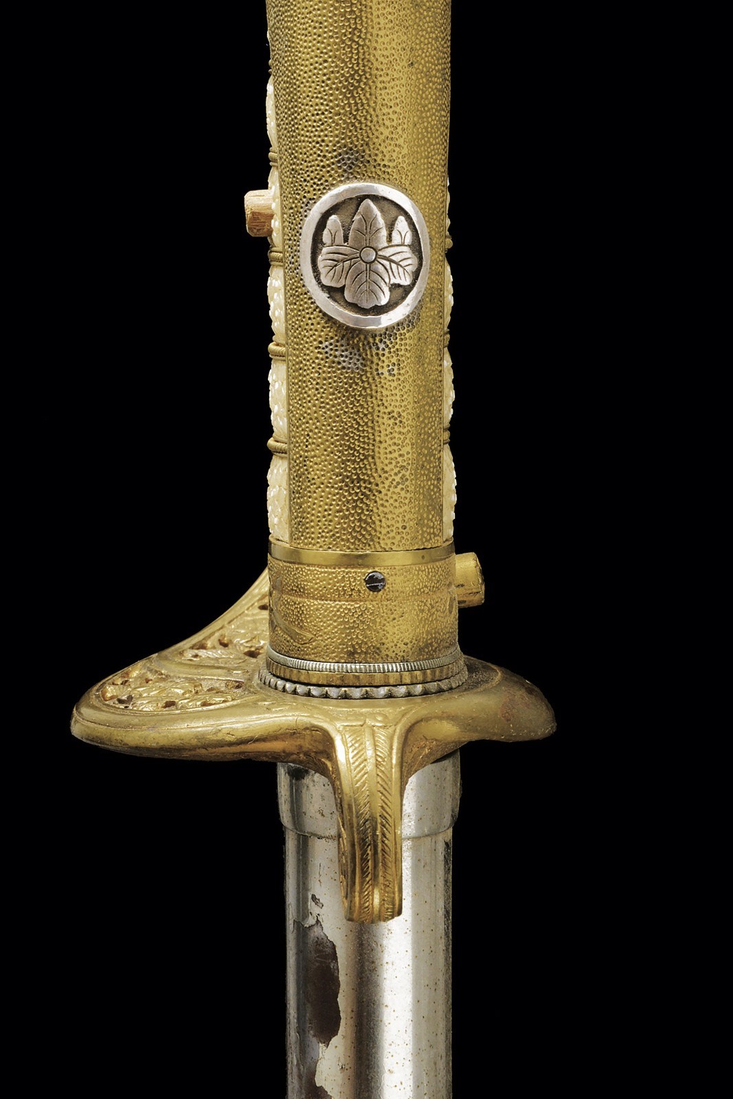 Shinogi zukuri blade (nagasa 58.3 cm). Hamon: suguha nioi deki ko-nie. Boshi midare komi. Hada: itame. Nakago with two mekugi-ana. Mei: Echizen kuni ju Shimosaka. End of Momoyama - beginning of Shinto era. Koshirae kyu for parade, from the beginning of the 20th century. Gilded, brass hilt, sabre-type, with partially pierced guard, cherry blossom drawings, partially relieved. Cap with kiri-mon applied in silver (used by various important families). Tsuka covered with fish skin and metallic, European style wire binding. Iron scabbard with remains of nickel-plating.