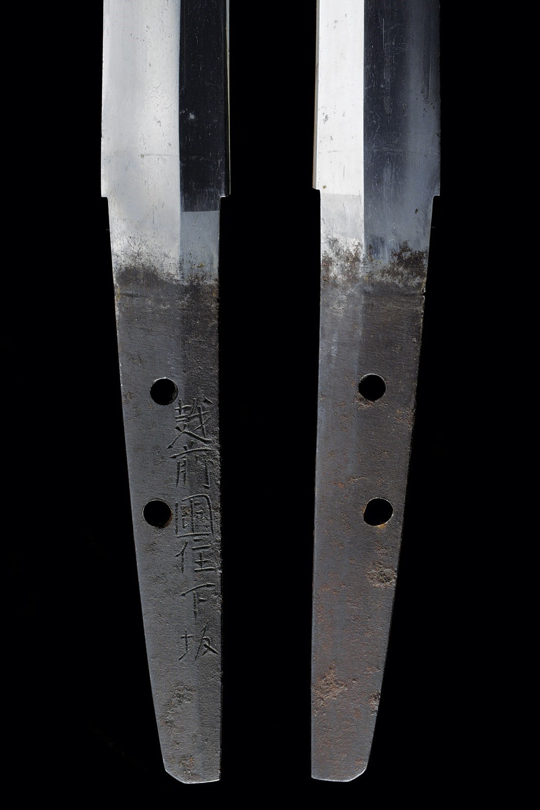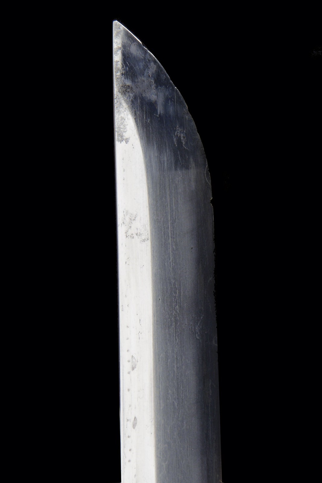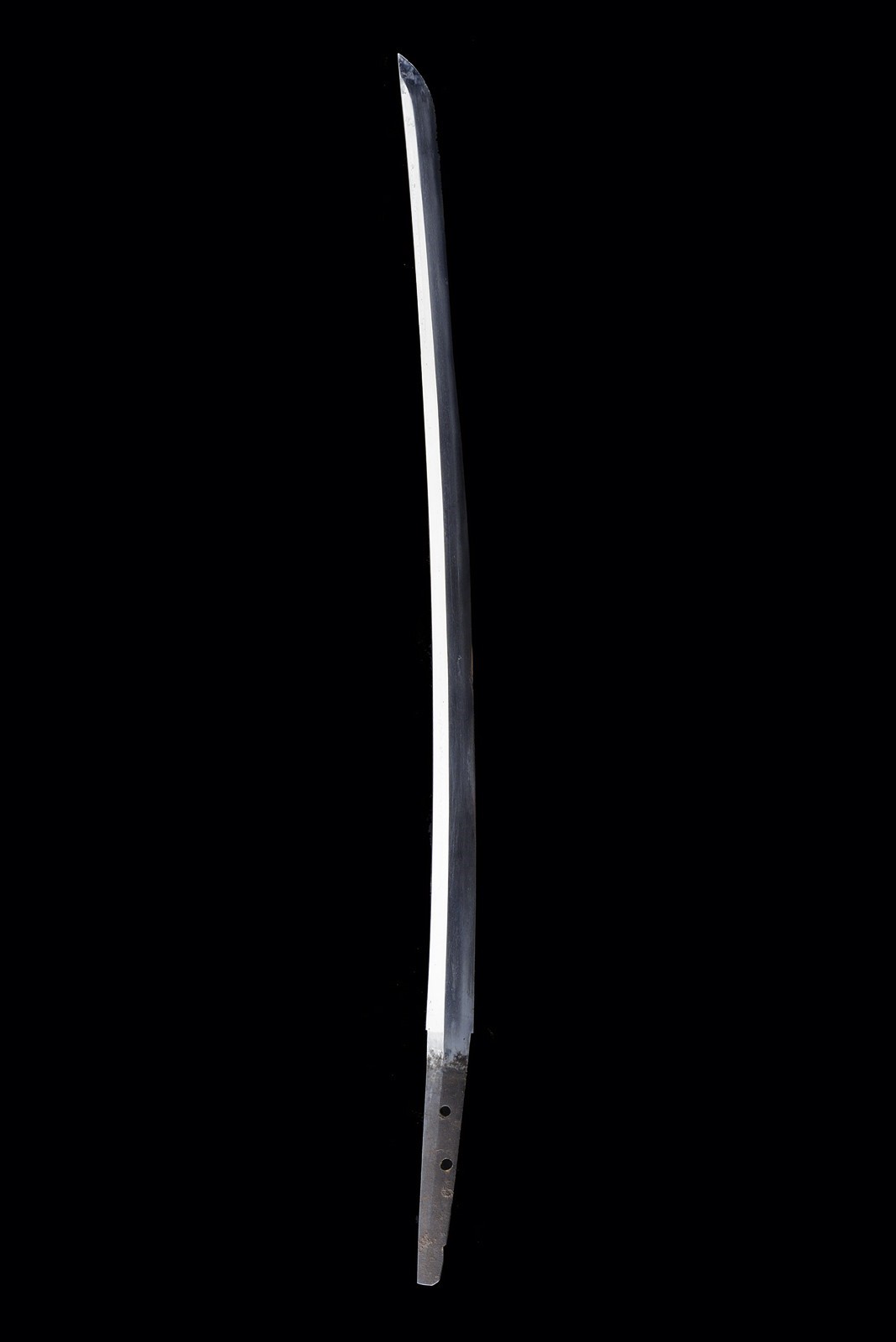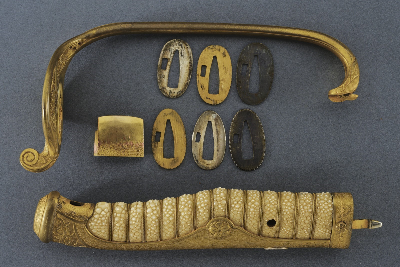 Shinogi zukuri blade (nagasa 58.3 cm). Hamon: suguha nioi deki ko-nie. Boshi midare komi. Hada: itame. Nakago with two mekugi-ana. Mei: Echizen kuni ju Shimosaka. End of Momoyama - beginning of Shinto era. Koshirae kyu for parade, from the beginning of the 20th century. Gilded, brass hilt, sabre-type, with partially pierced guard, cherry blossom drawings, partially relieved. Cap with kiri-mon applied in silver (used by various important families). Tsuka covered with fish skin and metallic, European style wire binding. Iron scabbard with remains of nickel-plating.