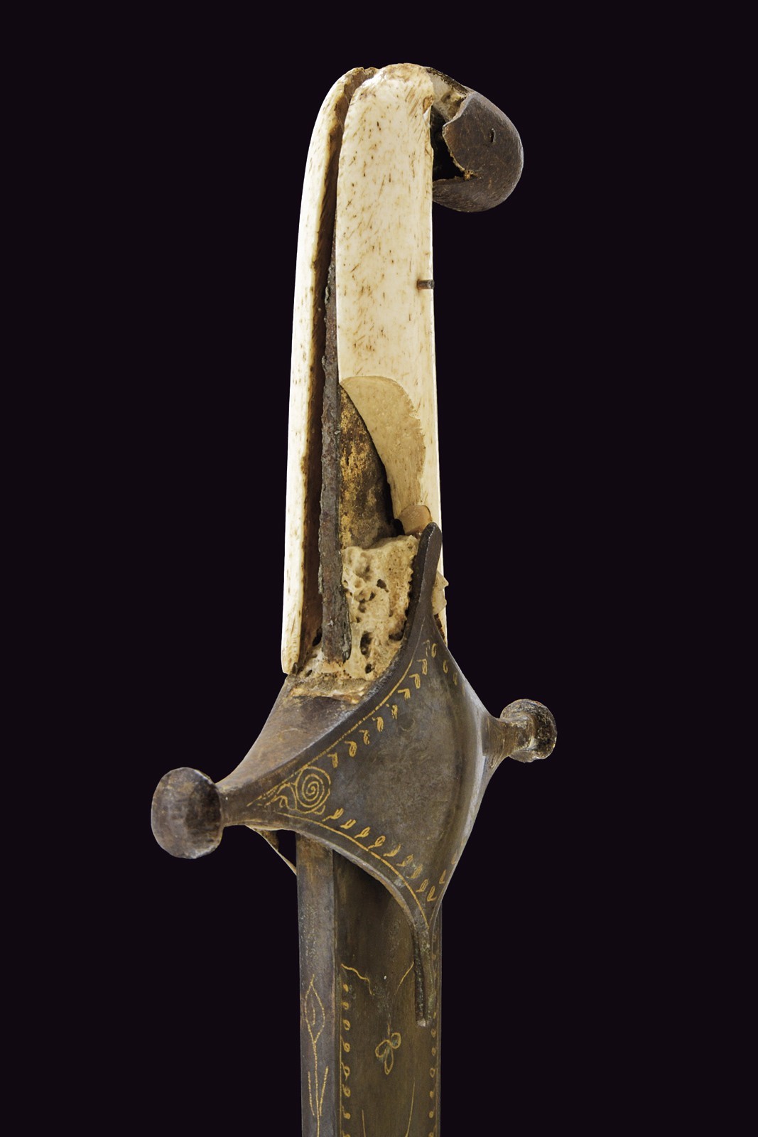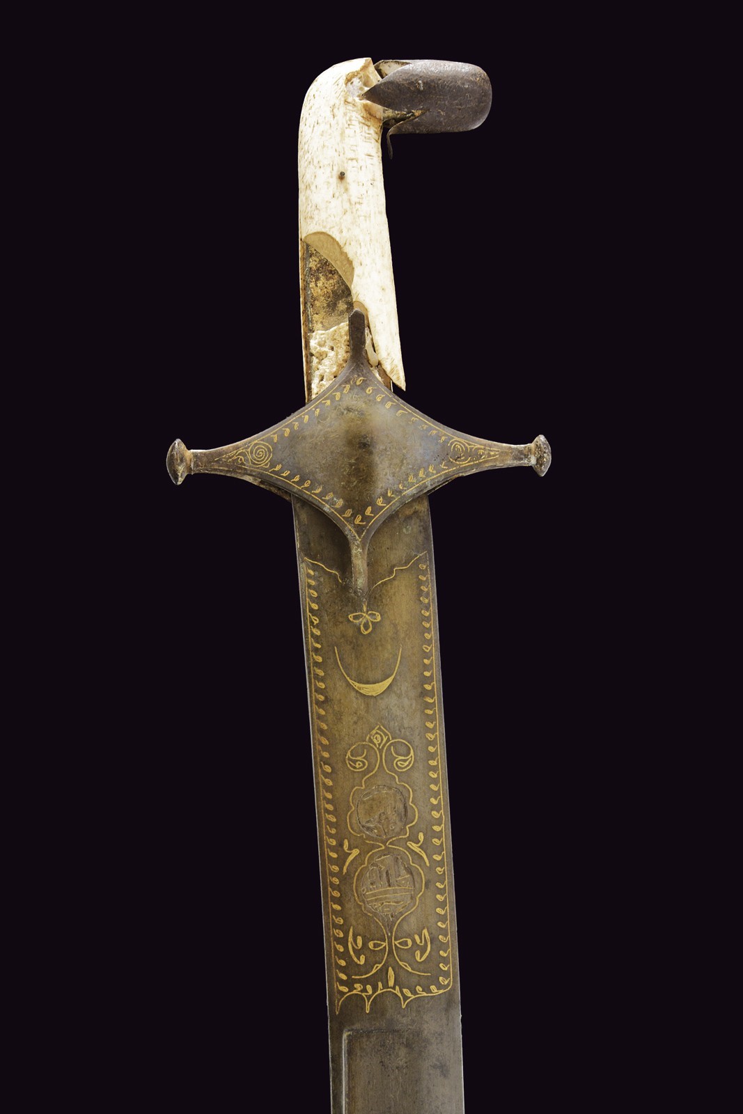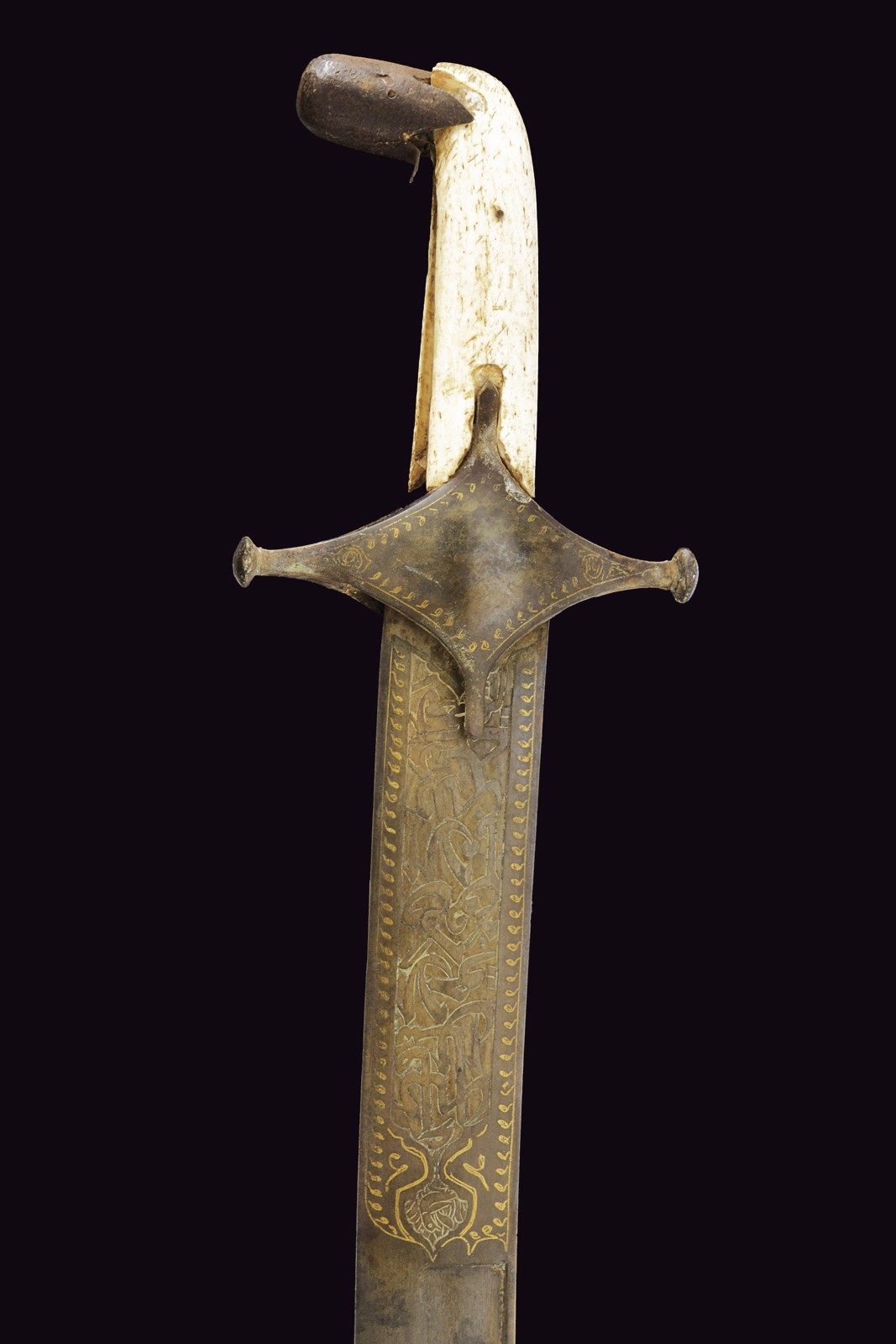 Curved, single-edged blade with jelmann, in fine Wootz damask, with a groove along part of the spine. On one side of the tang is the inscription ‘La hawla wa la quwwata illa Billah al layul azim’ ‘There is no power except from Allah’. On the other side, a cartouche with a stylised lion, typical of Assad Allah's production; all surrounded by decorations and small frames inlaid with gold. Typical Damascus guard, also with small gold frames; pistol-shape handle with camel bone cheeks (missing parts and defects).