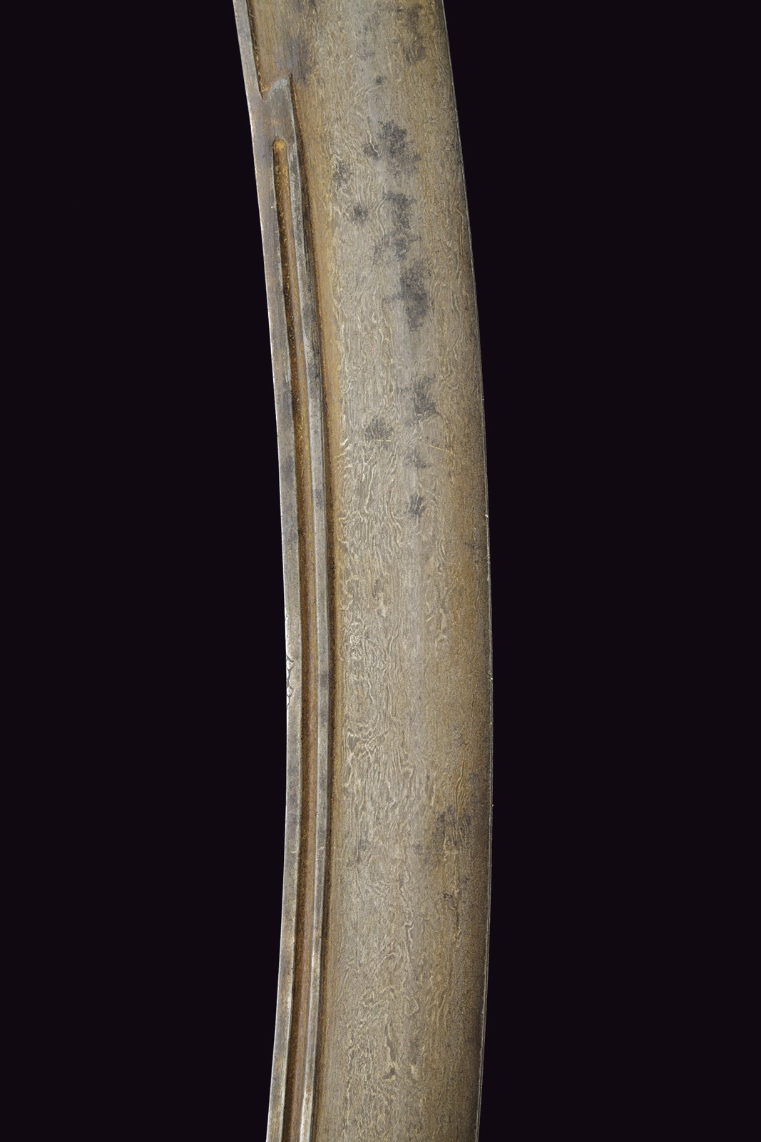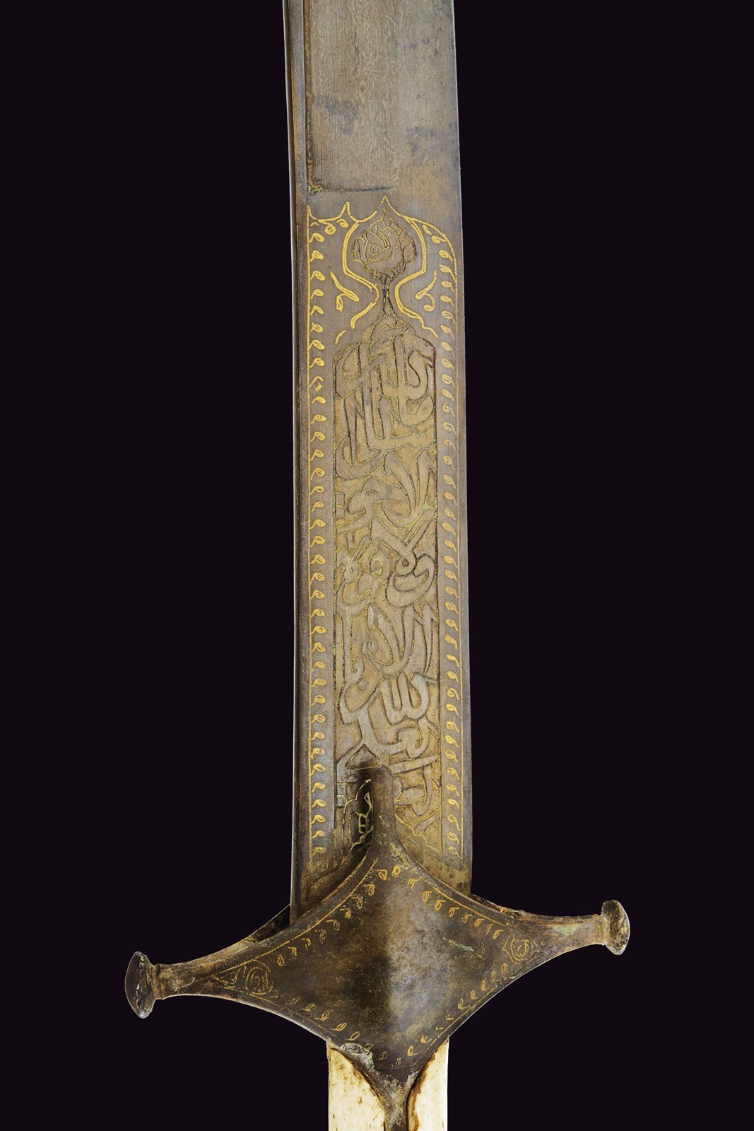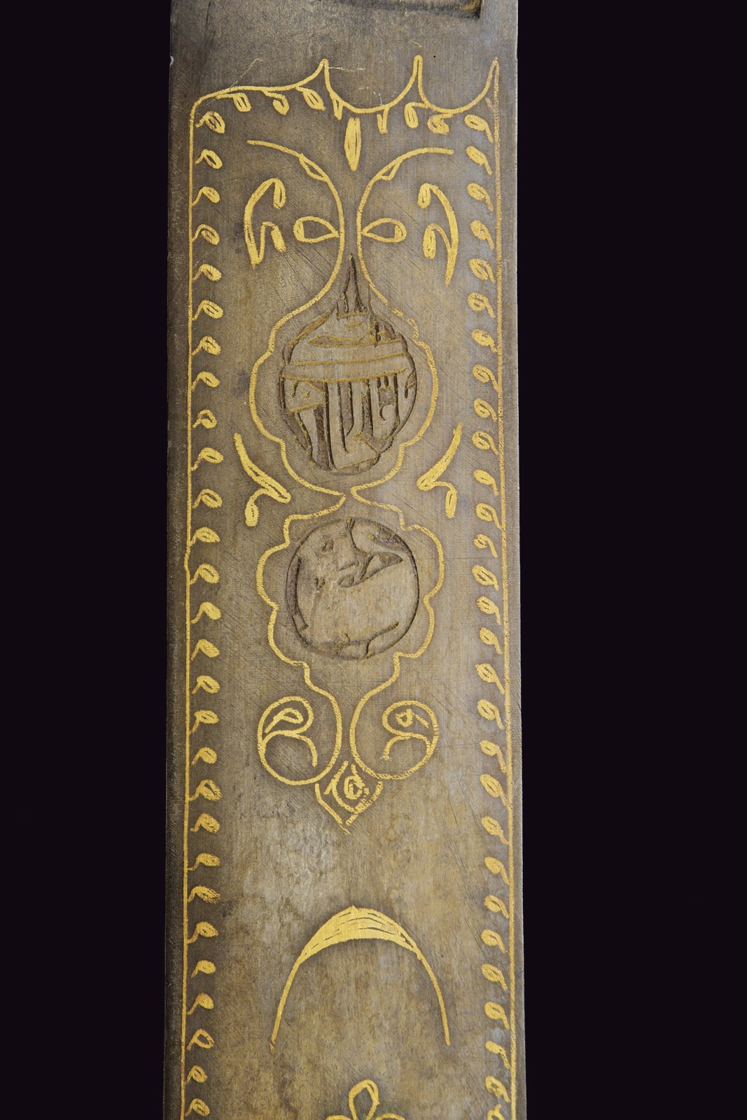 Curved, single-edged blade with jelmann, in fine Wootz damask, with a groove along part of the spine. On one side of the tang is the inscription ‘La hawla wa la quwwata illa Billah al layul azim’ ‘There is no power except from Allah’. On the other side, a cartouche with a stylised lion, typical of Assad Allah's production; all surrounded by decorations and small frames inlaid with gold. Typical Damascus guard, also with small gold frames; pistol-shape handle with camel bone cheeks (missing parts and defects).