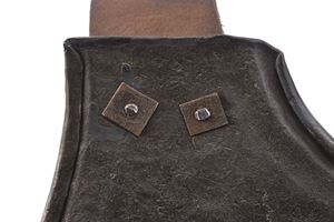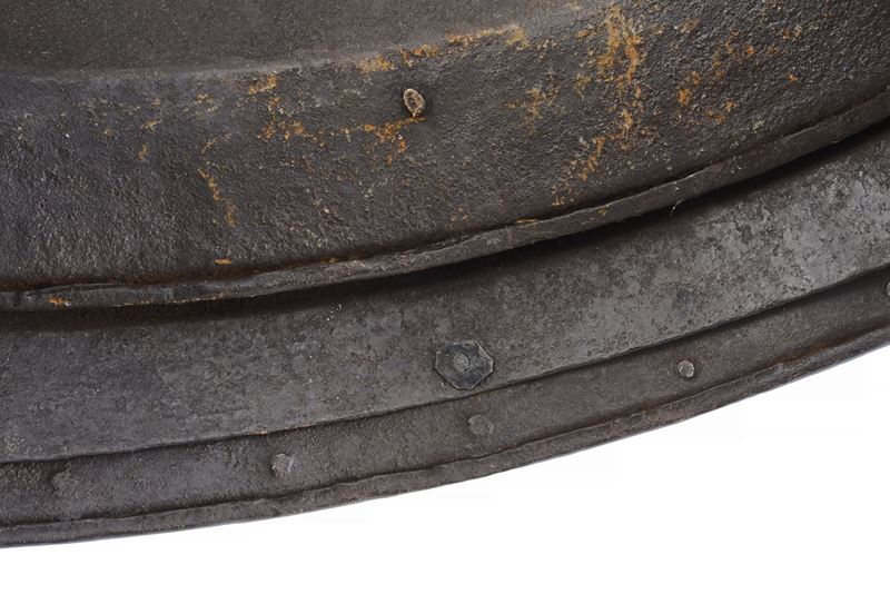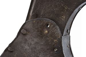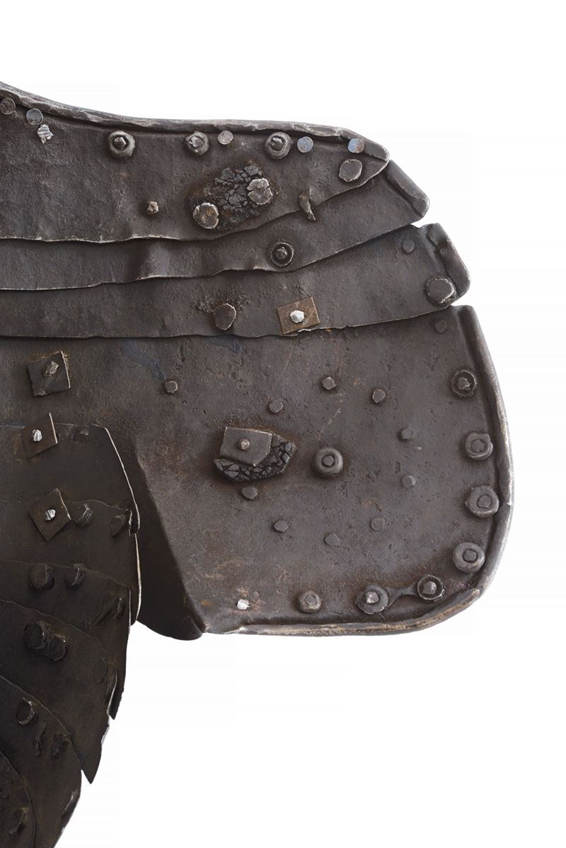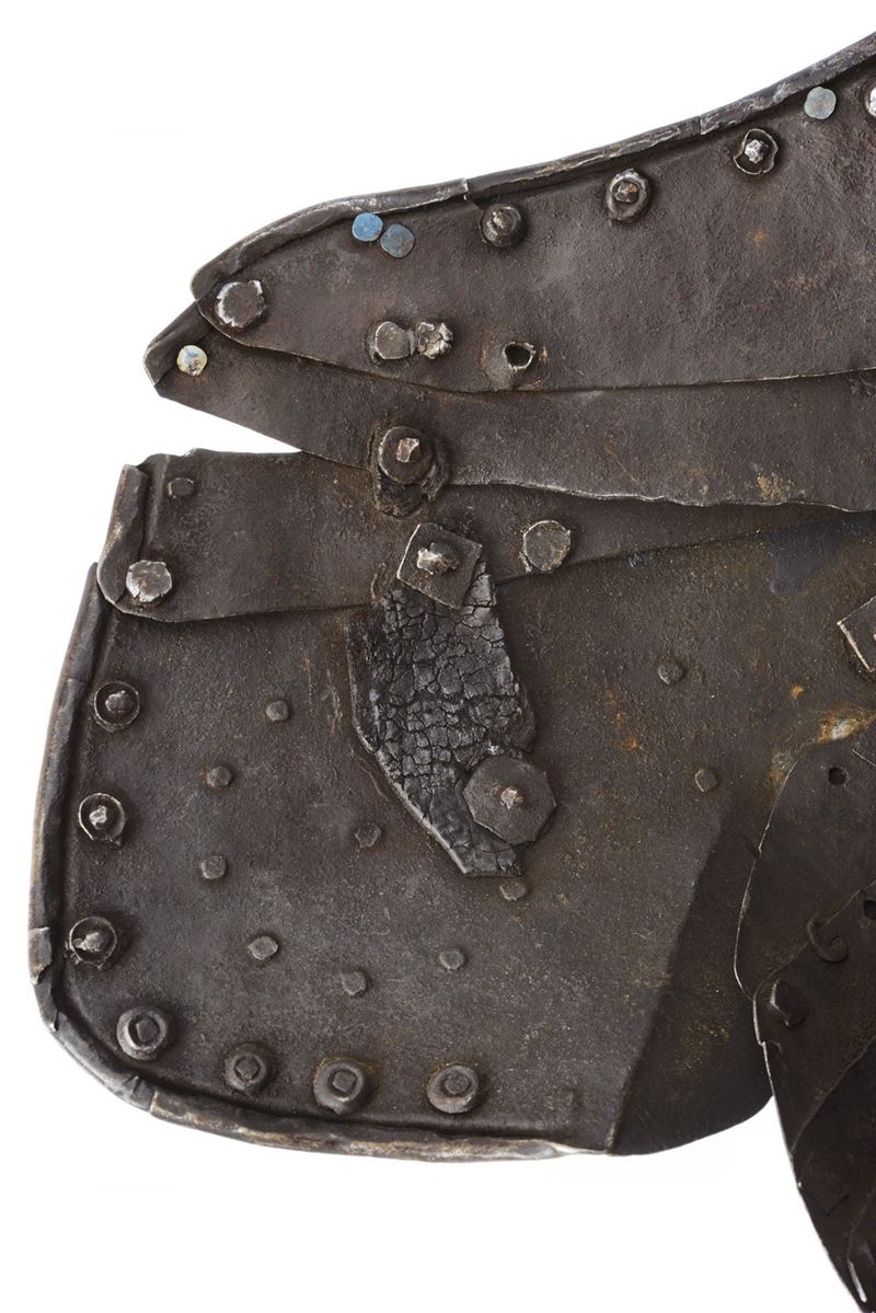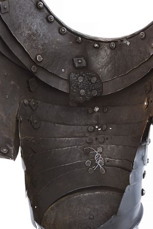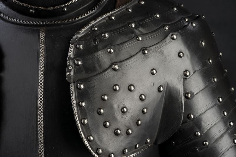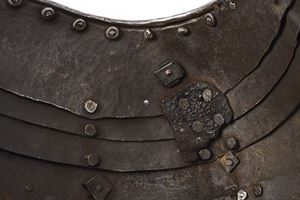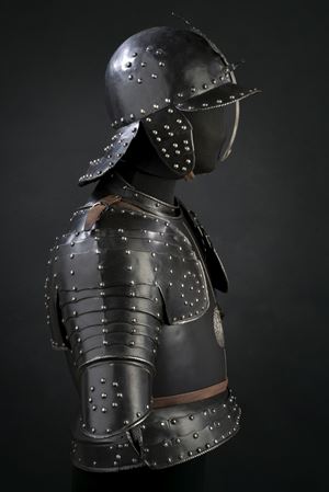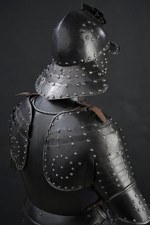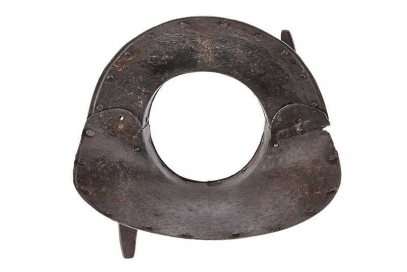 Shrimp-tail capeline with rounded skull and ribbed in the centre, two halves joined by rivets. The round frontal brim in one piece with the skull itself is ribbed and worked with notch decorations, with a row of rivets next to the outer border. In the centre, the sliding nosepiece with a beautiful carved and pierced floral top frieze. The stop complete with wingnut screw. The row of rivets, also made of iron, at the base of the skull with remains of old leather strings or fabric lining. The plated cheekpieces, with unroped edges, mounted by rivets on a leather-shaped patch. Three-plated nape-guard, the first is part of the skull, the other two fixed with rivets. Remains of fabric also here. The upper edges of the nape-guard plates with shaped staple borders and double outlines. Inside the helmet, a fine earlier patina. The last plate with hemmed edge with notch decoration. Only one small more recent repair to the inner borders of a nape-guard plate. Two-plated, one-piece neck-collar with neckline. This one with roped border. The outer margin with smooth borders is not roped. Decorated with double outlines. The interior with fine earlier patina and slight traces of leather strings under the rivets. Elegant light breastplate ribbed in the centre, blackened like the rest of the elements, except for the beautiful central medallion engraved to depict the Virgin Mary crushing a dragon (which represents the Devil) surrounded by spirals. The central ribbing, which is also checkered, the beautiful roped cords of the neckline and gussets are also left in the natural metal colour. The double-edged brim is decorated with festooned staple borders and rows of rivets. The lower edge with rope en suite with the other elements. On the back various fragments of old or even earlier lining and leather strings. Apparently only four rivets replaced later. Also here fine old brown patina inside. Backplate with roped cords and simple outlines, two-plated backpiece with straight borders. On the bottom decorative cord. Half brassards with cusped festooned borders and decorated with remains of double outlines. Roped outer borders. The rivets appear to be almost all old, apart from a few replacements in one arm. Black paint refreshed in recent times. Probably Polish (where the Marian cult is particularly popular and Mary is the patron saint) or Hungarian. Elegant and impressive.