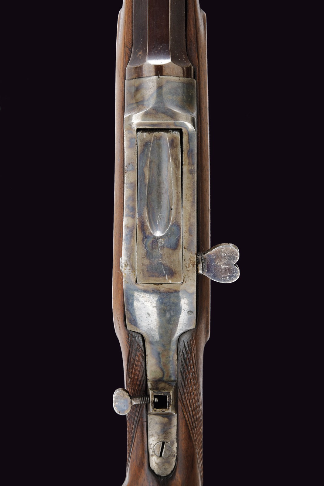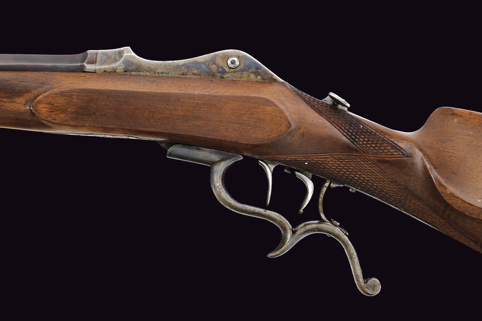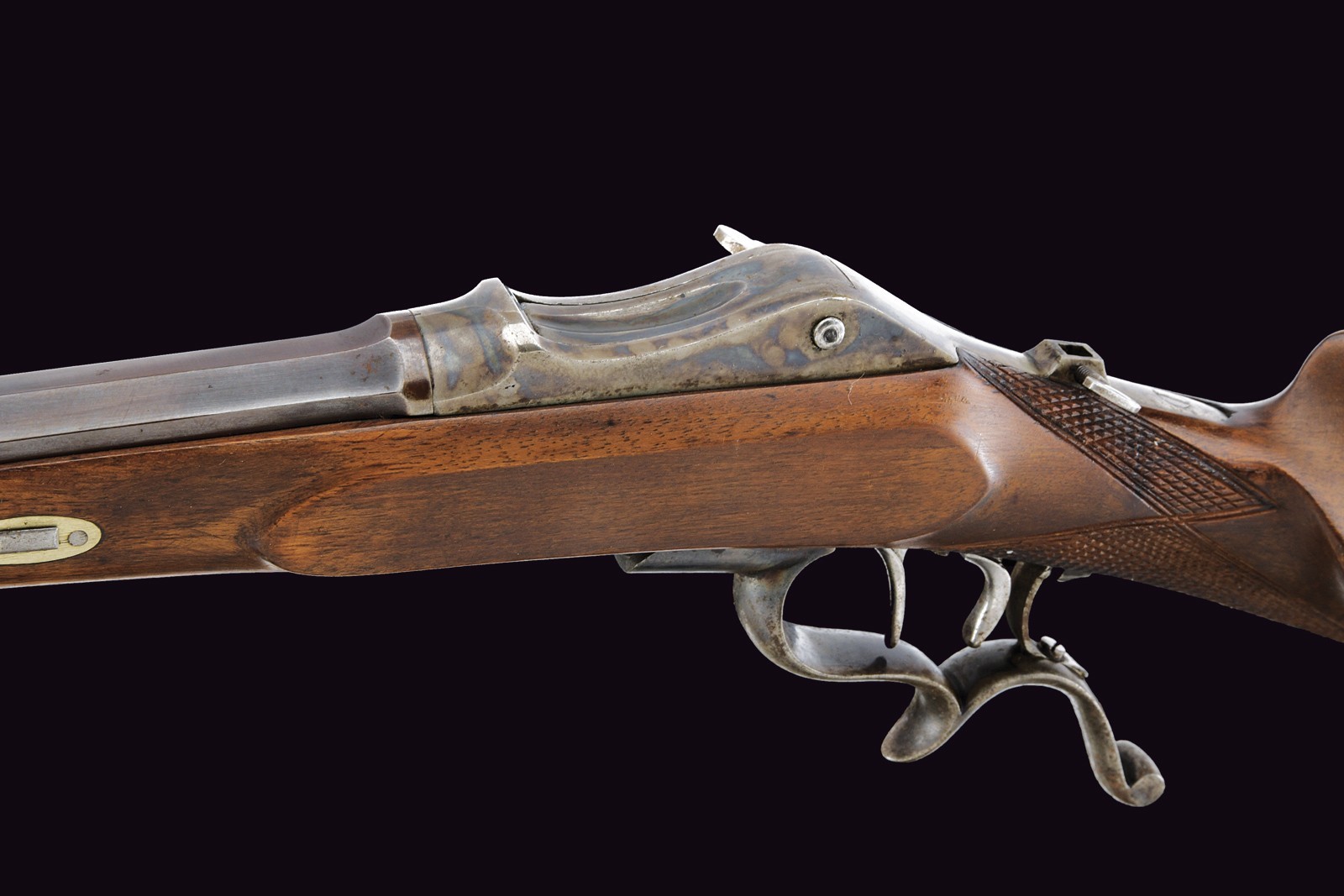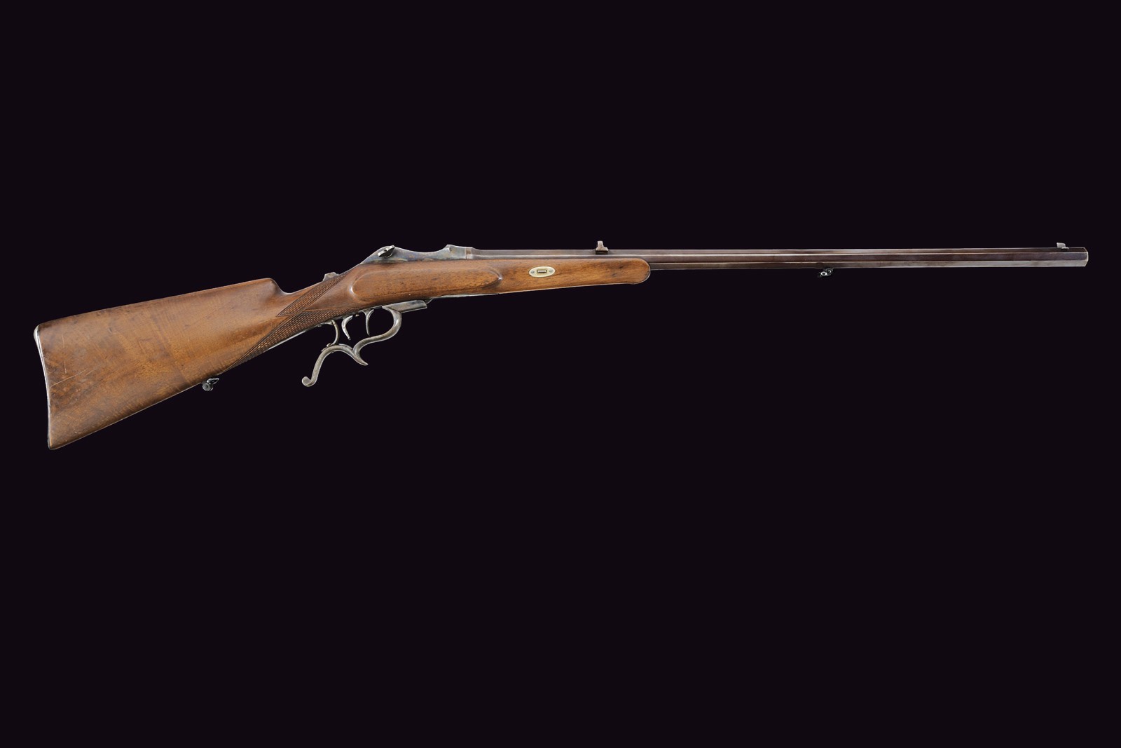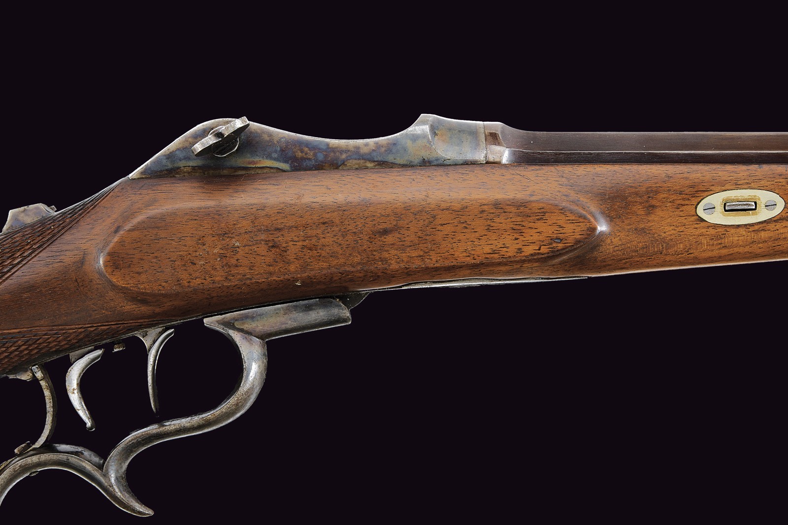 Rifled, octagonal, browned 10.5 mm cal barrel (clean bore, well visible rifling) with rear and front sights. Iron frame with visible traces of case-hardening, working Martini-type action. Lower lever integrated with the ergonomic trigger guard. Set trigger. Tang fitted with a threaded insert for a diopter sight, now missing. Well preserved half wooden stock with checkered handle. Iron buttplate with faint traces of case-hardening.