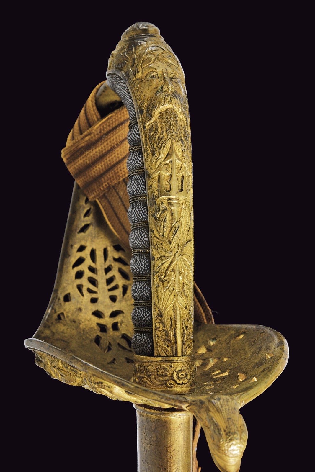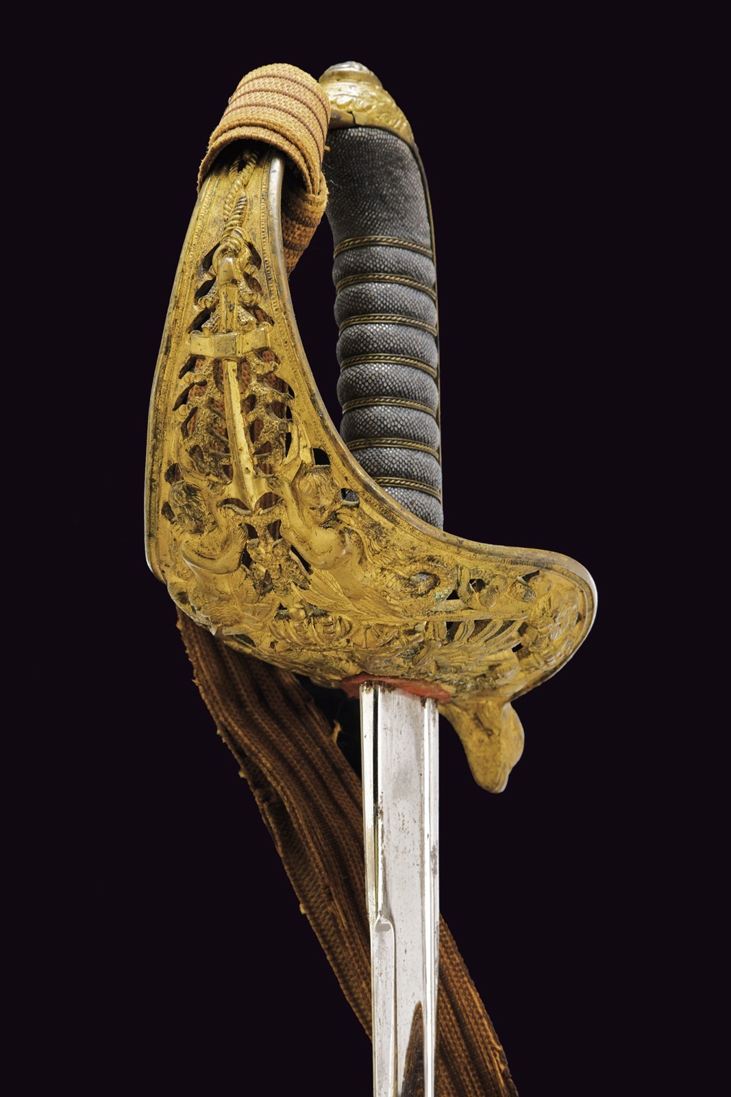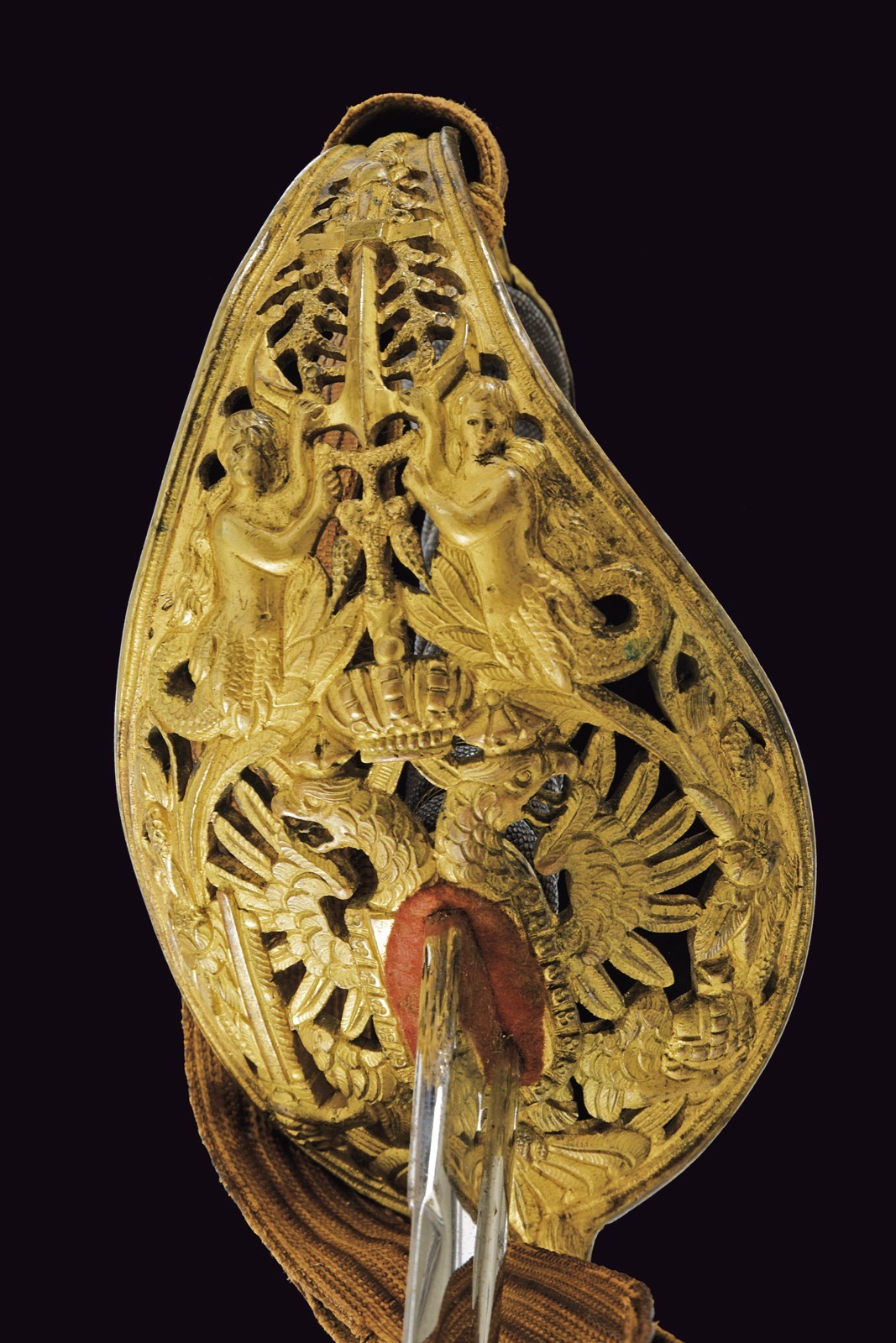 Slightly curved, single-and-a-half-edged blade, with thickened back, engraved on the right side with the Austrian imperial eagle and on the left side with the crowned anchor; on the tang: “JULIUS VOOS GARANTIE SOLINGEN.” Beautiful nickel finishing still present at about 80-90% with some stains due to pitting. Beautiful bronze hilt in typical Austrian style, with a large guard richly decorated in relief and openwork on the back, with the imperial eagle surmounted by mermaids holding an anchor, with corals and other nautical and maritime decorations. Short parry quillon with a dolphin head. Long cap with the face of Neptune and a trident in relief. Beautiful gilding preserved at about 70%. Handle with fish-skin covering and with brass wire binding. With its leather scabbard and mounts with relief decorations featuring remains of gilding. A fixed lug and a loop. Together with a sword-knot with obvious signs of use and age; the tassel with Austrian eagle and monogram “FJI.” The sword is in good/very good condition, with small signs of time.